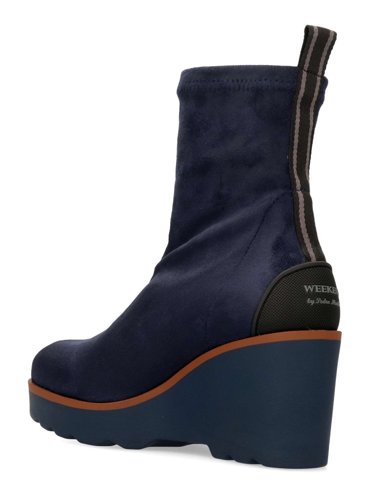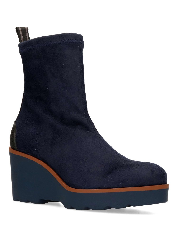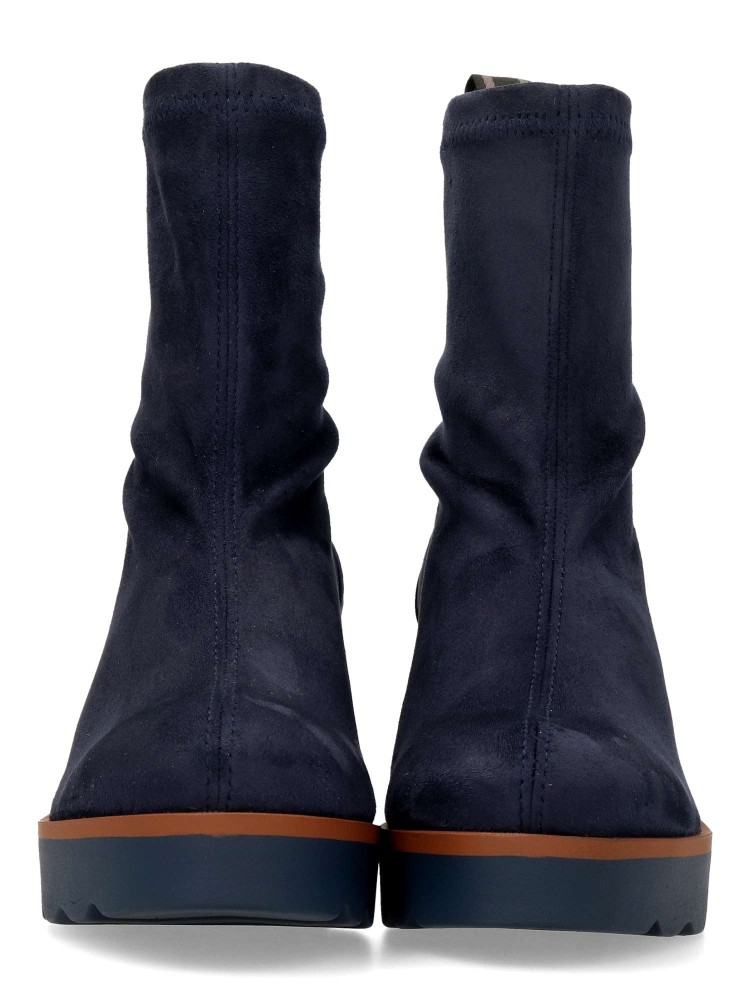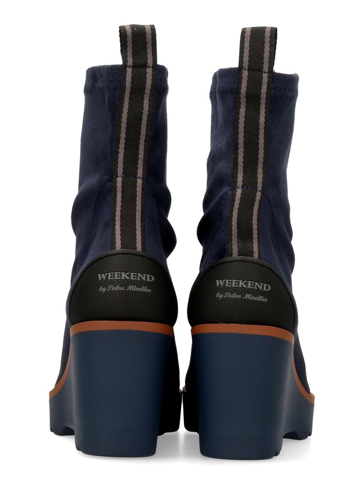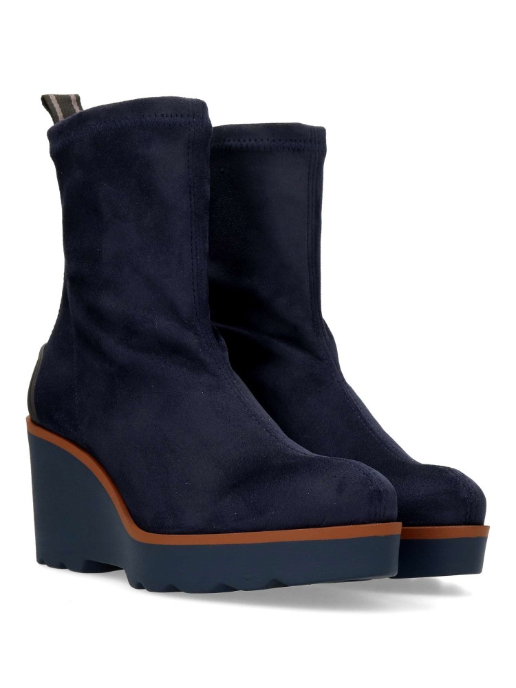 Botines de tejido elástico efecto ante de color azul marino. Su horma ancha garantiza un ajuste espacioso y agradable incluso después de horas de uso. Altura cuña 7 cm. Altura caña 15 cm. Básico y atemporal imprescindible en tu armario.