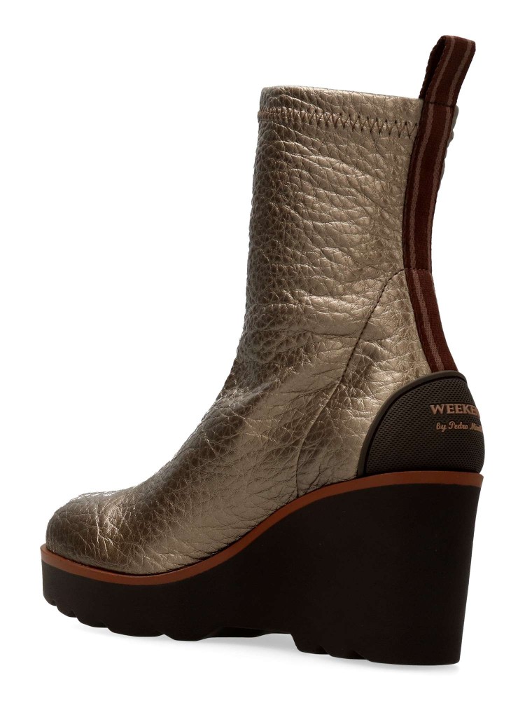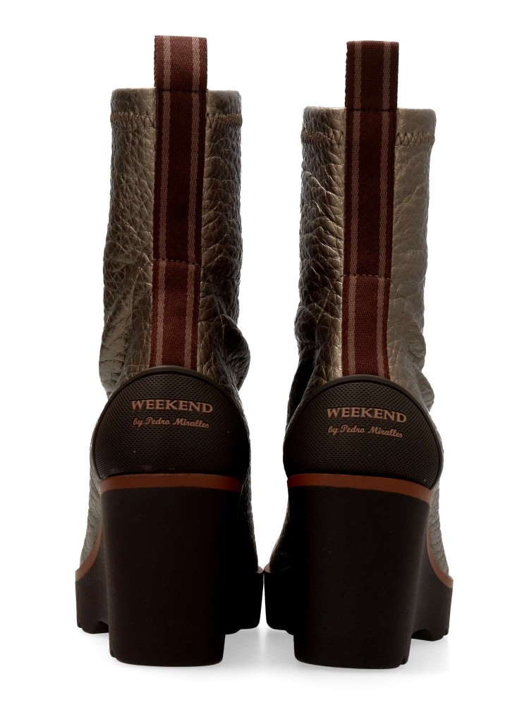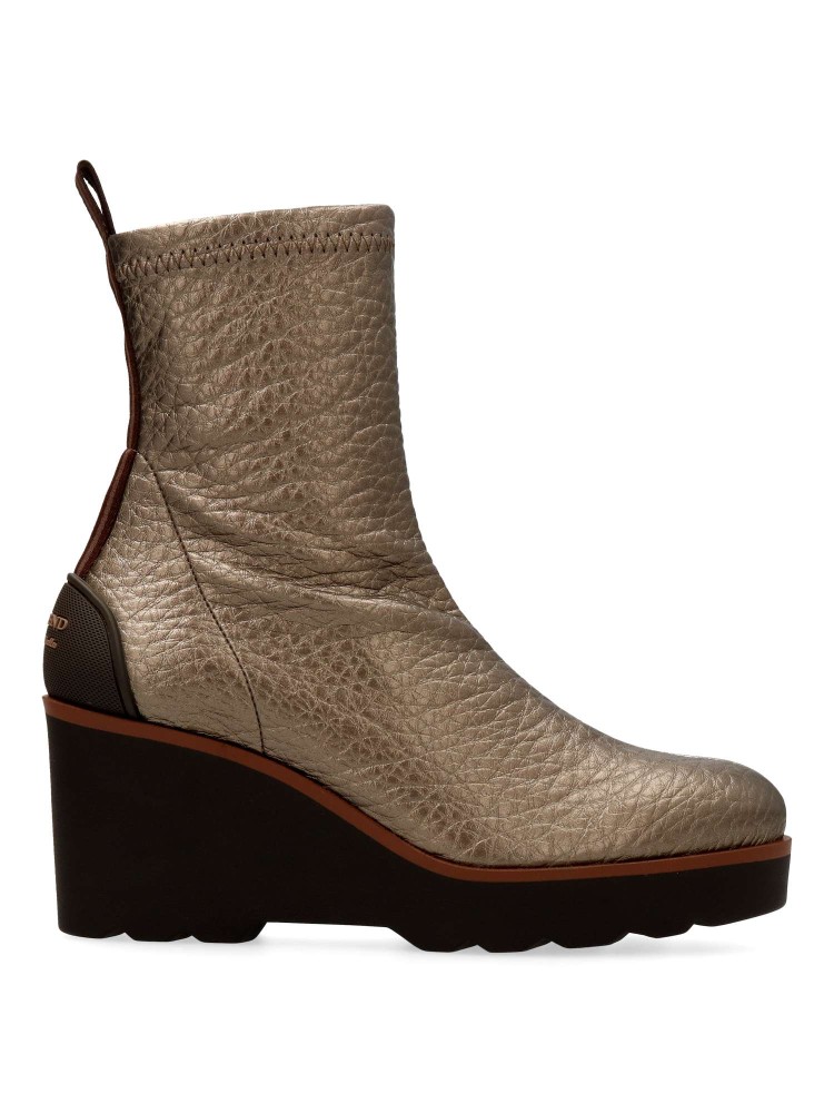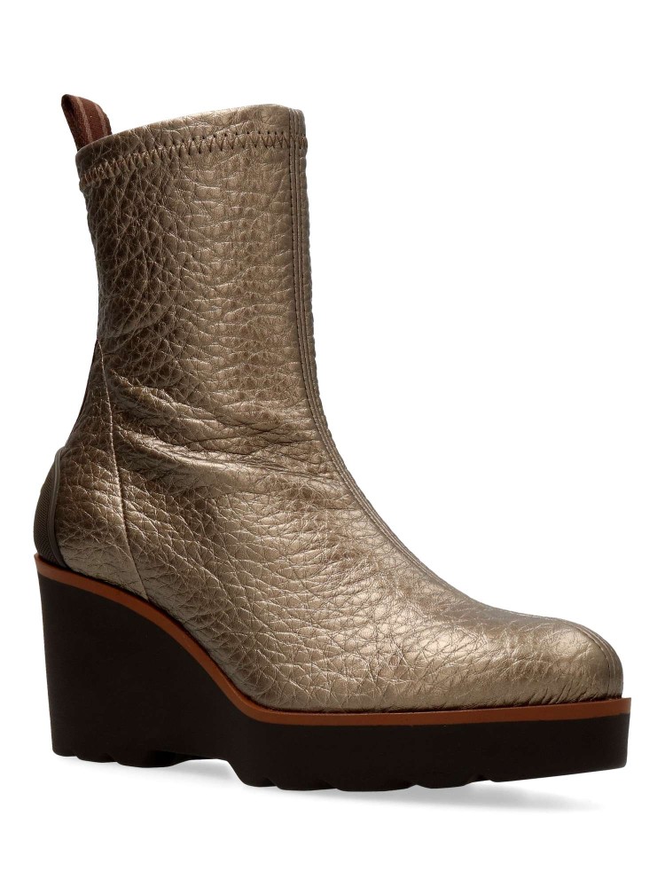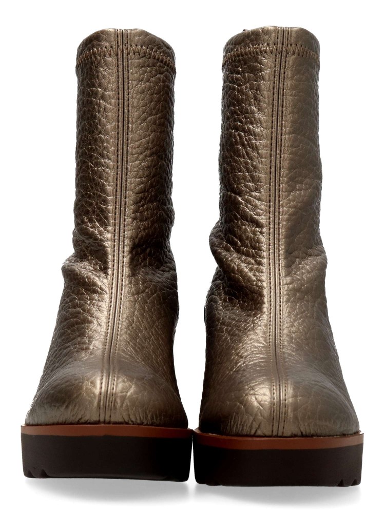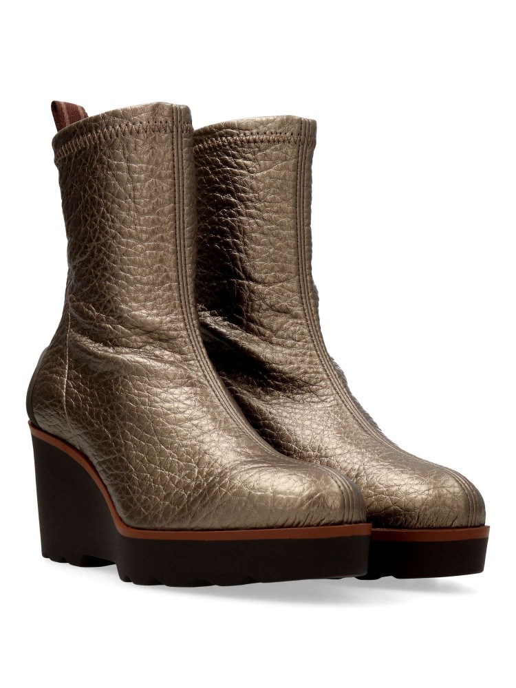 Botines de tejido elástico efecto piel metalizada de color bronce. Su horma ancha garantiza un ajuste espacioso y agradable incluso después de horas de uso. Altura cuña 7 cm. Altura caña 15 cm. Básico y atemporal imprescindible en tu armario.