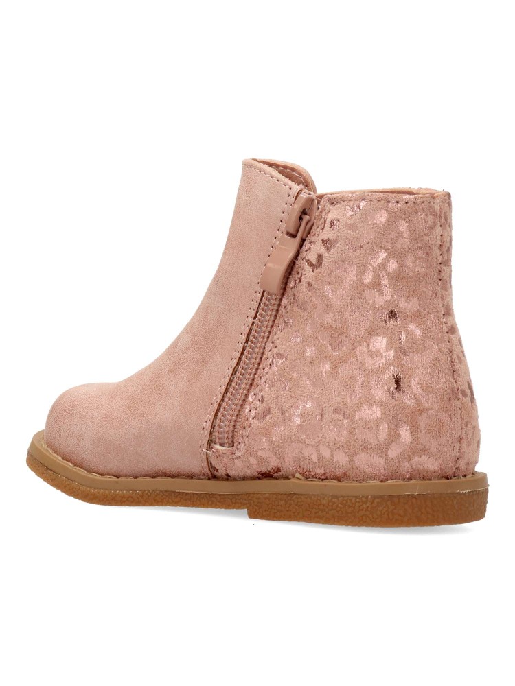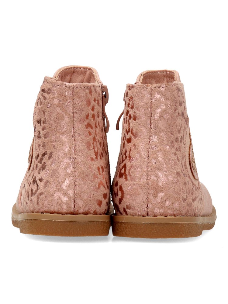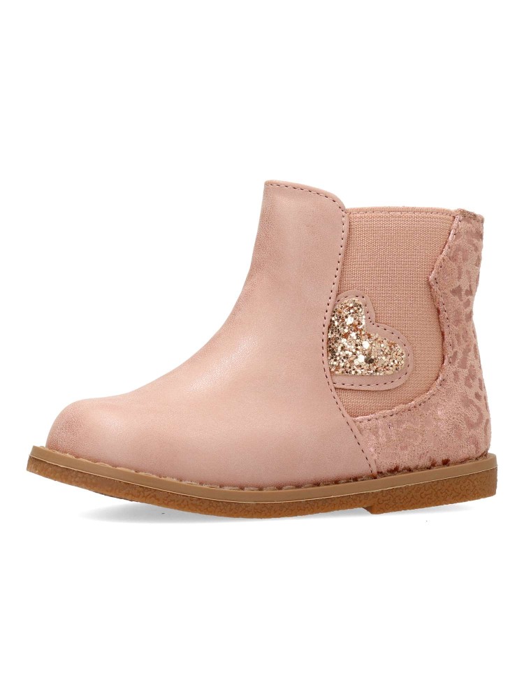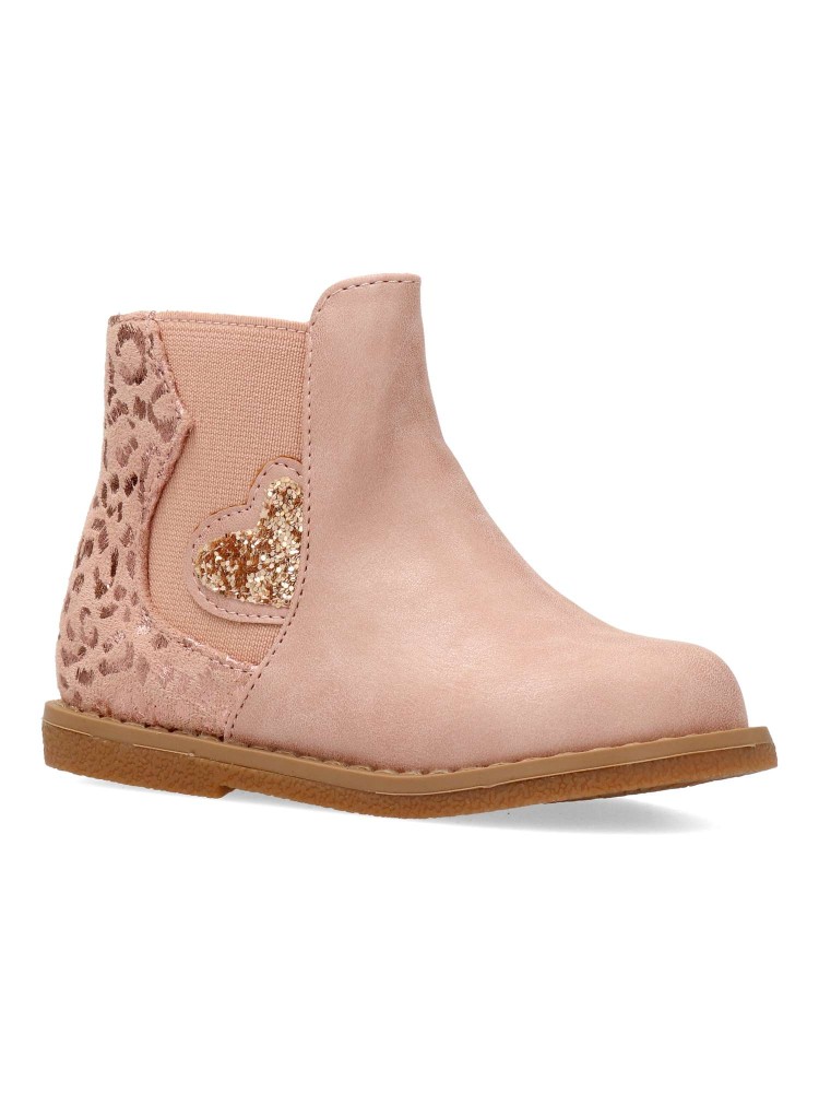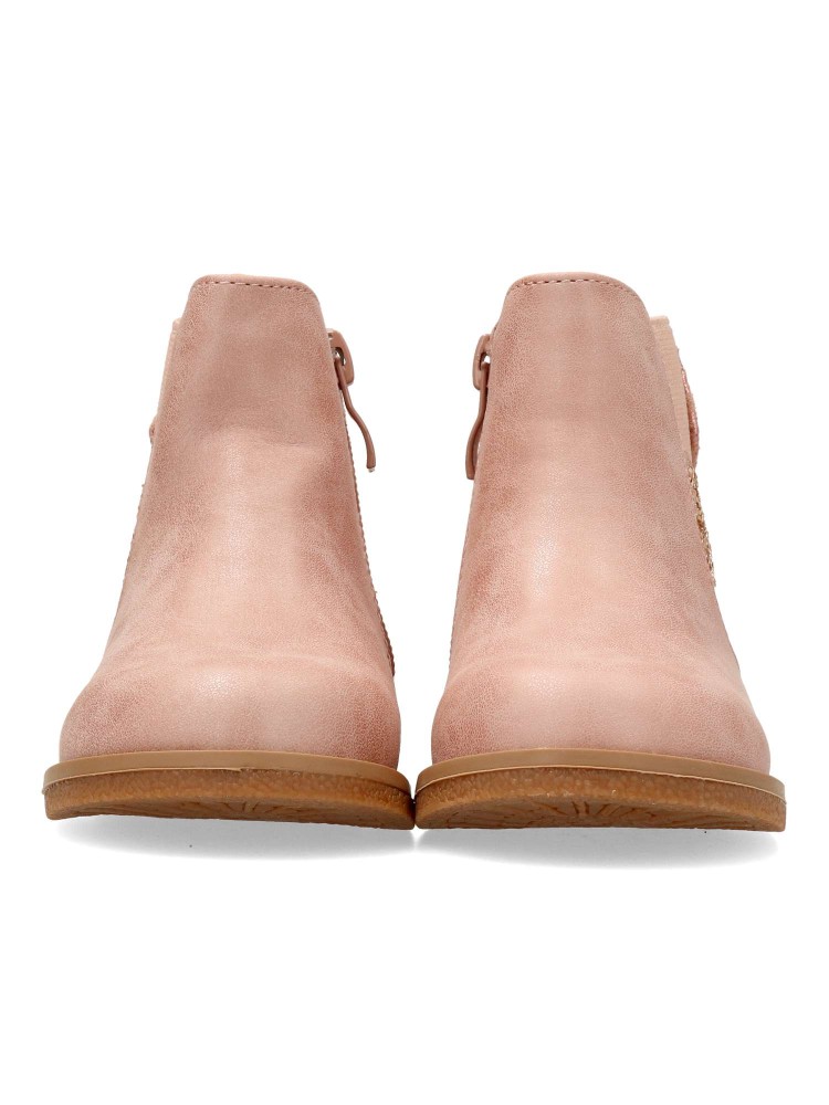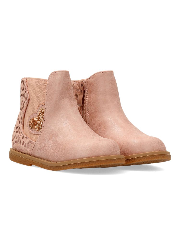 Botín plano de niña con cierre de cremallera y elástico lateral. Fabricada en piel sintética, con suela de goma. Caña de 9 cm. Color rosa. Detalle corazón glitter y brillo. Diseño elegante y versátil que podrás conjuntar con sus looks de temporada.