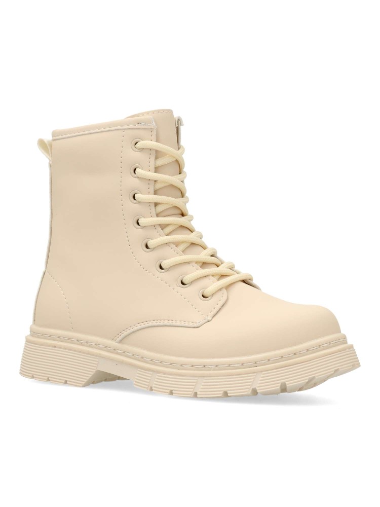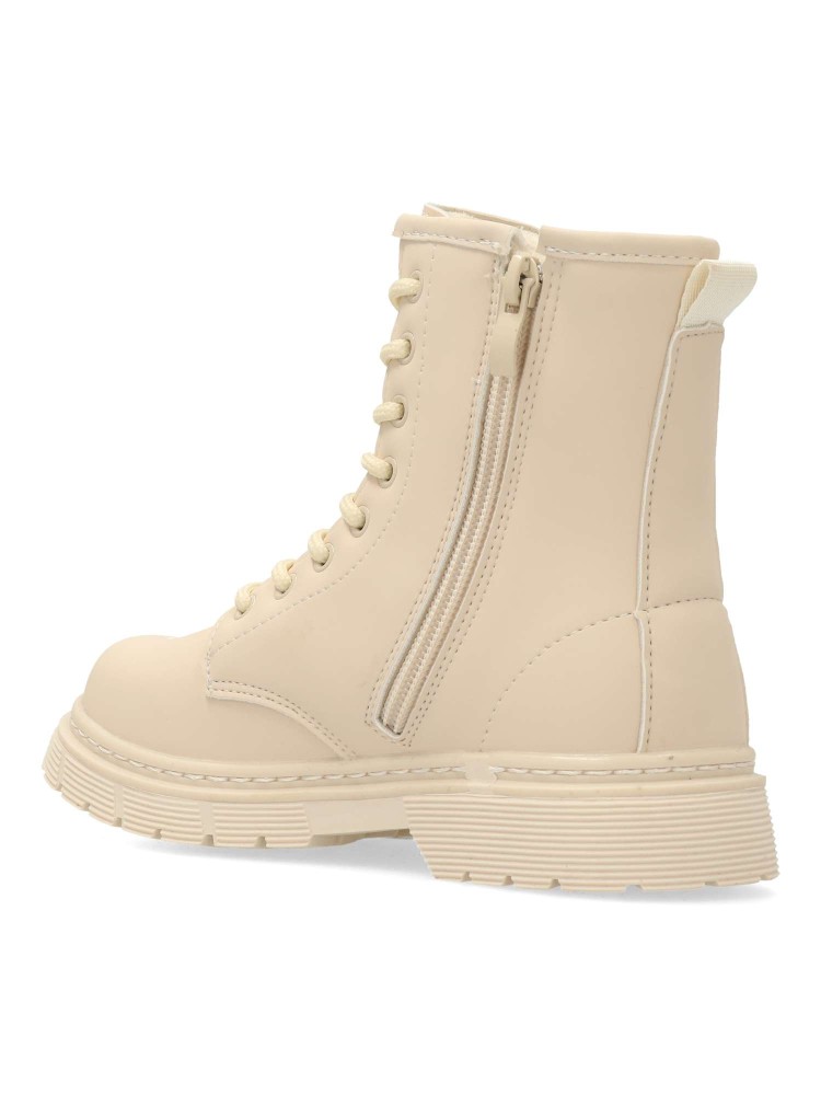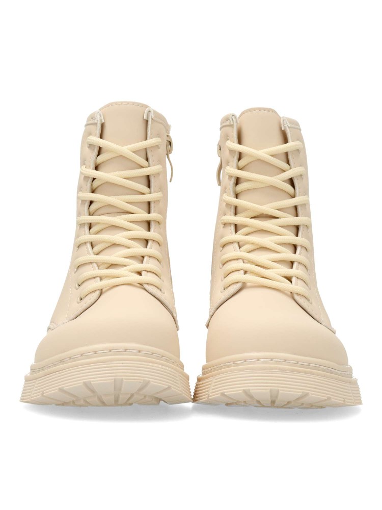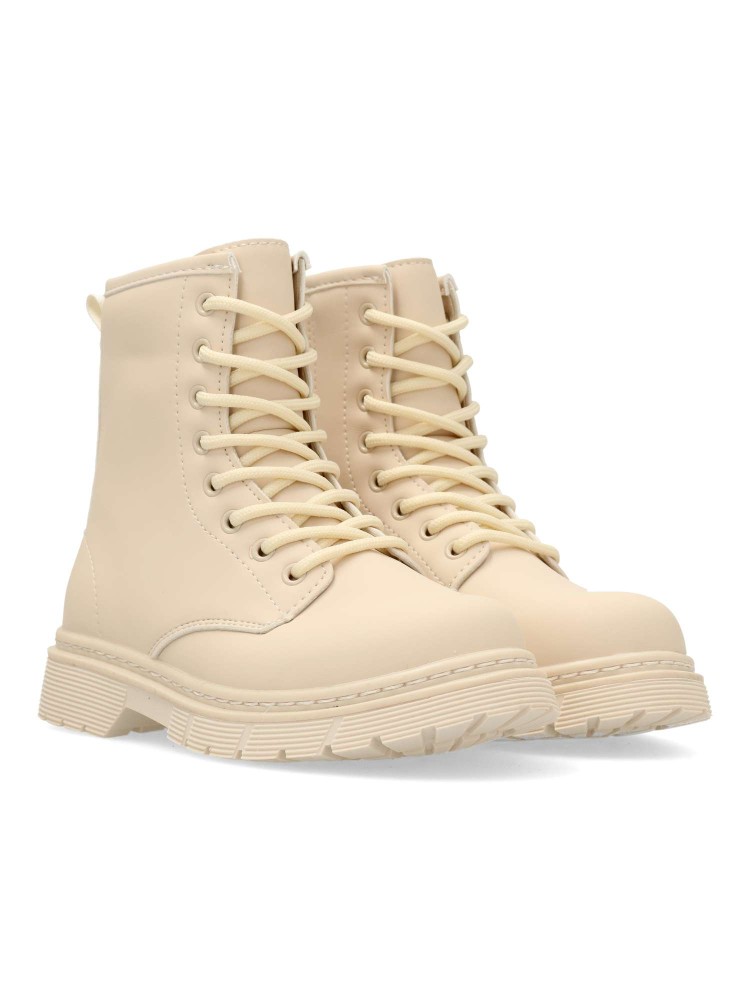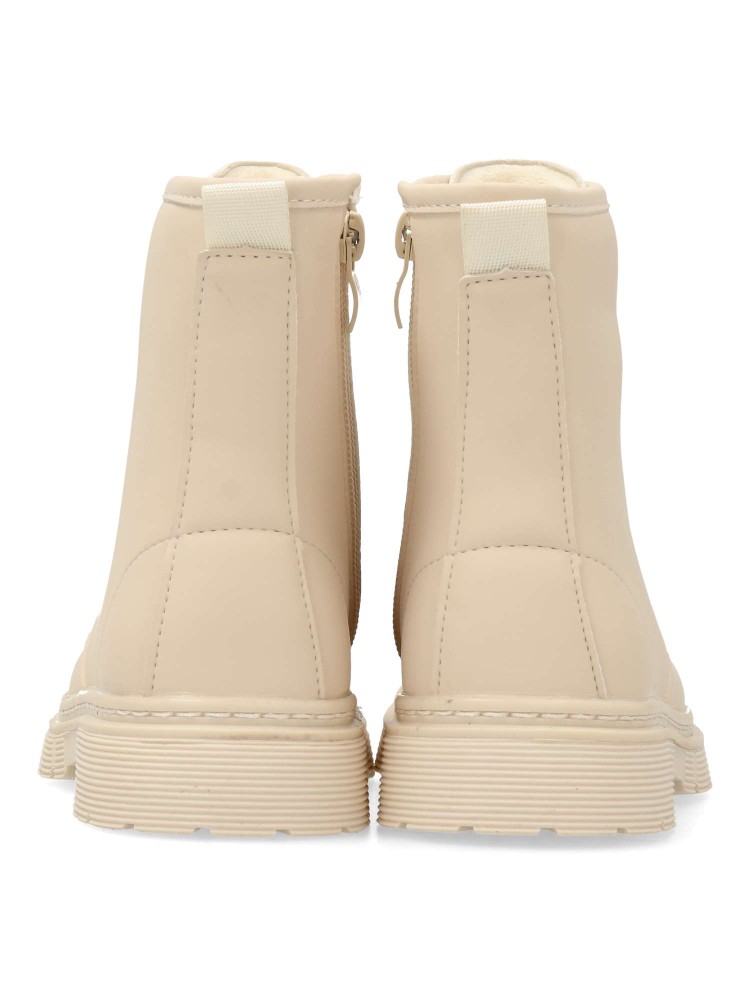 Botita de niña estilo militar. Cierre de cremallera lateral y cordones. Fabricada en material sintético, con suela de goma dentada. Forro interior de pelo sintético suave. Botín biker cómodo y muy versátil, que combina fácil con tus outfits de temporada.