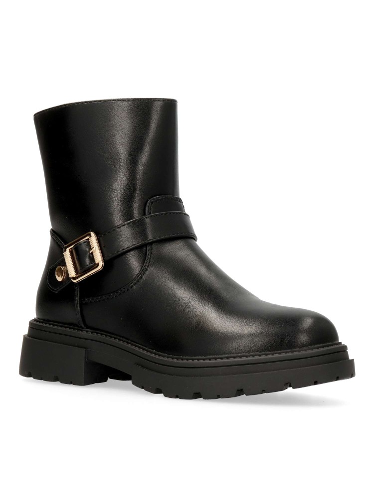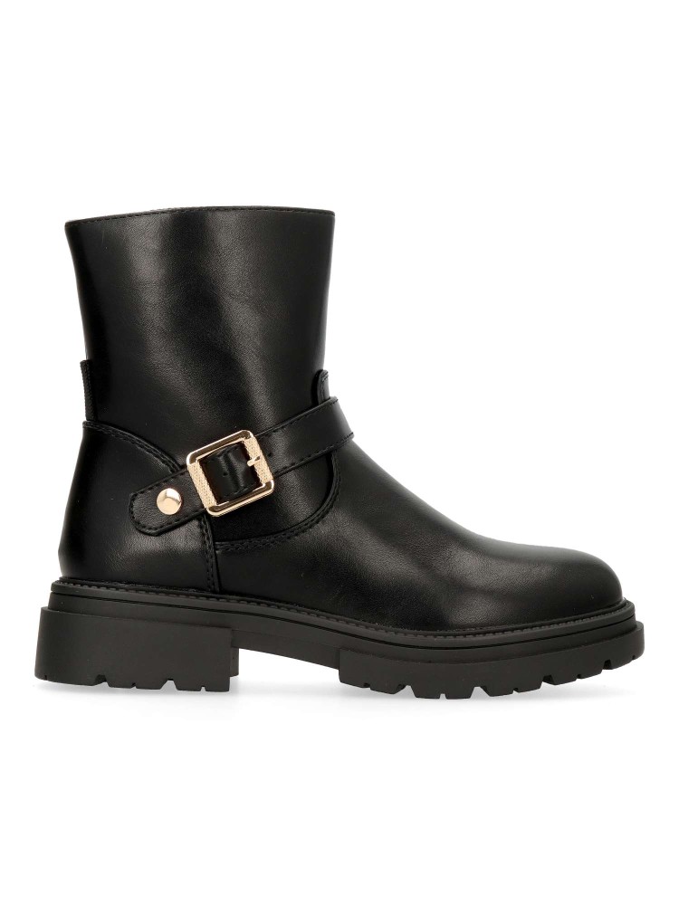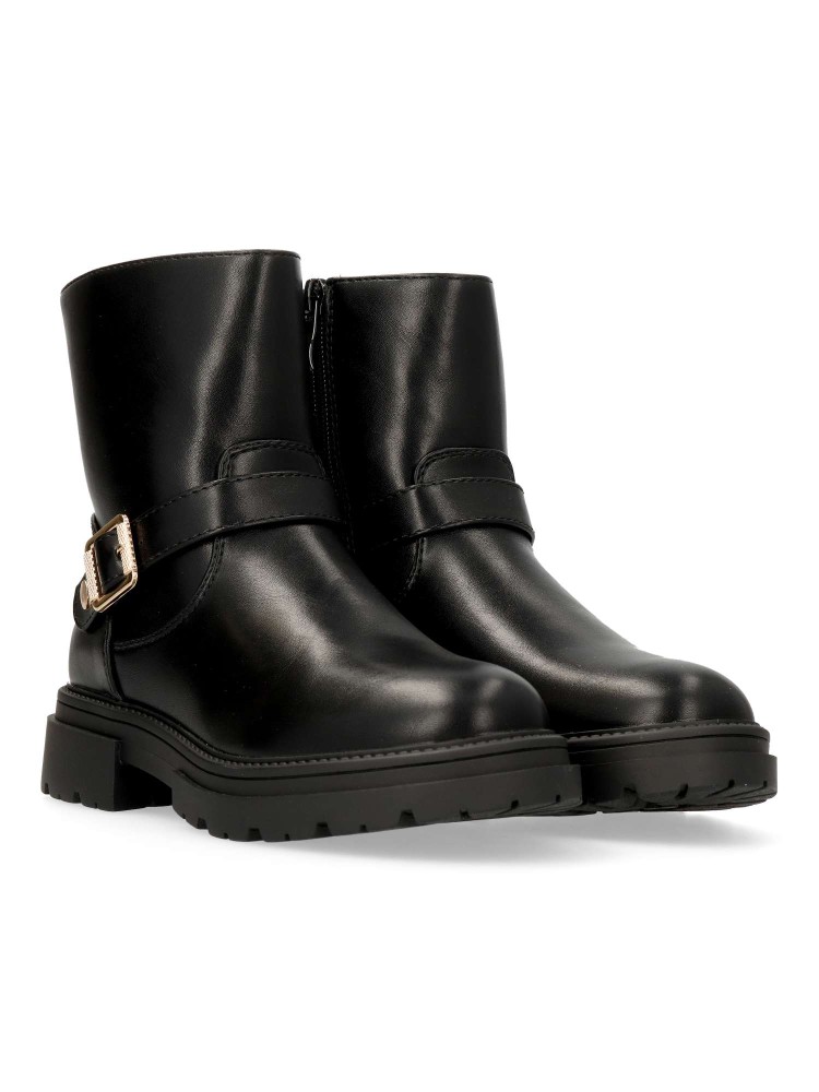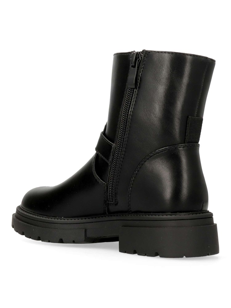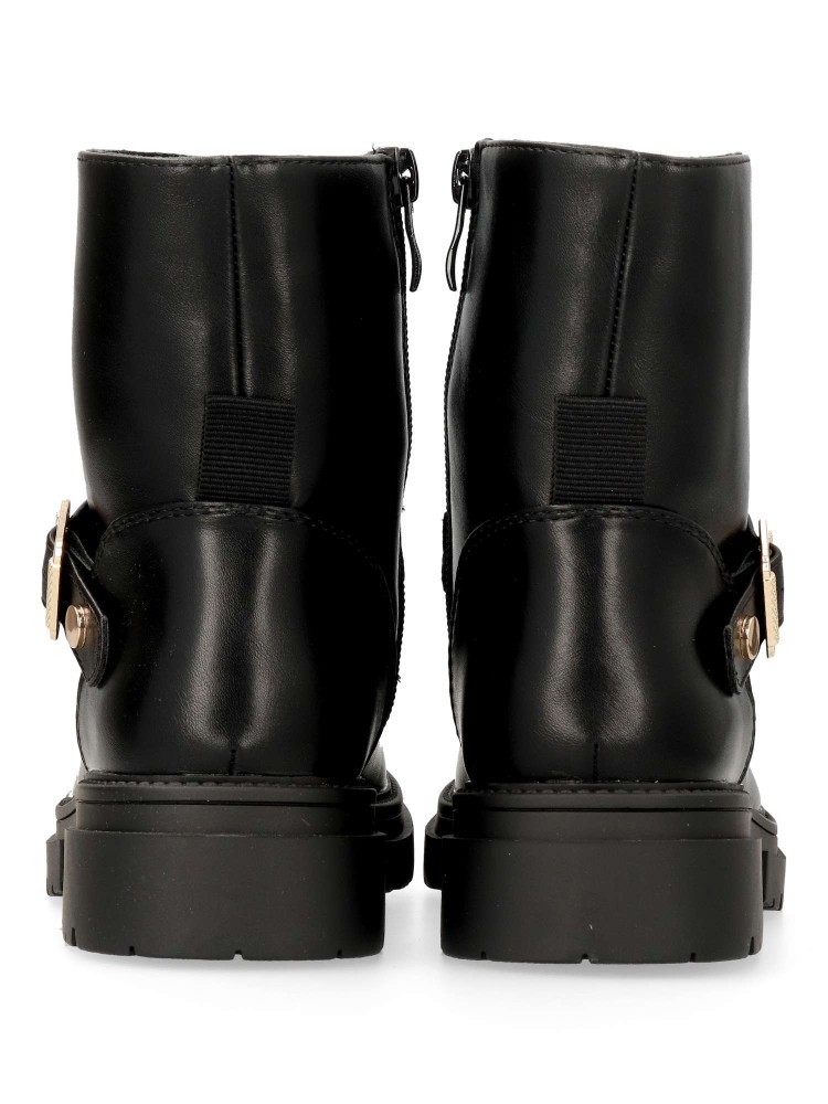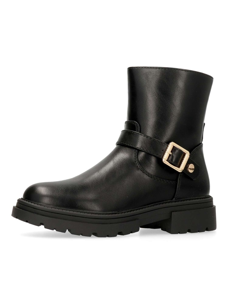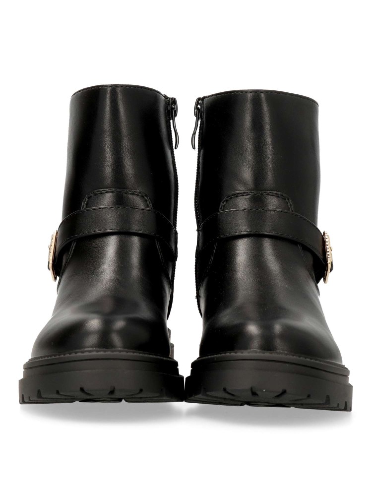 Botita de niña estilo militar. Cierre de cremallera lateral hebilla decorativa. Fabricada en material sintético, con suela de goma. Forro interior de pelo sintético suave. Botín biker cómodo y muy versátil, que combina fácil con tus outfits de temporada.