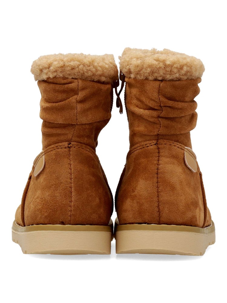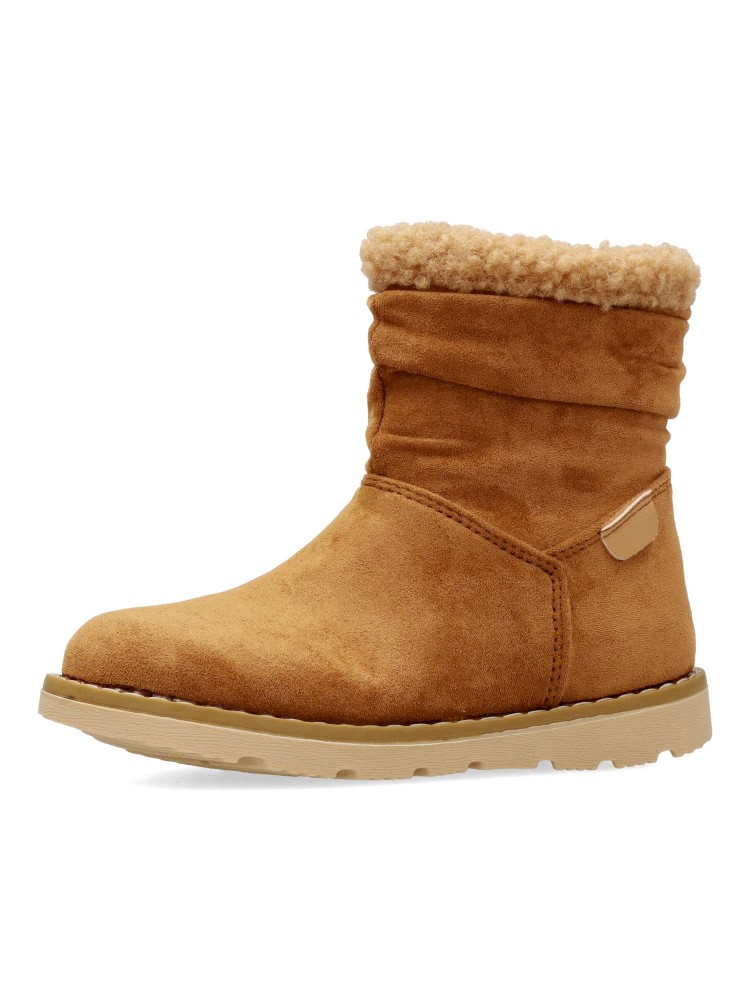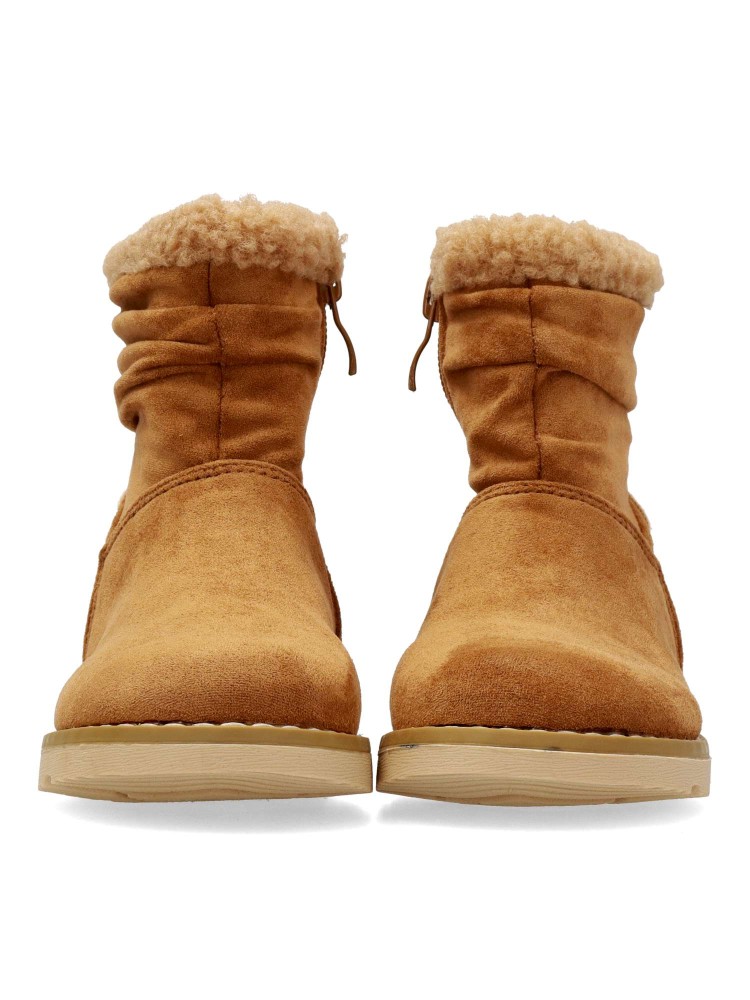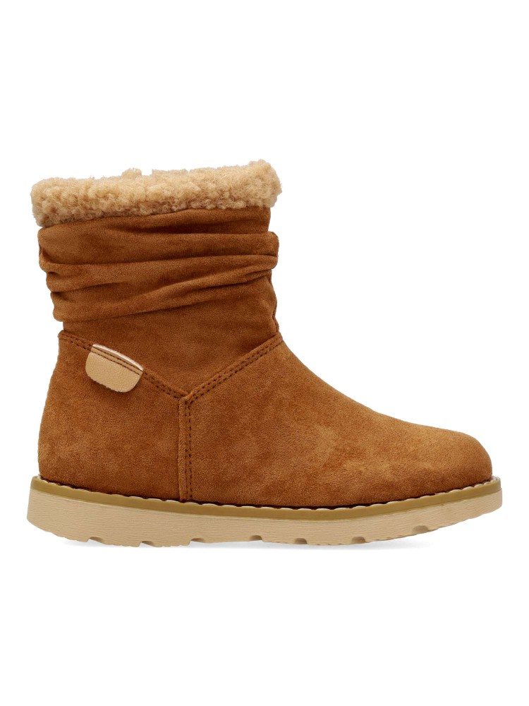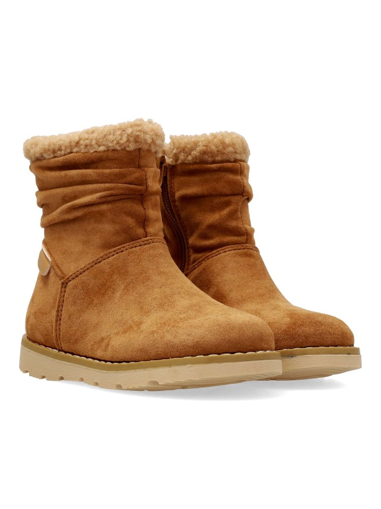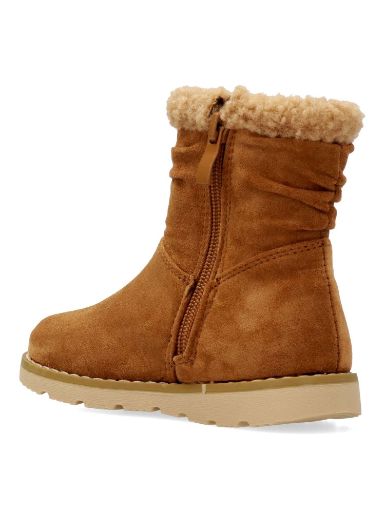 Botín plano de niña con cierre de cremallera lateral. Fabricada en textil antelina, con suela de goma. Altura caña 12 cm. Detalle borreguito. Color camel. Diseño cálido y versátil que podrás conjuntar con todos tus outfits de invierno.