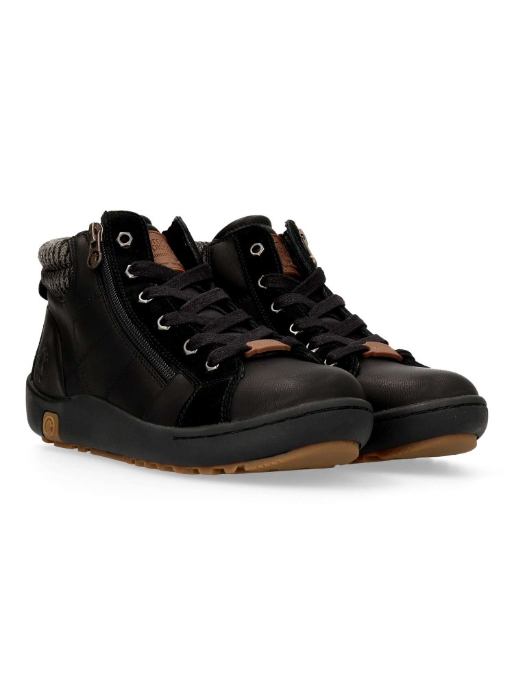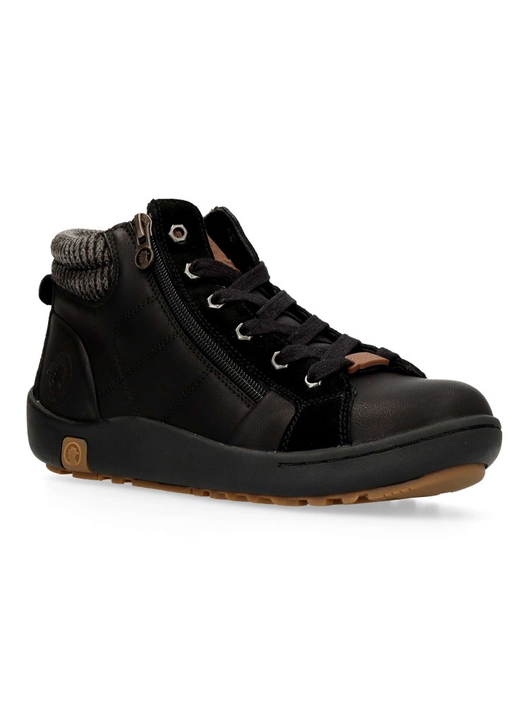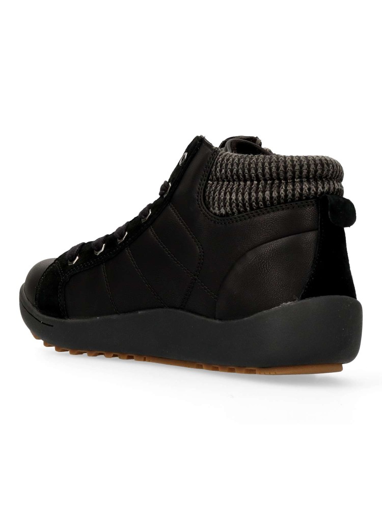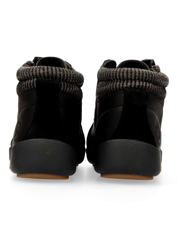Botines de señora en color negro. Cierre con cordones y cremallera. Fabricado en piel y sintético, con forro textil y plantilla extraíble termoconformada. Altura de caña 9 cm. Botines deportivos con diseño casual, ideal con tu outfit urbano.