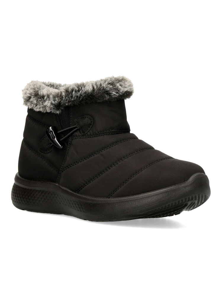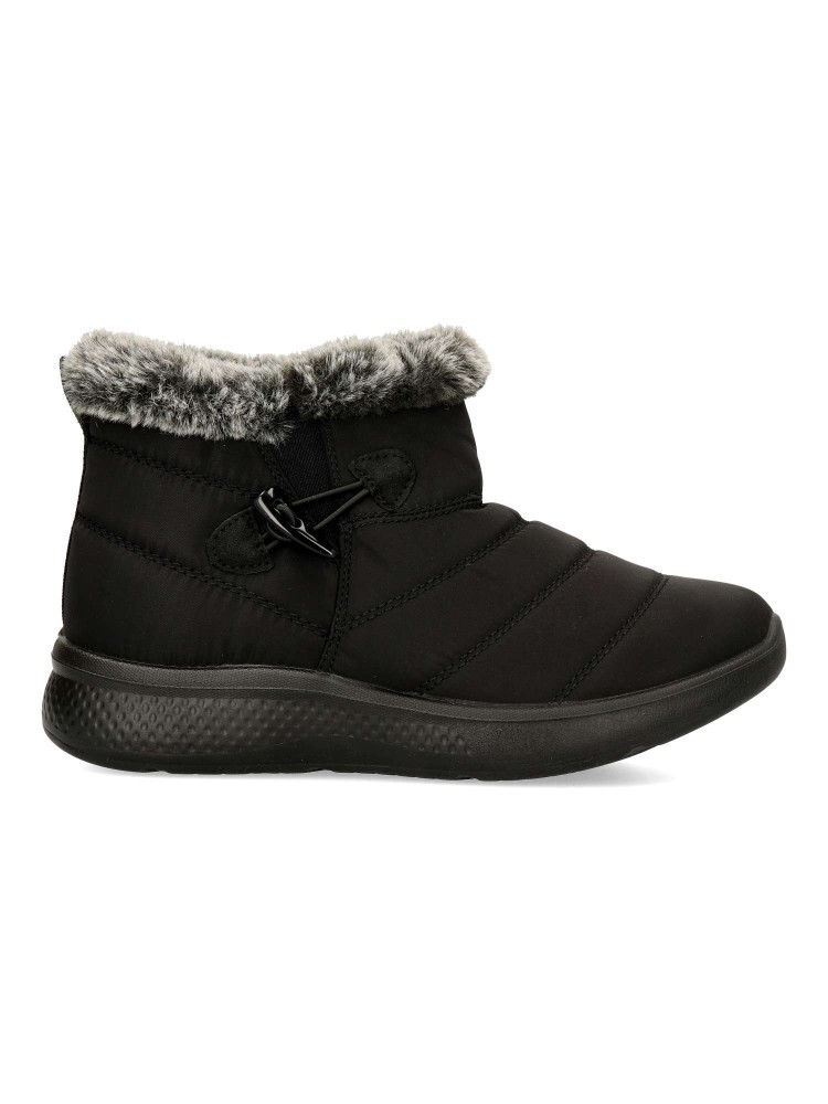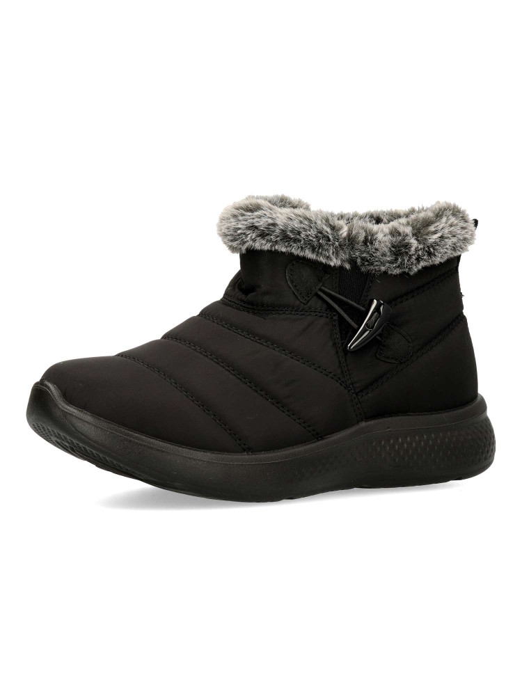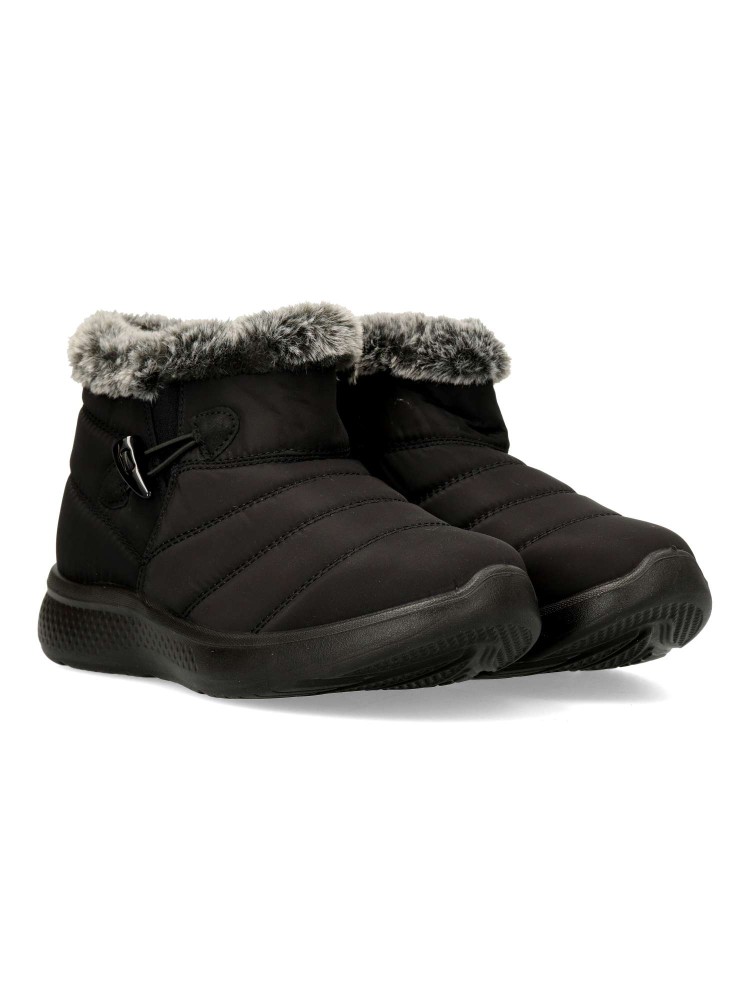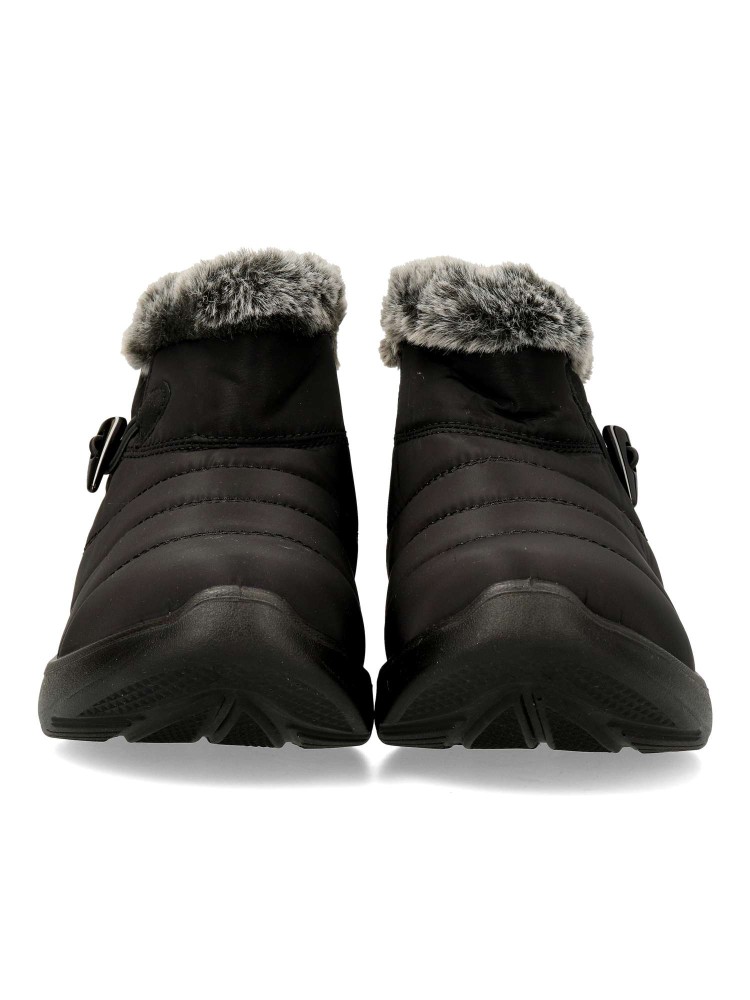Botín plano de mujer, con cierre de cremallera lateral. Modelo cómodo, fabricado en textil acolchado. suela de goma ligera y flexible. Forro interior de pelo sintético aterciopelado. Modelo cálido y confortable, ideal con tus outfits de invierno.