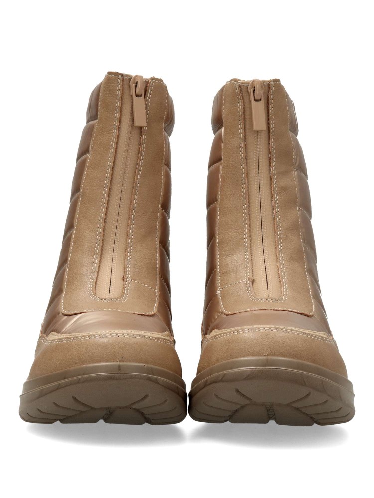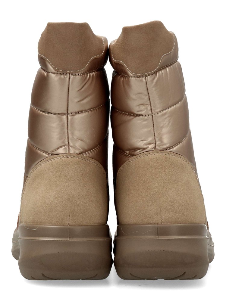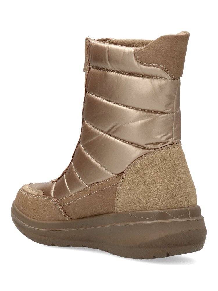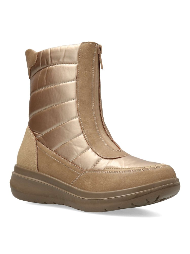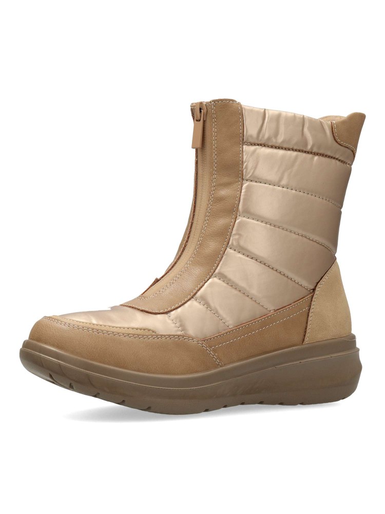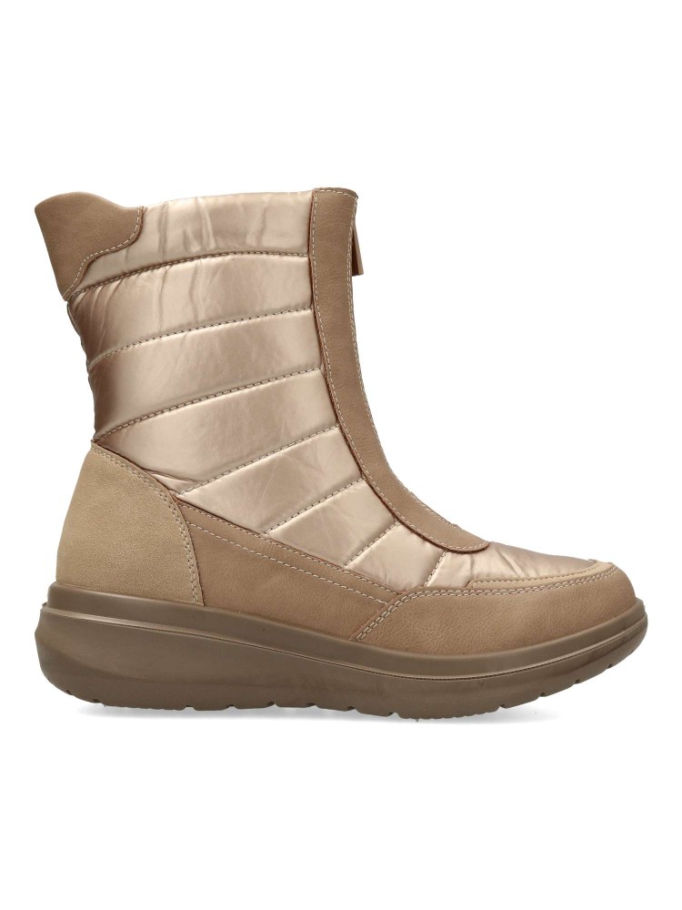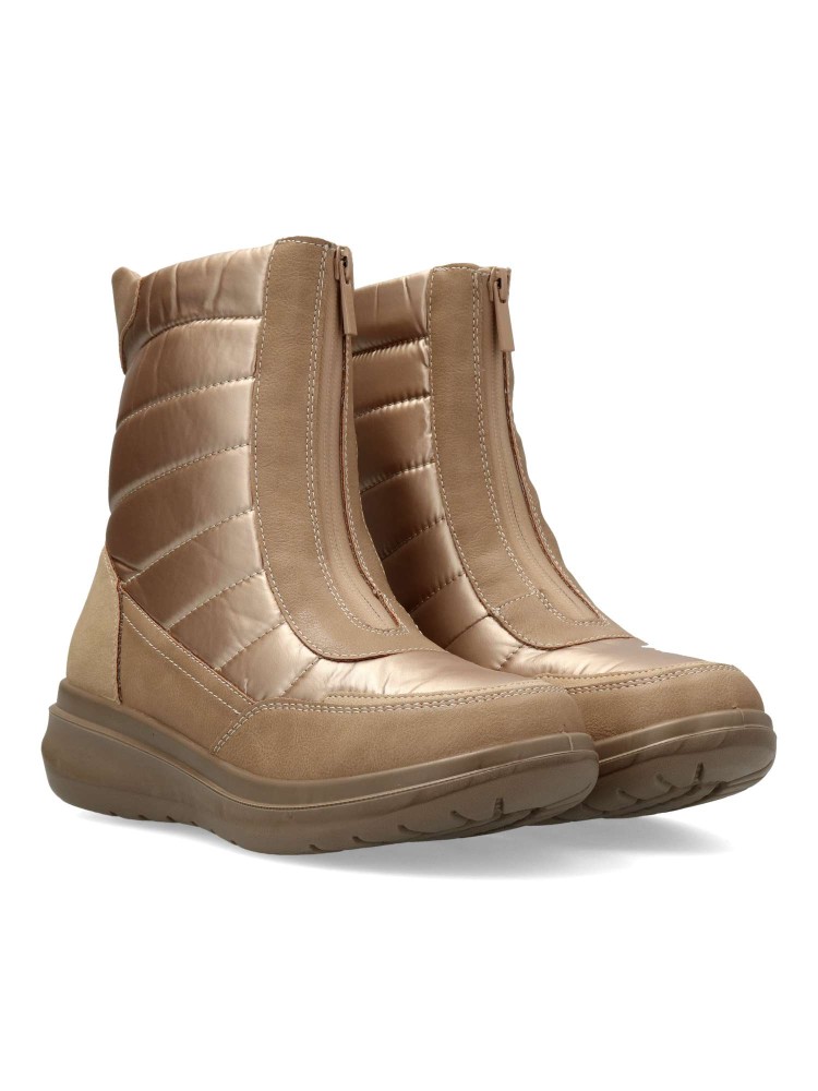 Botín de mujer con cierre de cremallera al empeine. Modelo cómodo, fabricado en piel sintética y textil acolchado. Suela deportiva de goma. Forro interior de pelo sintético. Color oro. Botines con los que te sentirás abrigada durante todo el día.
