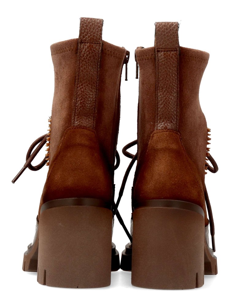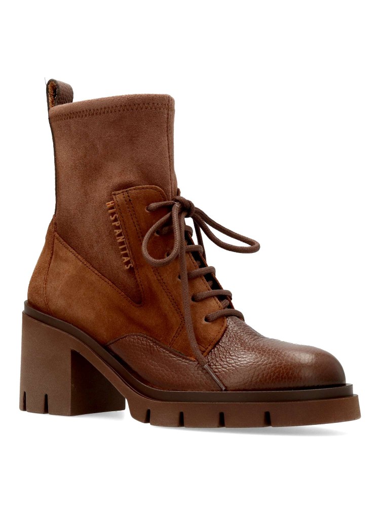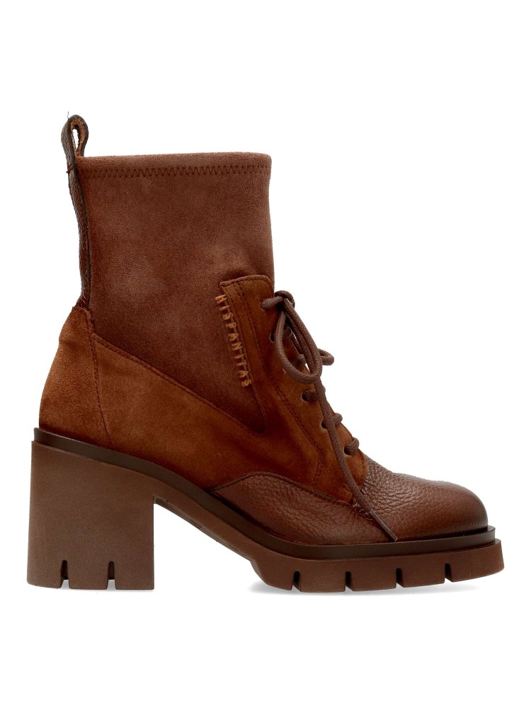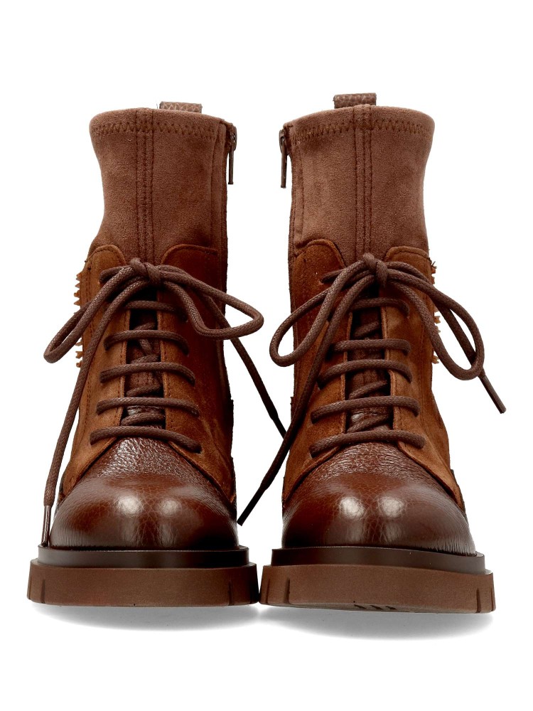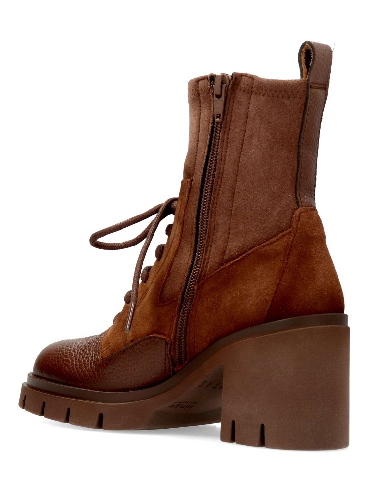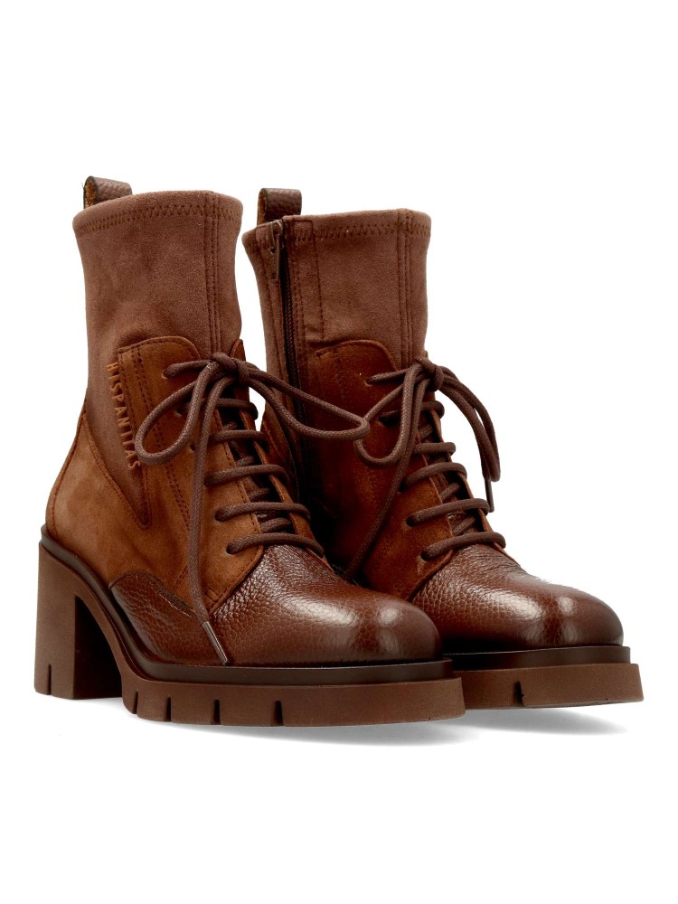 Botín con tacón bloque y punta redonda. Cierre de cremallera lateral y cordones. Fabricado en piel y textil. Color avellana. Tacón de 7 cm. Incorpora la tecnología TRIFLOW, amortigua cada paso gracias a su triple almohadillado.