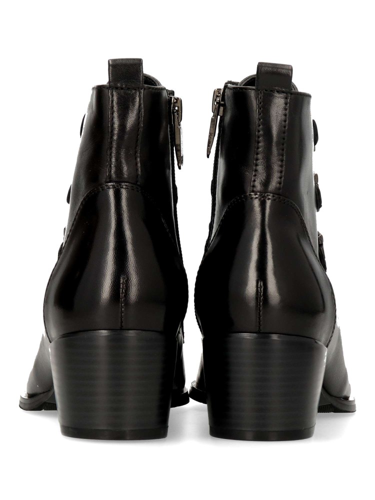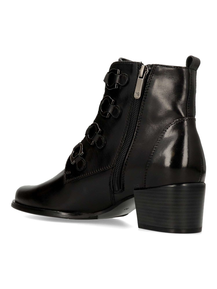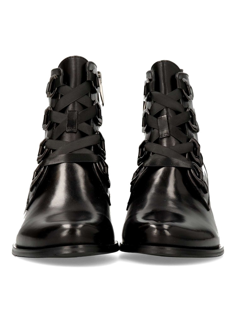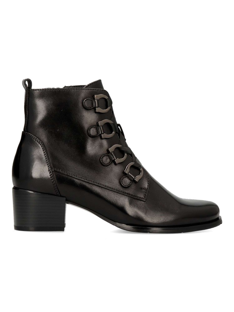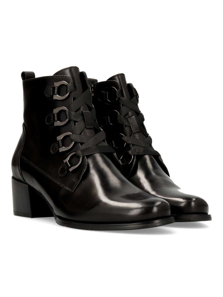 Un botín estilizado elaborado en piel. Los ojales metálicos decorativos le dan un toque sutil. Cordones planos de satén y cremallera interior para una mayor comodidad. Tacón cuadrado de 4,5 mm con plantilla extraíble. Diseño versátil y elegante.