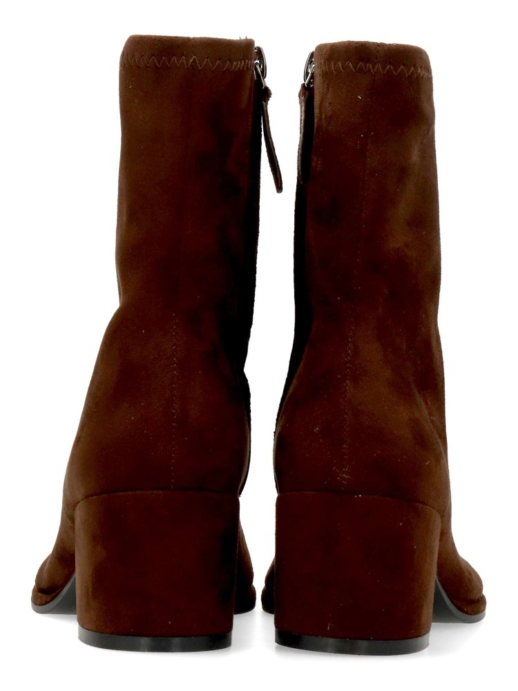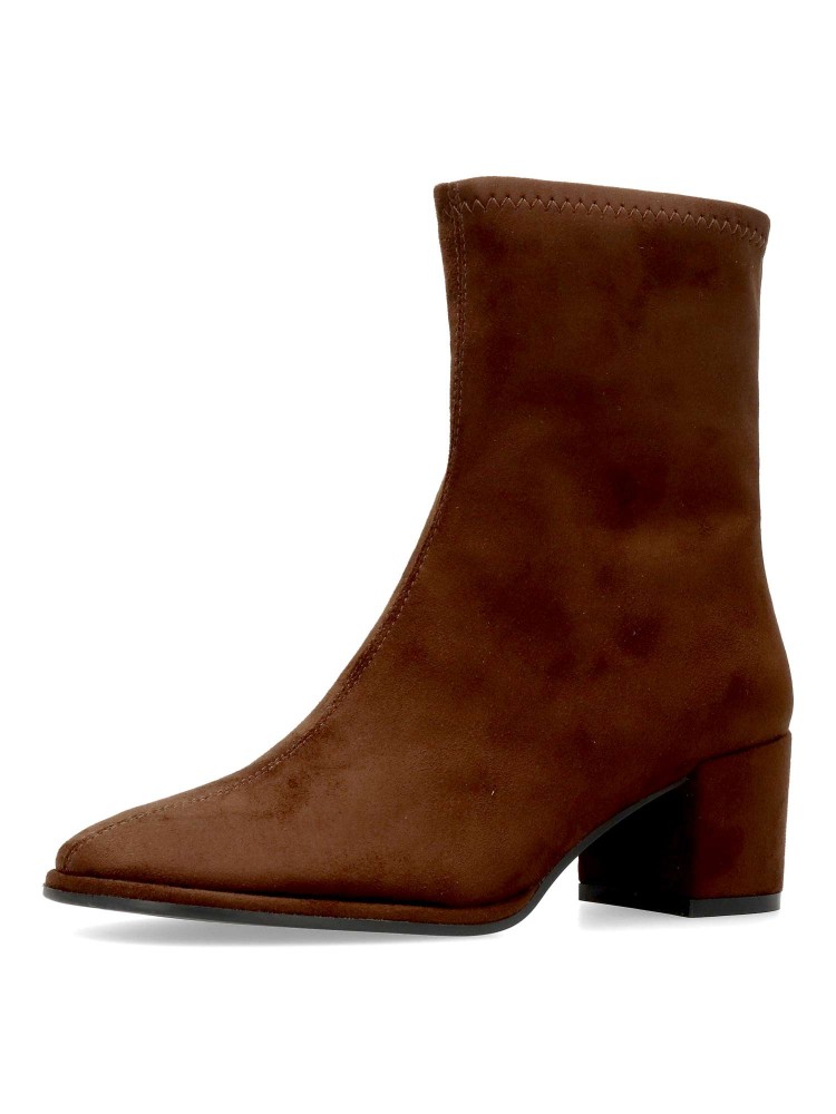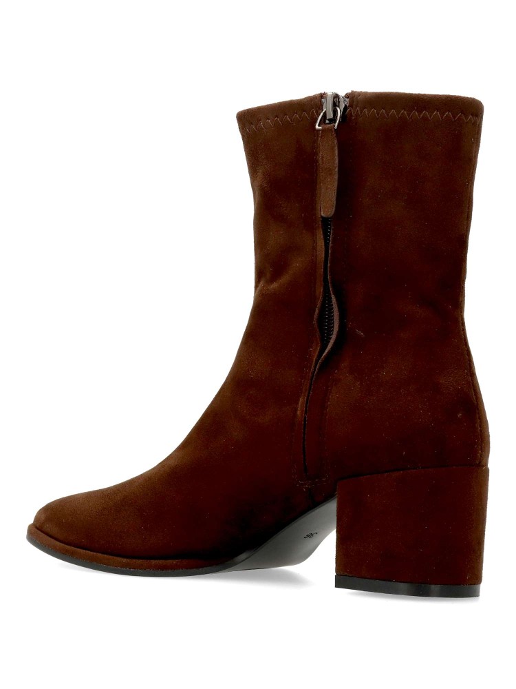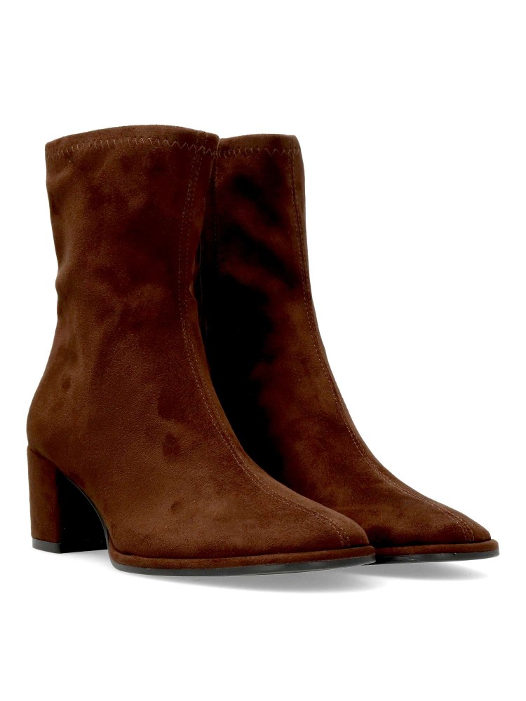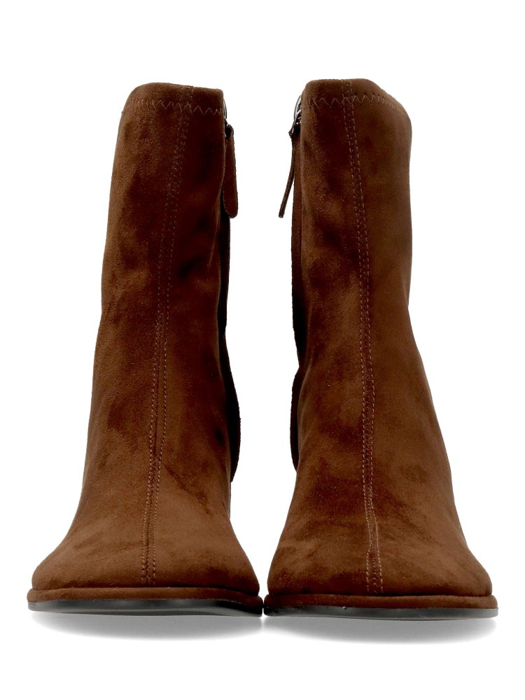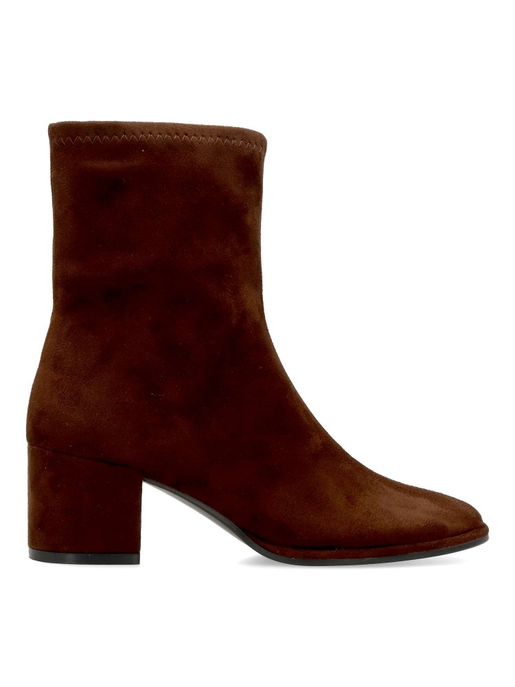 Botín cómodo de mujer, con cierre de cremallera lateral. Fabricado en material antelina elástica, con suela de goma. Tacón ancho de 5,5 cm. de altura. Caña de 16 cm. Color café. Un básico que no te puede faltar esta temporada.