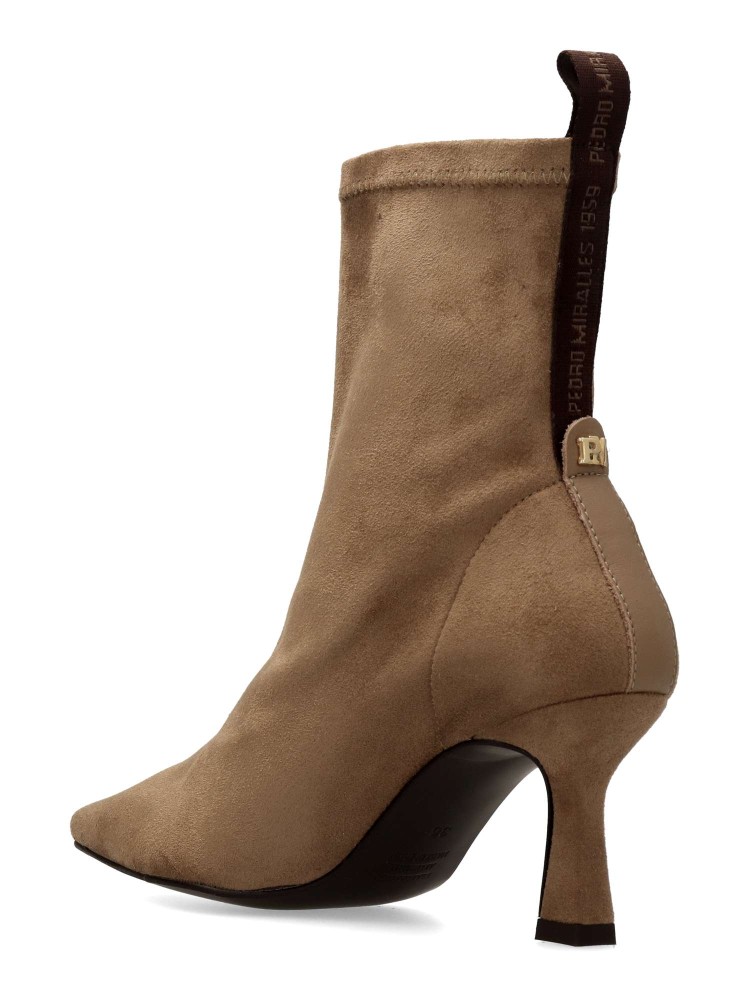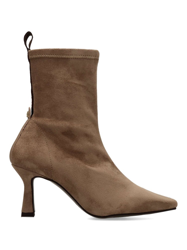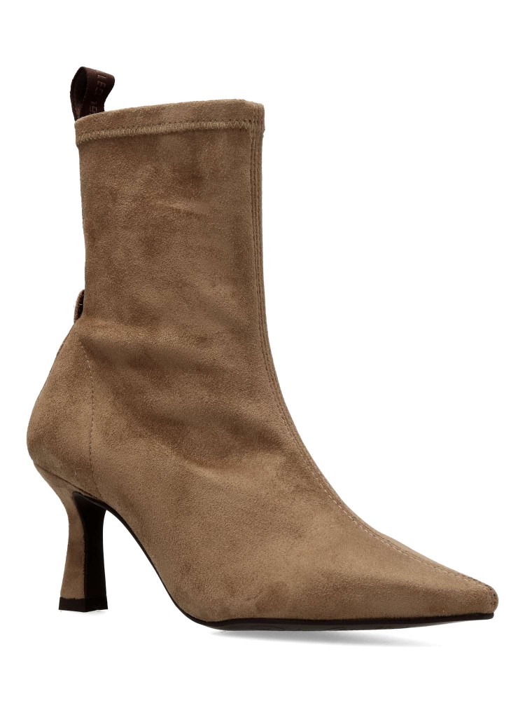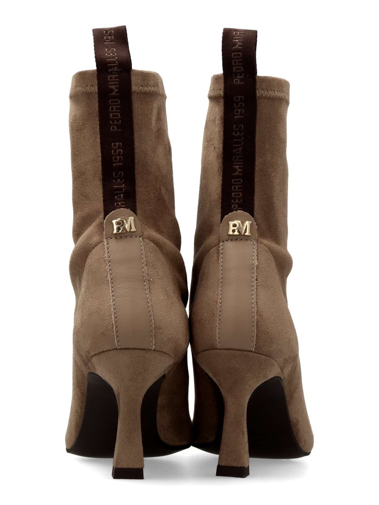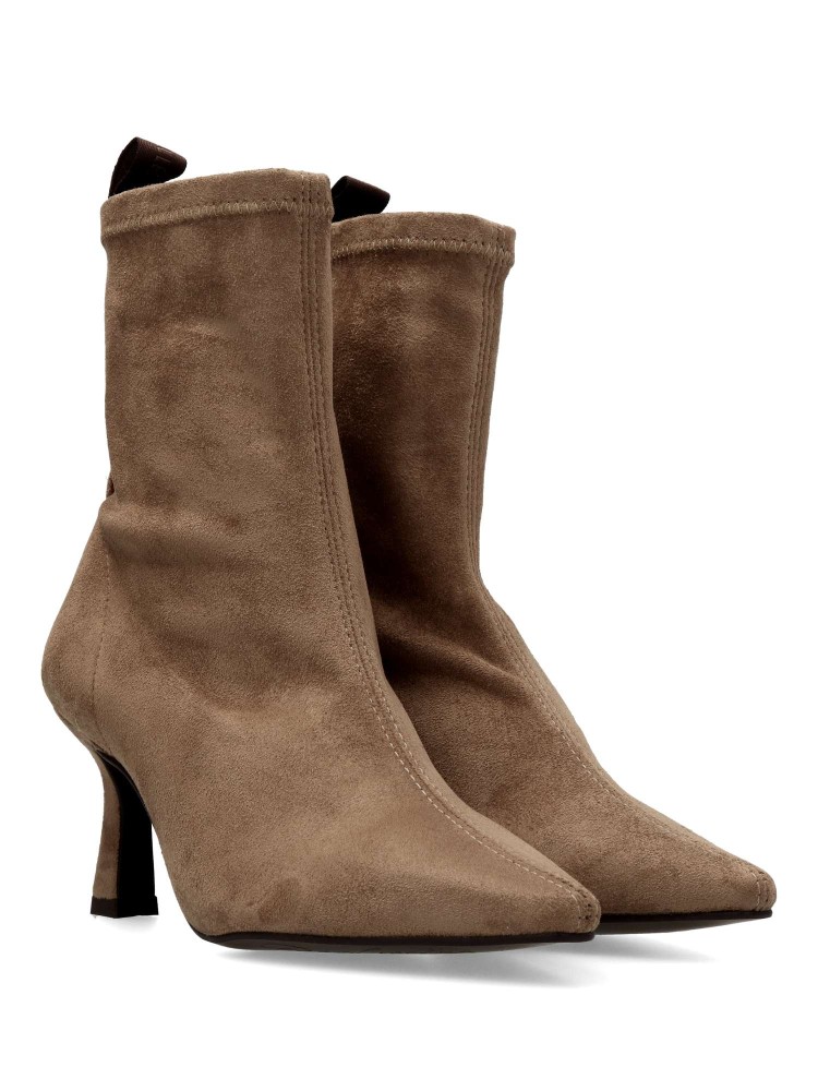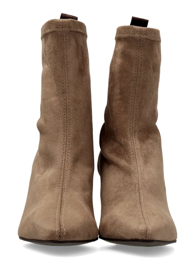 Botines de tejido elástico efecto ante de color taupe. Un modelo que estiliza la silueta y resulta muy favorecedor para lucir con faldas o pantalones wide leg. Tacón fino de 7 cm. Altura caña 17 cm. Modelo que combina estilo casual y modernidad.