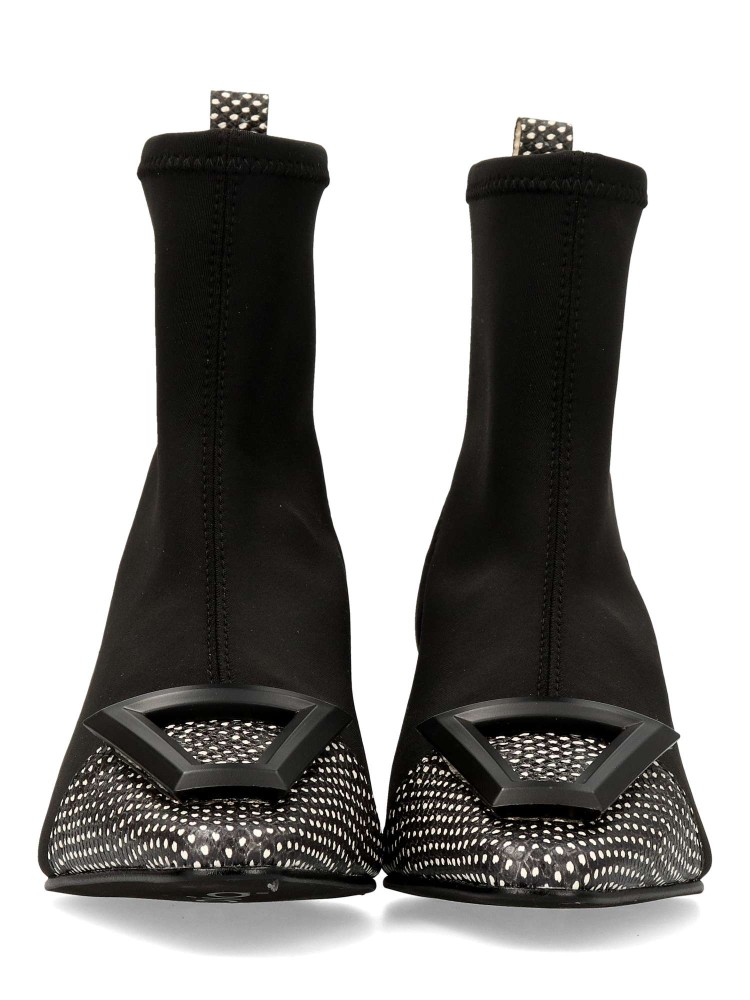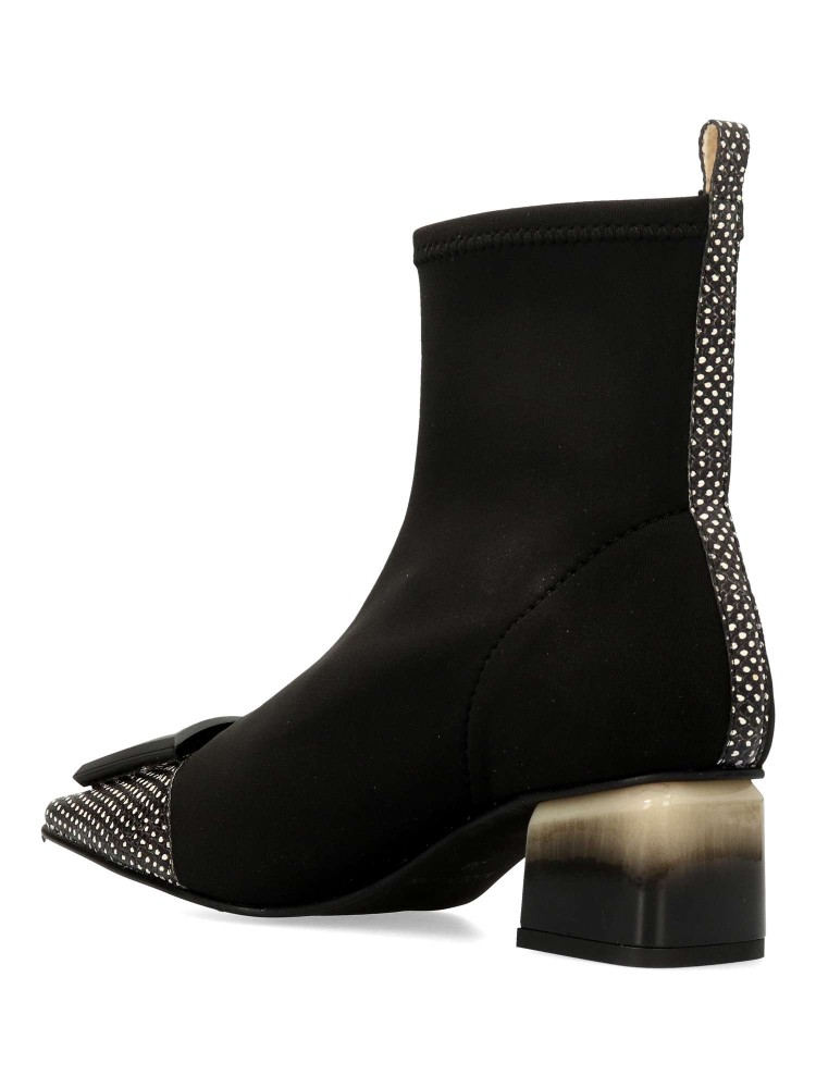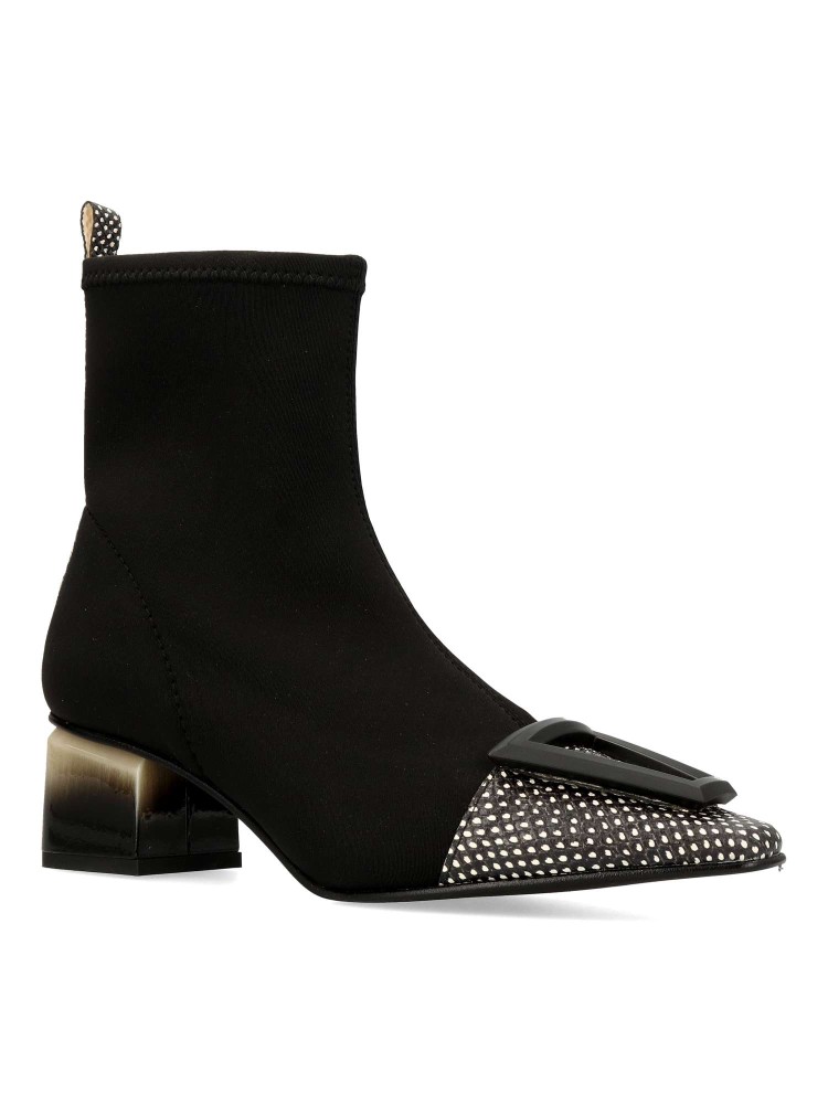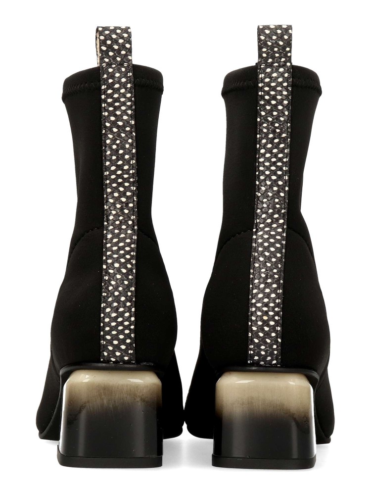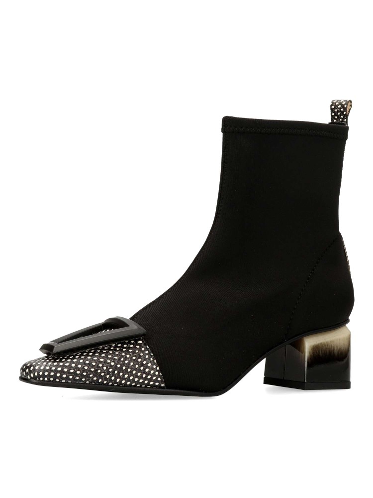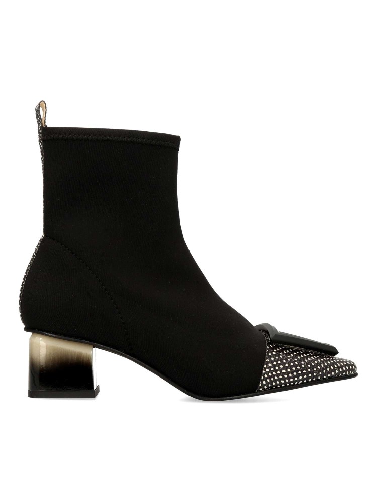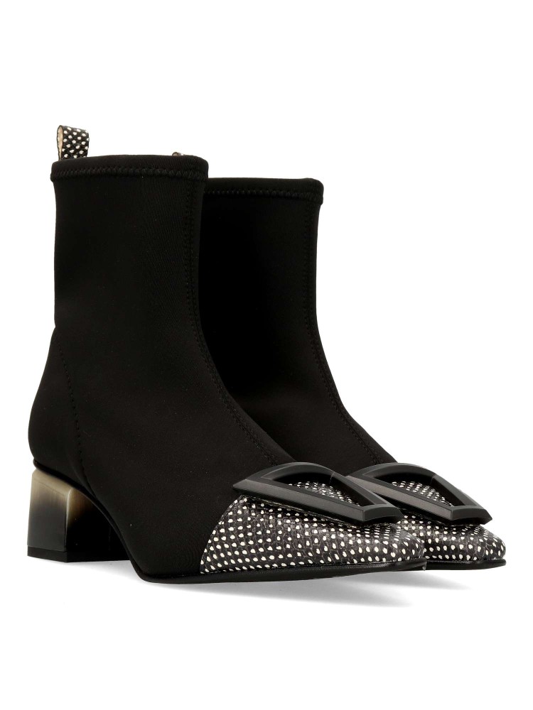 Botín de licra combinado con piel de primera calidad. Puntera fina con aplique decorativo. Tacón ancho de 4,5 cm. Especial confort, platilla acolchada y suela de goma antideslizante. Diseño cómodo y elegante, fabricado en España.