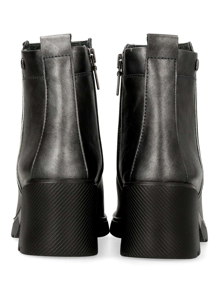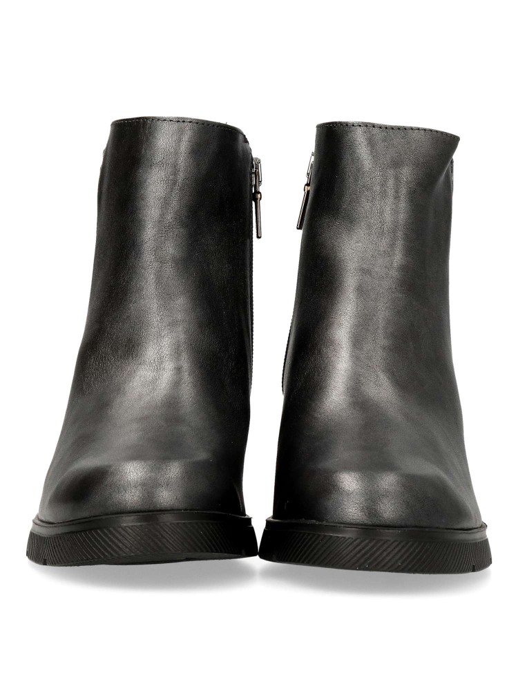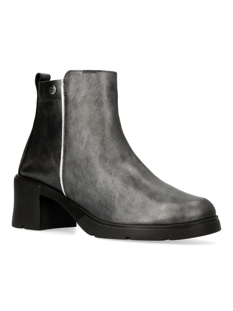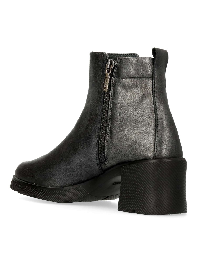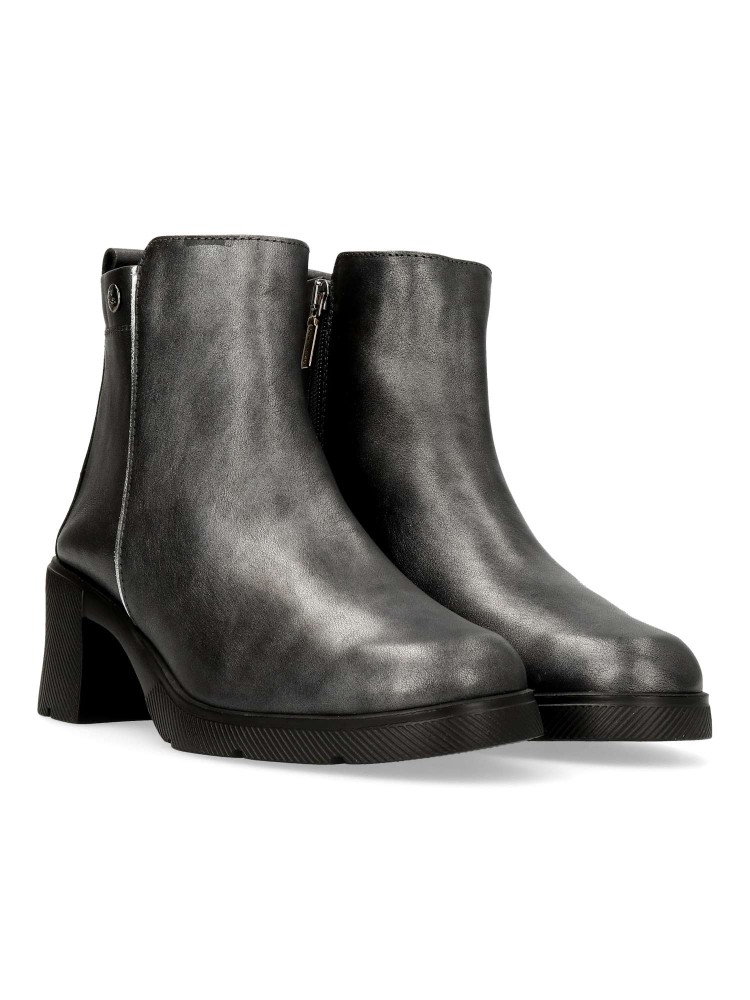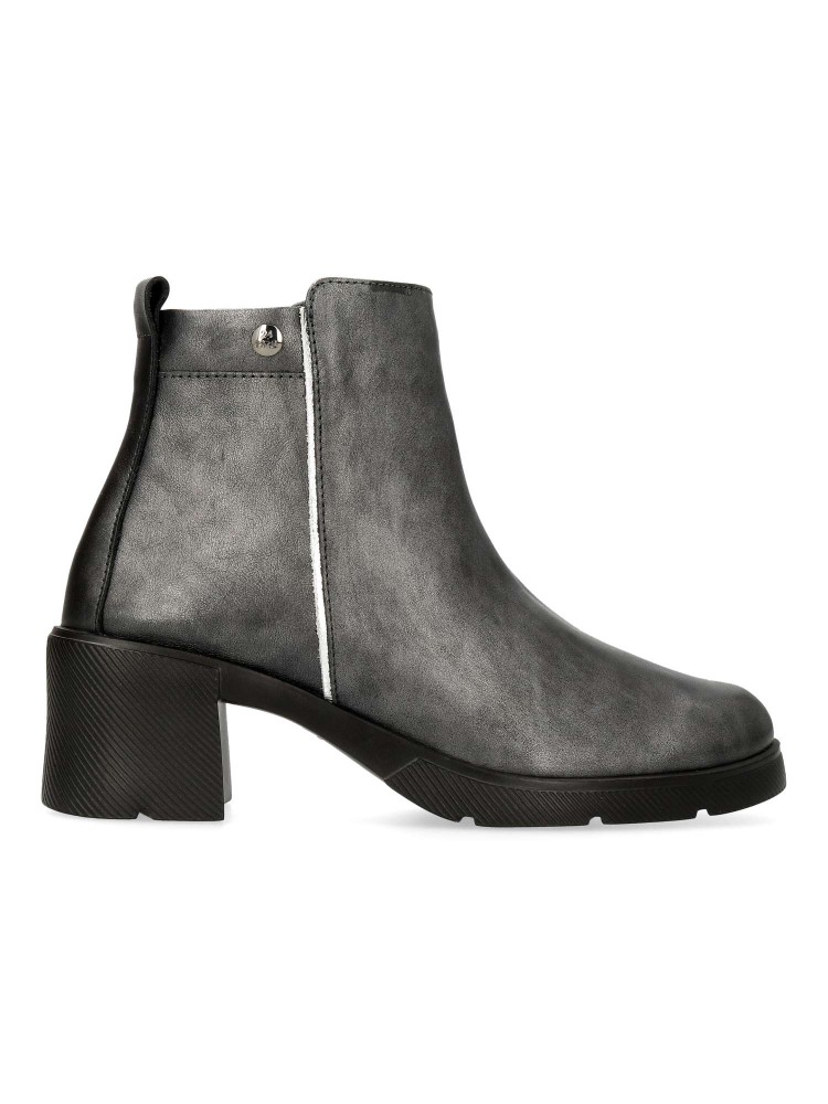 Botín mujer diseñado en piel alta selección color metalizado plomo con cierre de cremallera interior. Puntera redondal y costuras vistas. Suela en EVA ultraligera con tacón de 5,5 cm y comodidad infinita. Un modelo apto para armarios urbanos.
