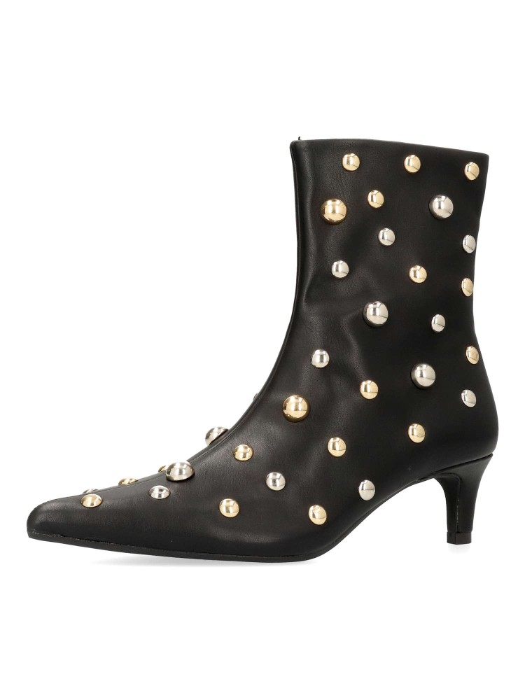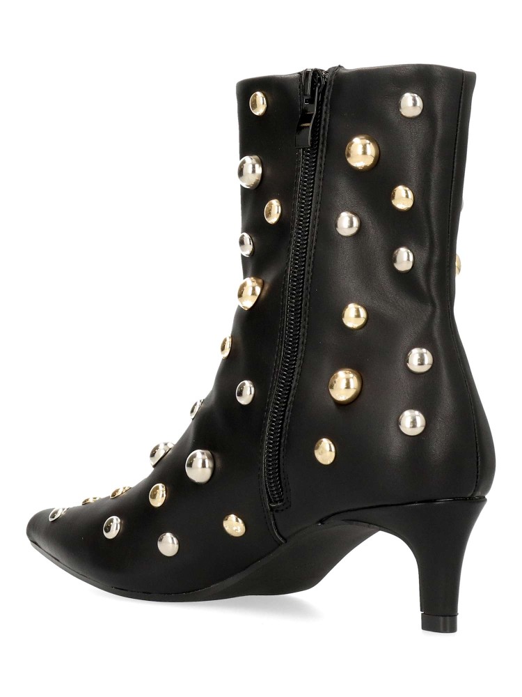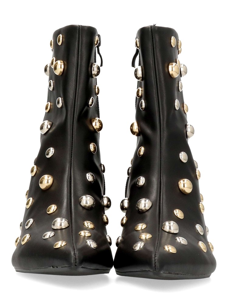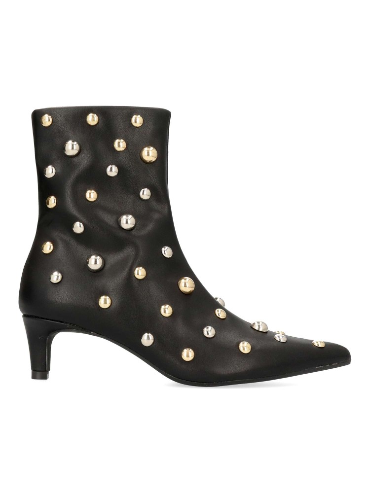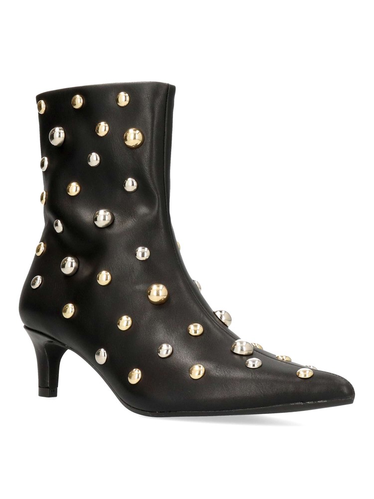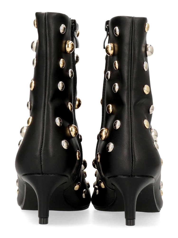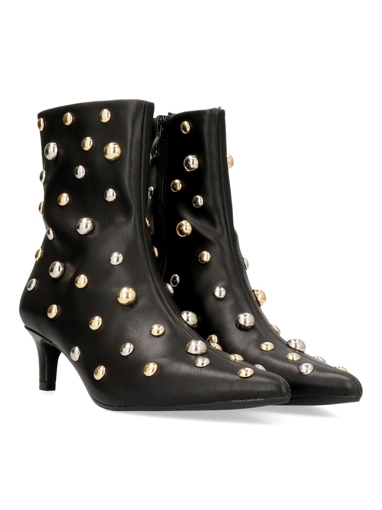 Botines de mujer en color negro. Cierre de cremallera lateral. Detalle de tachas metalizadas ne la caña. Fabricada en piel sintética, con suela de goma. Tacón fino de 5 cm. Color negro. Botín original, versátil y cómodo, ideal con tus looks de invierno.