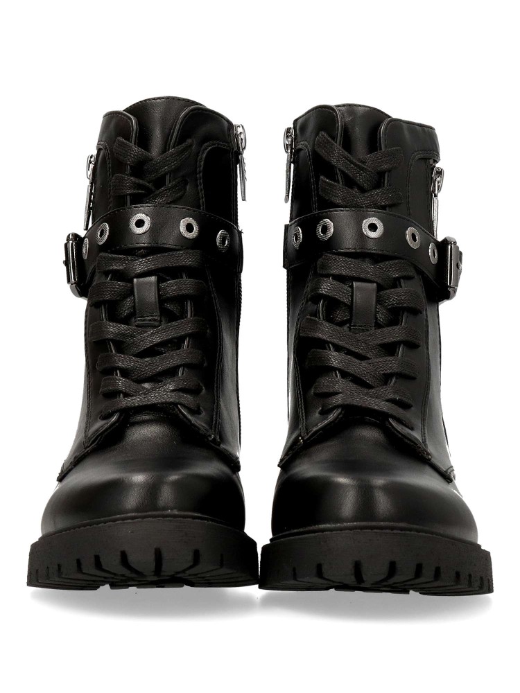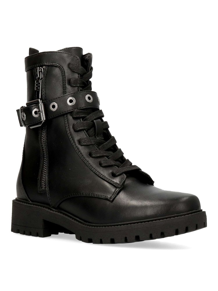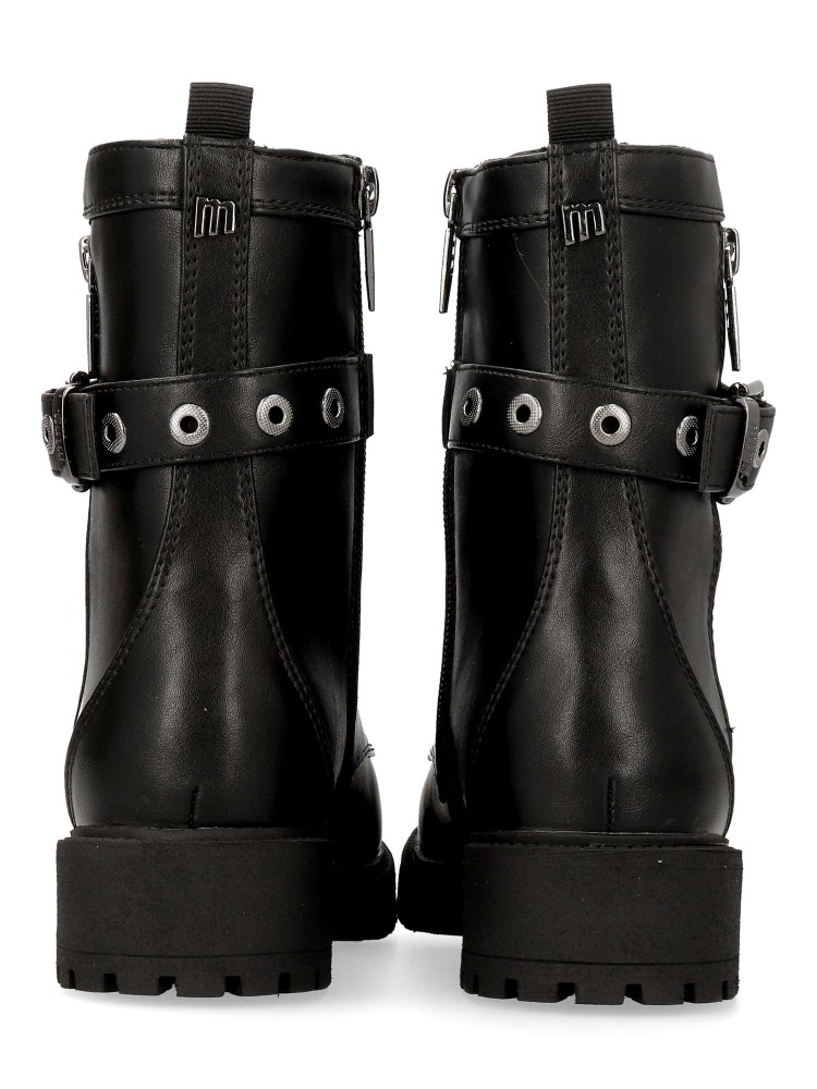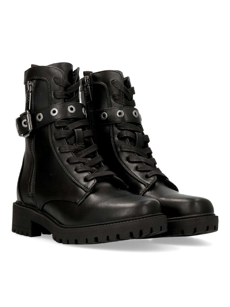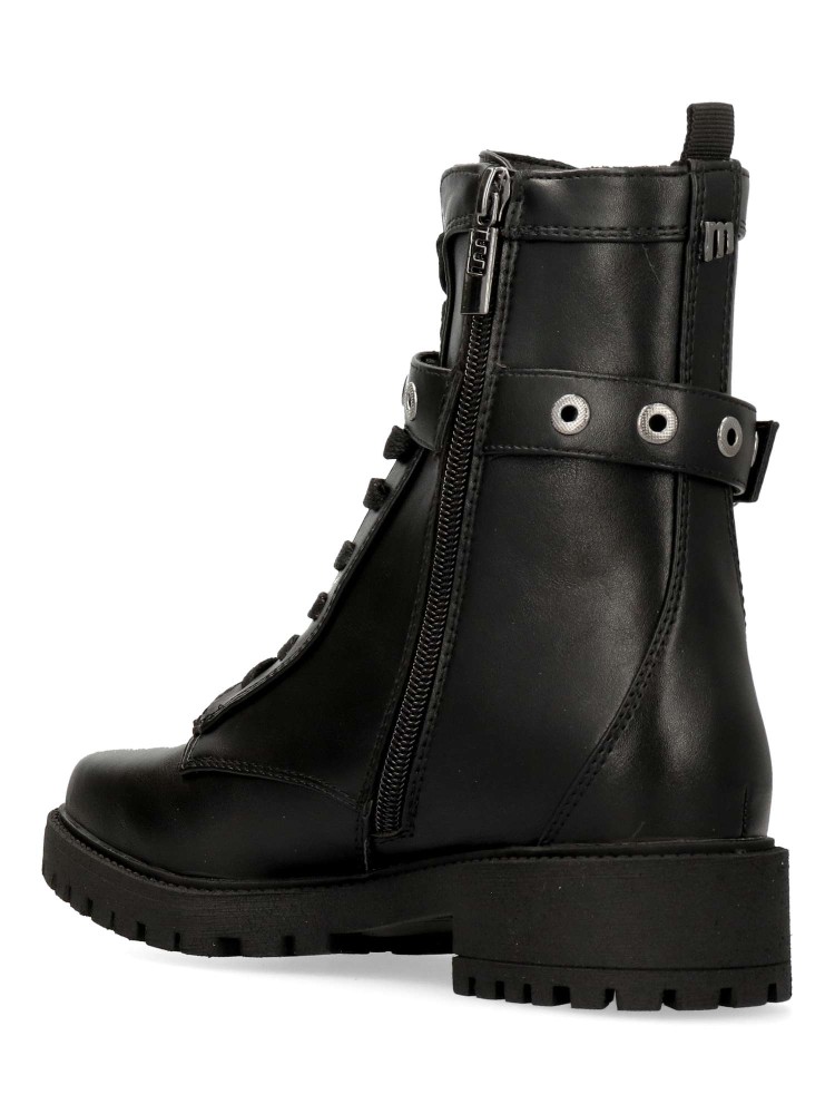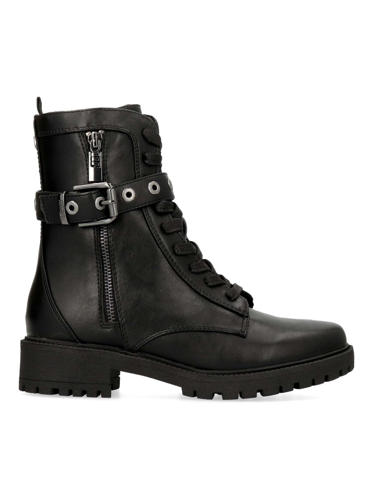 Botín Campa de estilo biker de color negro para mujer de Mustang. Cierre de cremallera y cordones. Con silueta robusta, detalles metálicos y correa con hebilla decorativa. Toque versátil para el uso diario con un aire militar marcado.