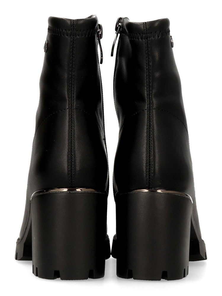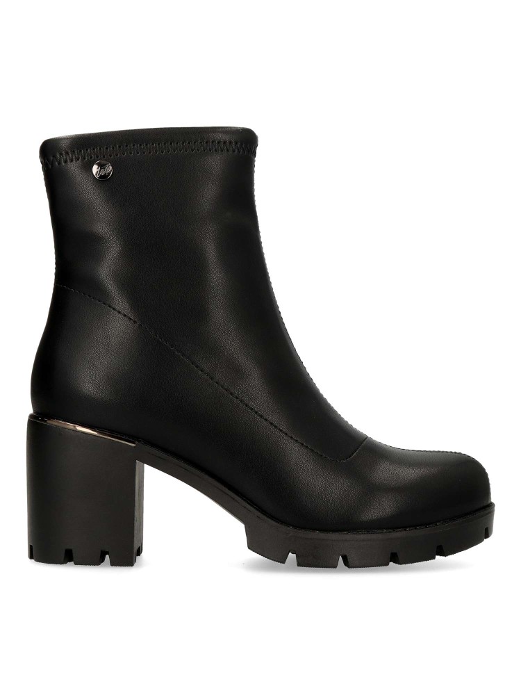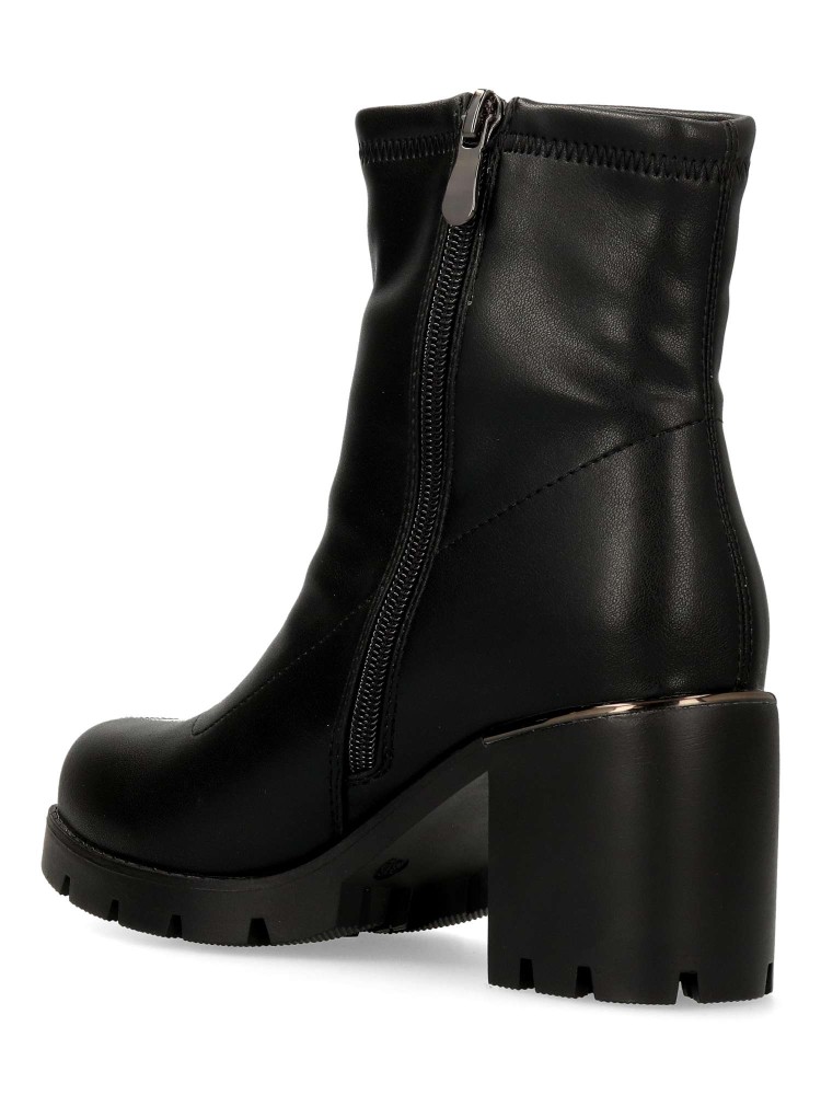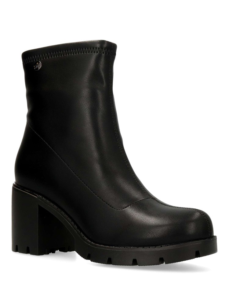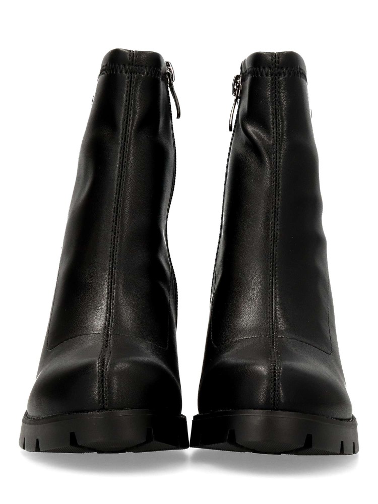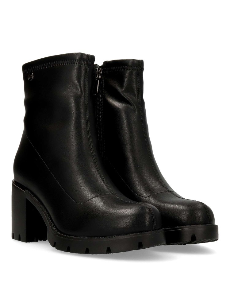 Botín de mujer con cierre de cremallera lateral. Botines cómodos, fabricados en piel sintética elástica. Color negro. Tacón de 6,5 cm. Caña de 14 cm. Colección con mucha personalidad para combinarlos con cualquier outfit. 100% vegano.
