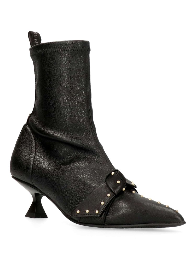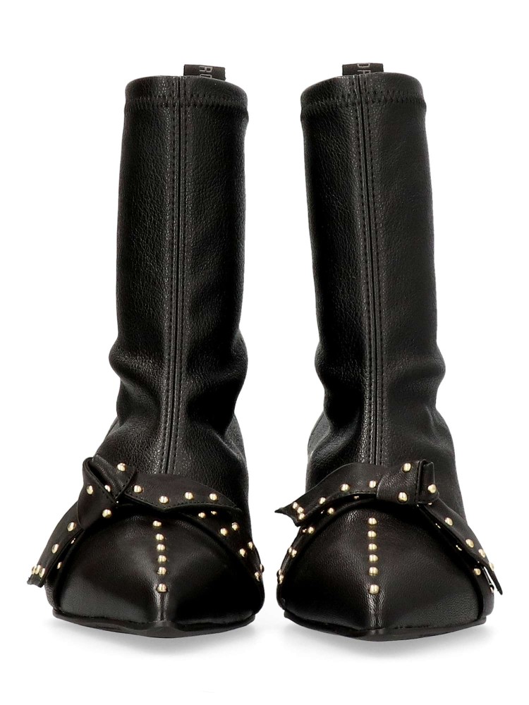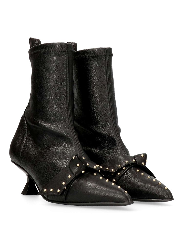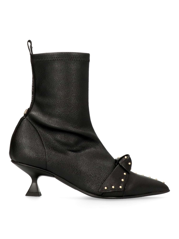 Botín de mujer con tacón bajo, confeccionados en piel de primera calidad. Suela de goma. Plantilla de piel acolchada. Detalle de lazo con tachuelas en el frontal. Un diseño con el que dar un toque de originalidad a tus looks de la temporada.