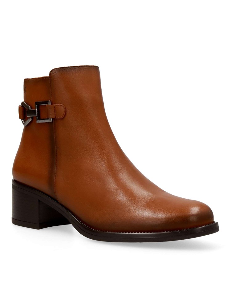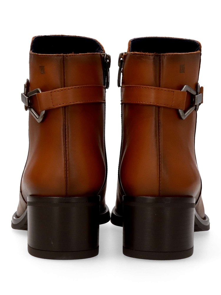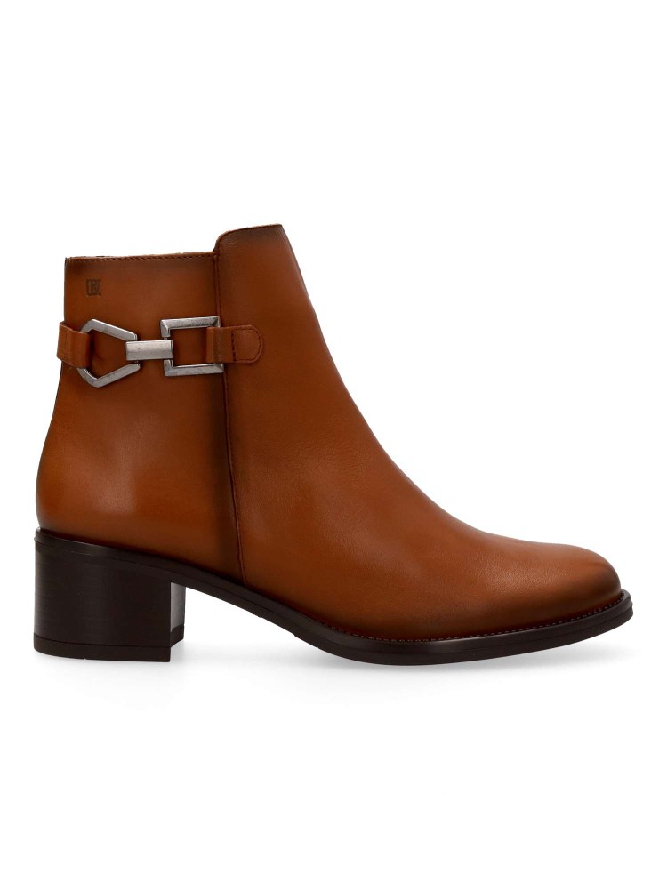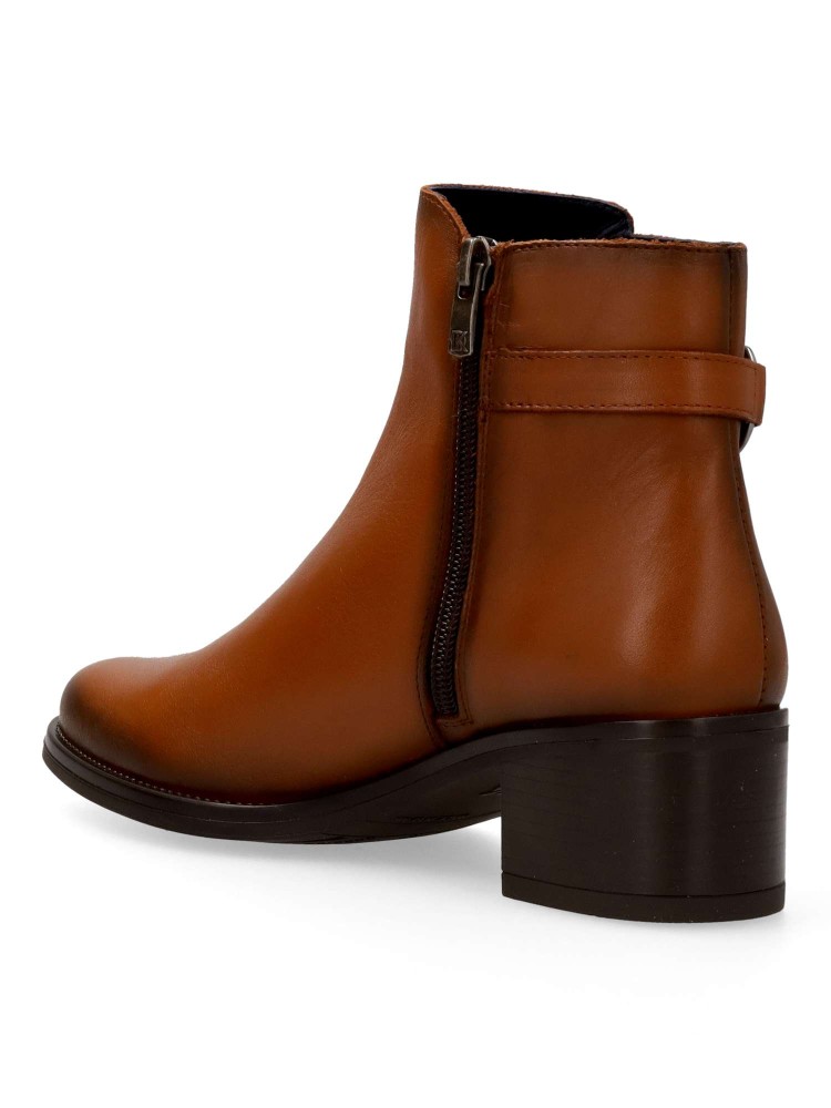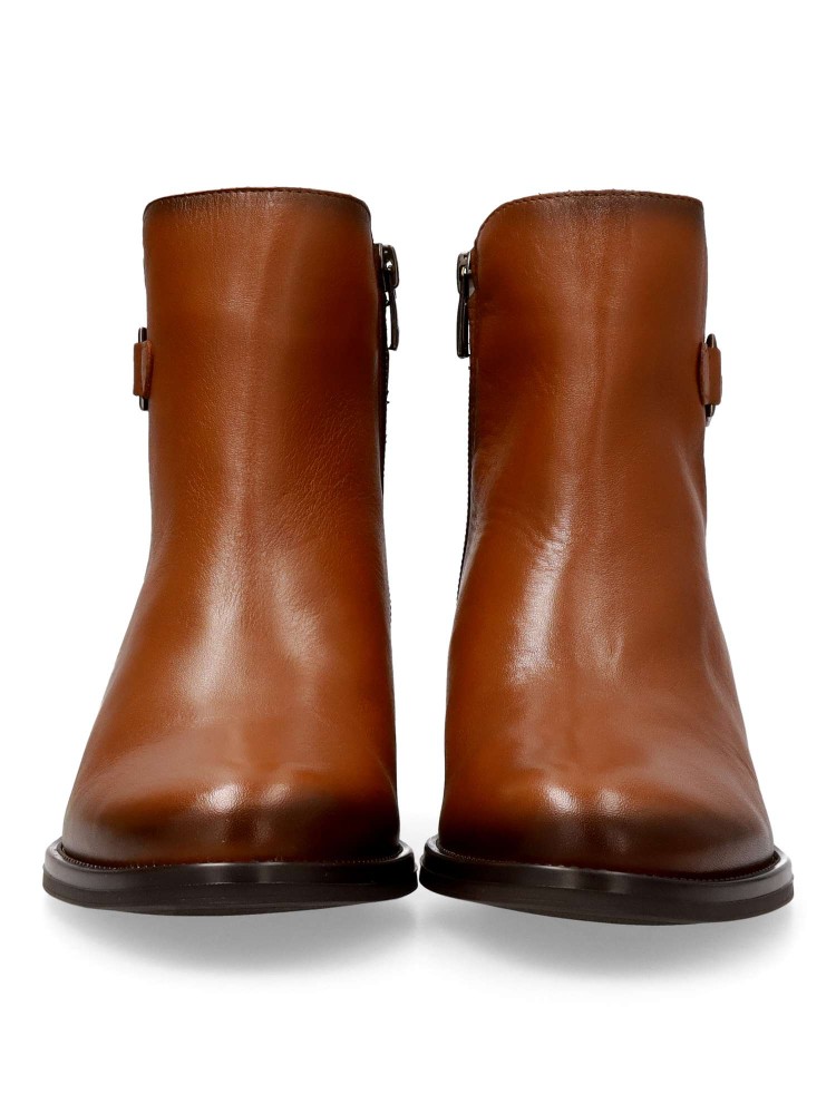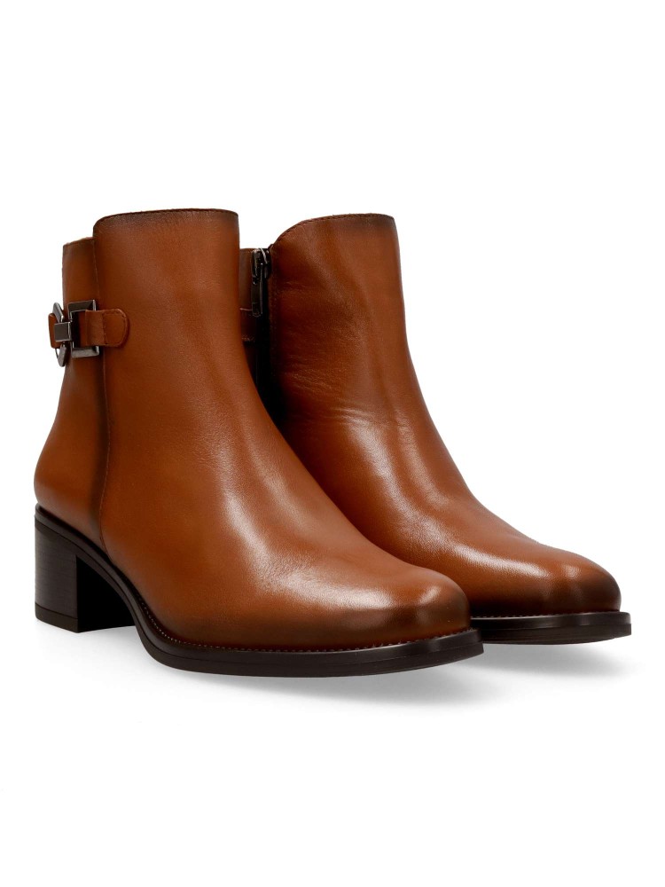 Botín de mujer con cierre de cremallera lateral. Fabricados en piel con suela de goma. Color cuero. Caña de 12 cm. Cómodo y versátil que combinará tanto con registros elegantes como más relajados como un vestido midi o unos vaqueros.