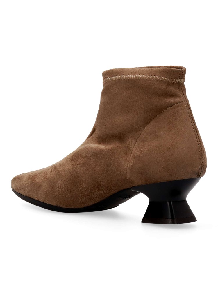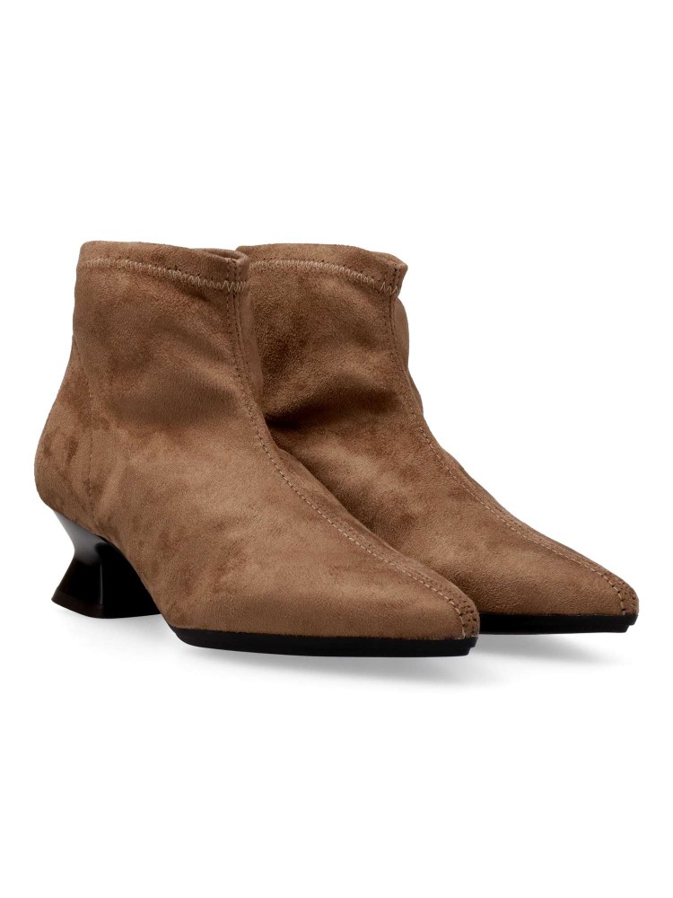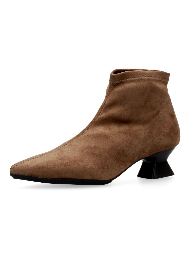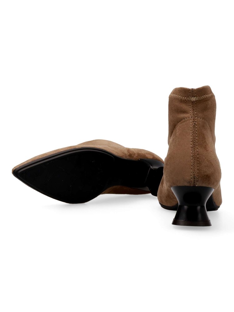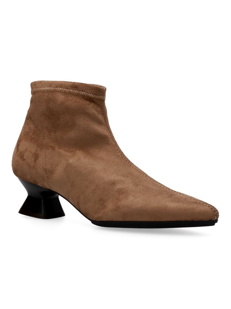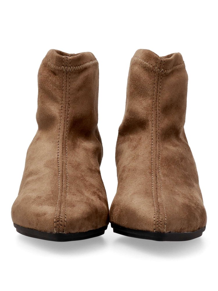 Botín de mujer cómodo. Fabricados en napa elástica sintética suave. Forro interior textil suave y cálido. Tacón y puntera fina. Altura tacón 6 cm. Caña de 11 cm. Color fango. Diseño cómodo, elegante y versátil, fácil de combinar con tus looks de invierno.