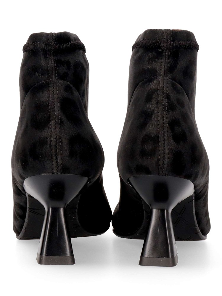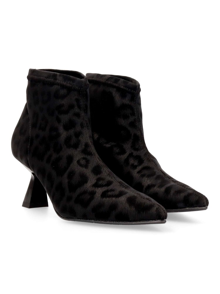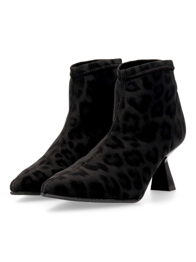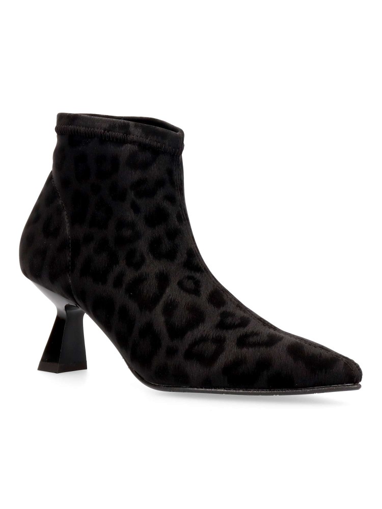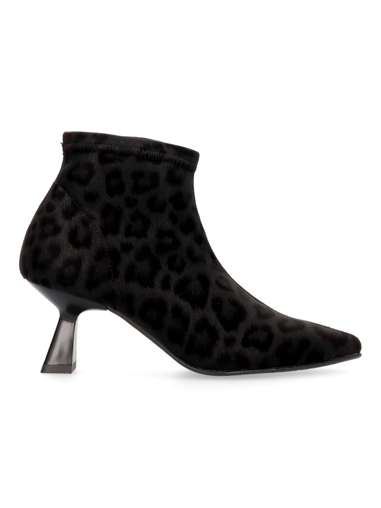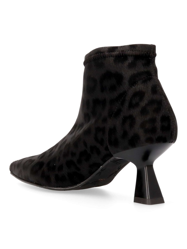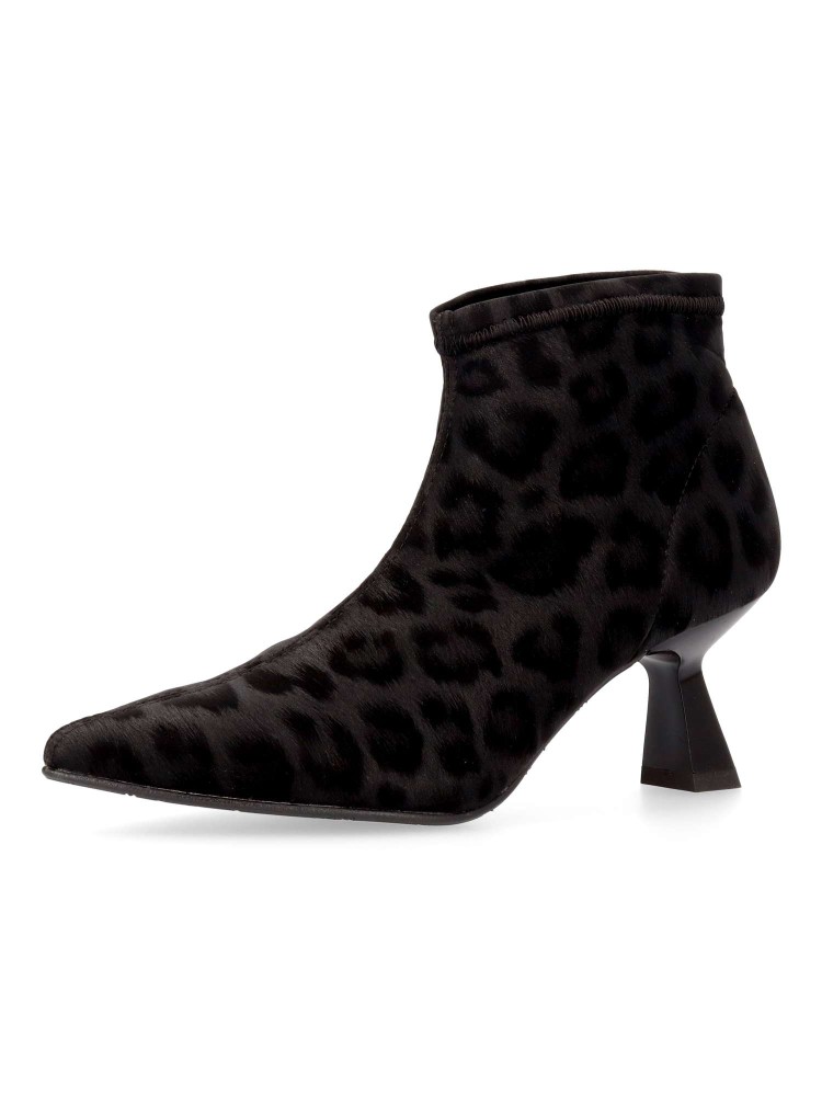 Botín de mujer con detalle estampado print animal. Fabricados en napa elástica sintética. Tacón y puntera fina. Altura tacón 6 cm. Caña de 11 cm. Color negro. Diseño cómodo, elegante y versátil, fácil de combinar con tus looks de invierno.