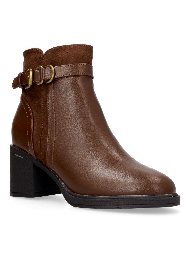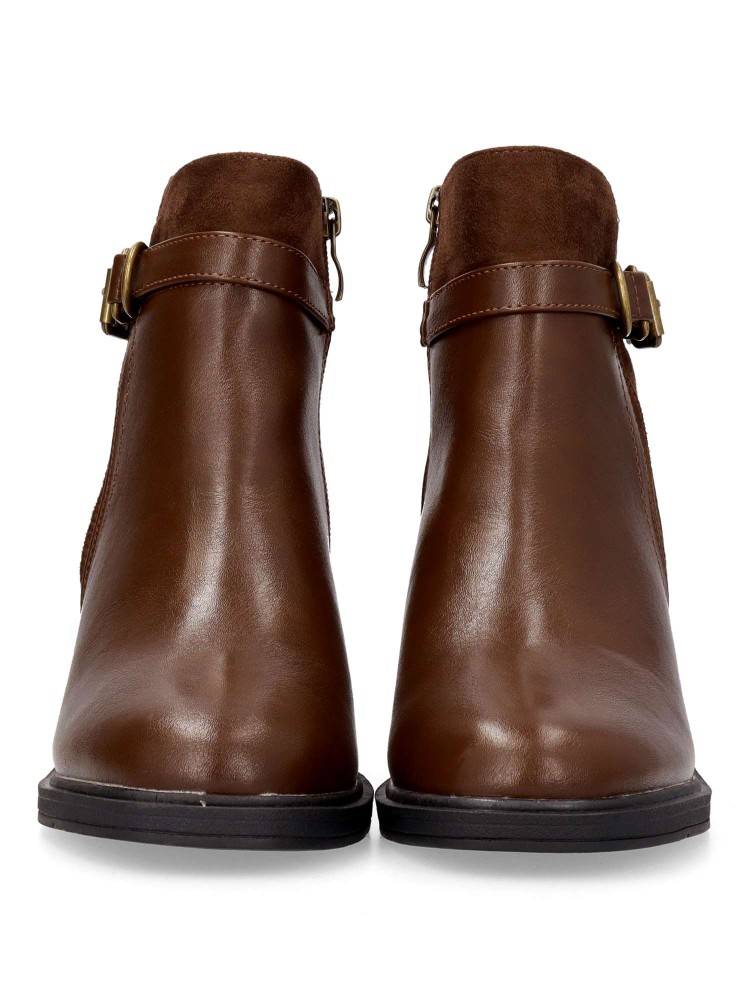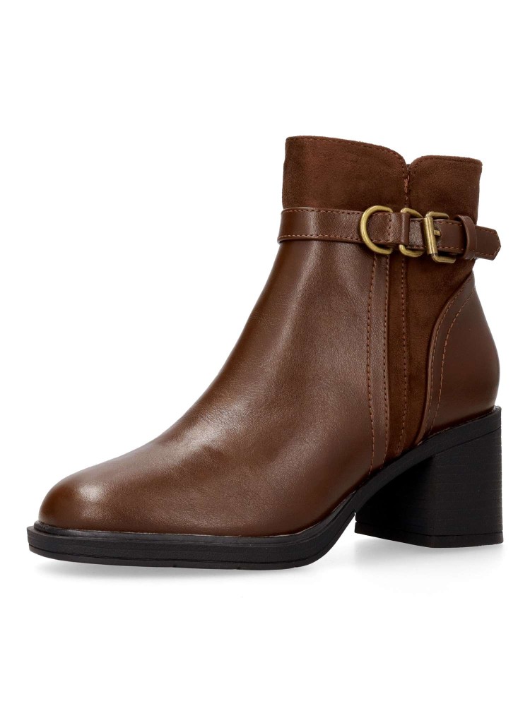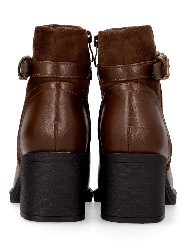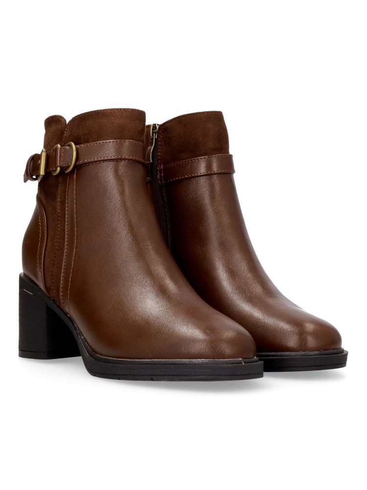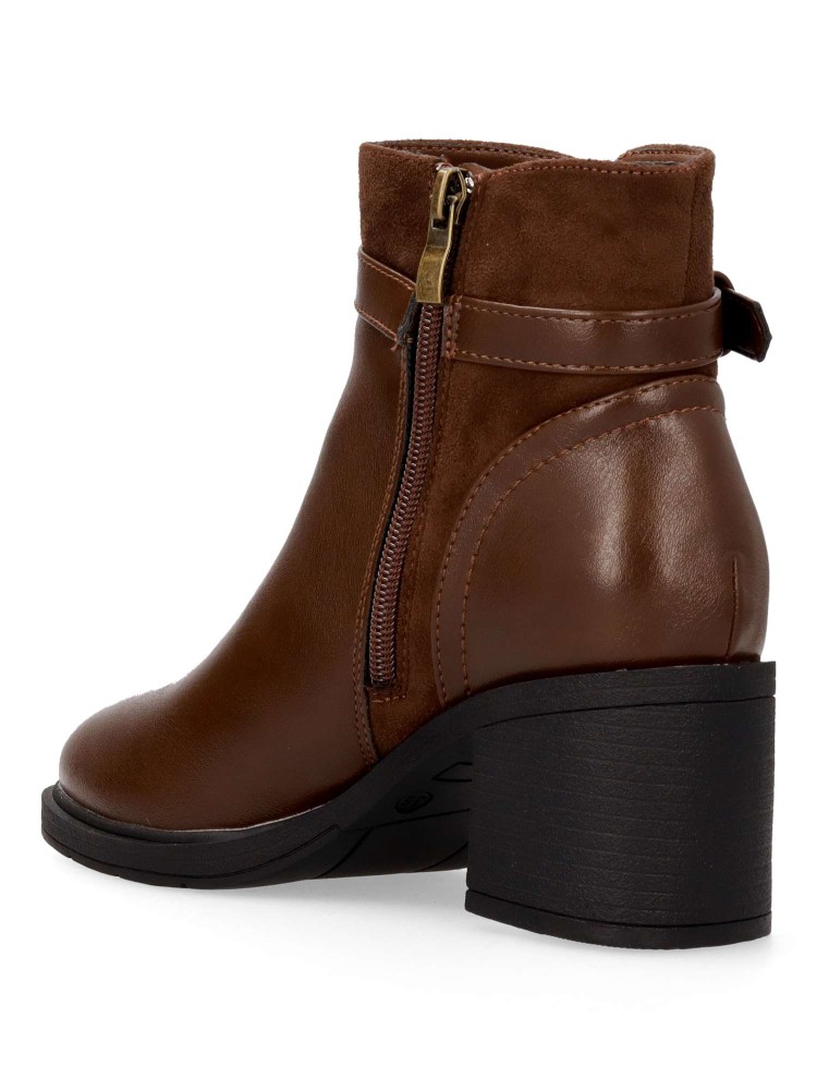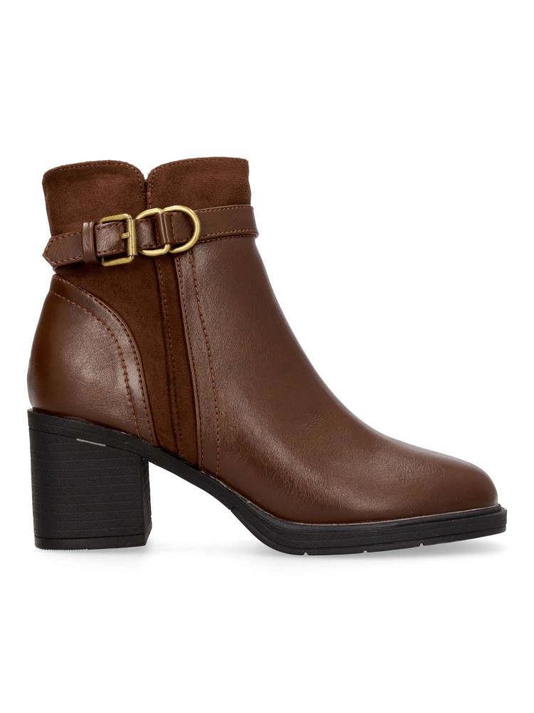 Botín de mujer con cierre de cremallera. Fabricados en piel sintética color marrón. Caña de 12 cm. Su diseño versátil con detalle de hebilla le da un toque moderno y sofisticado. Un botín indispensable que se adaptará a múltiples estilos.