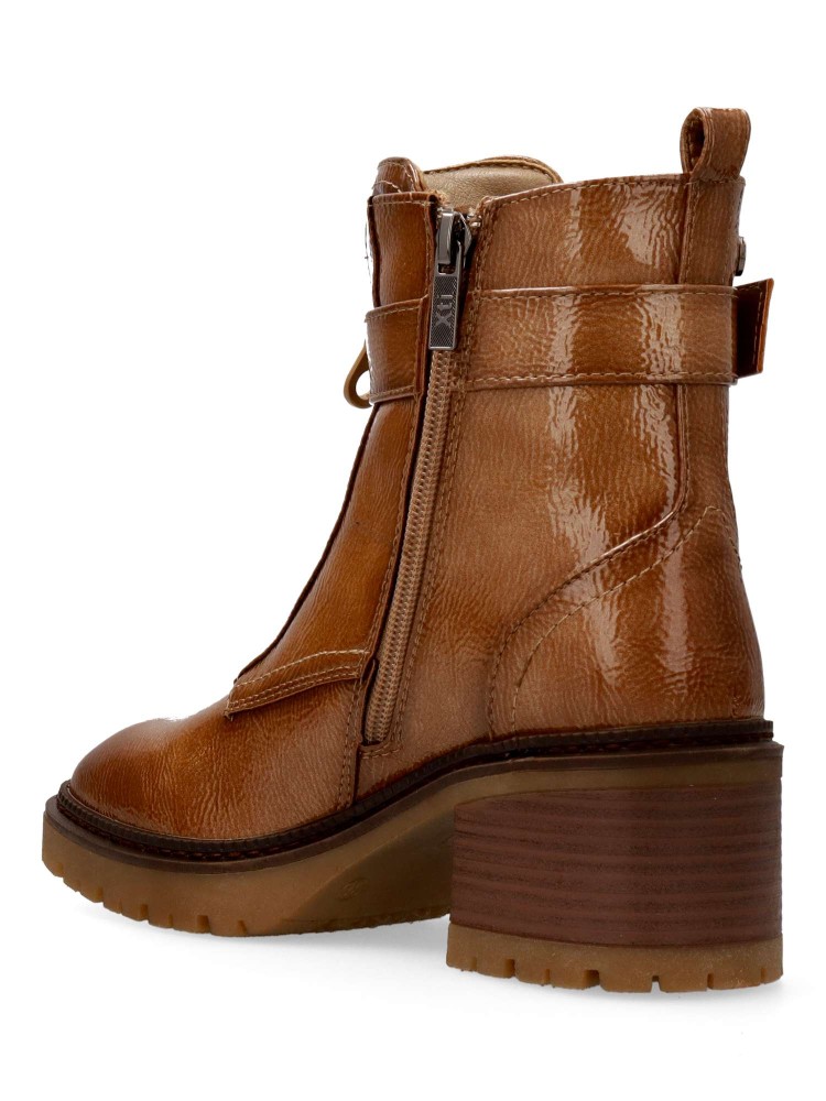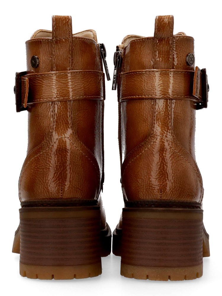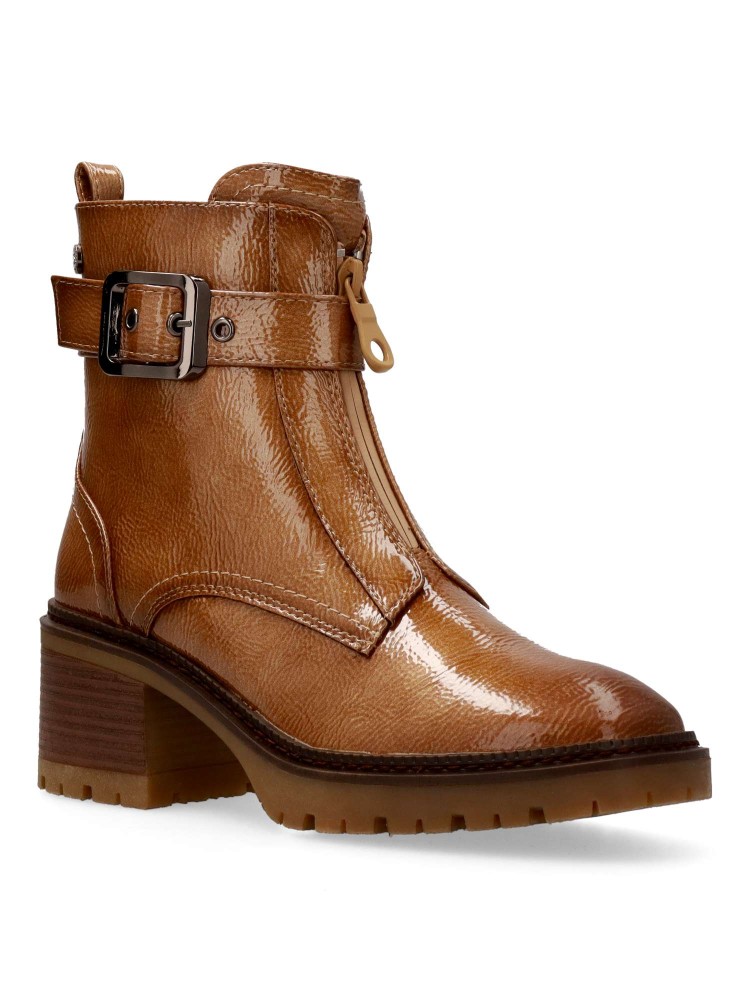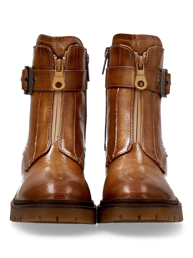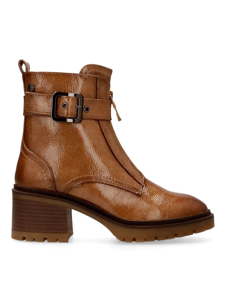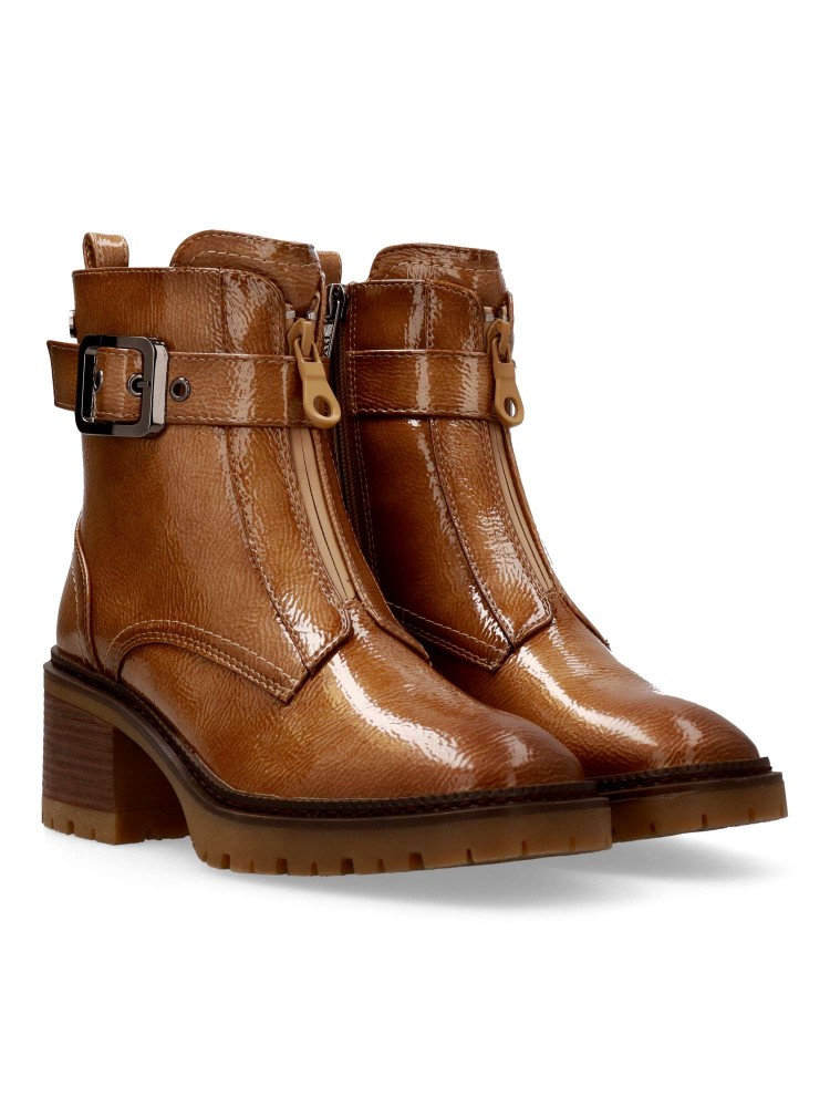 Botín cómodo de mujer, fabricados en piel sintética charol. con suela de goma. Cierre de cremallera al empeine. Tira con hebilla decorativa. Estas botas versátiles, son la incorporación perfecta a tu armario, esta temporada invernal. Certificado vegano.