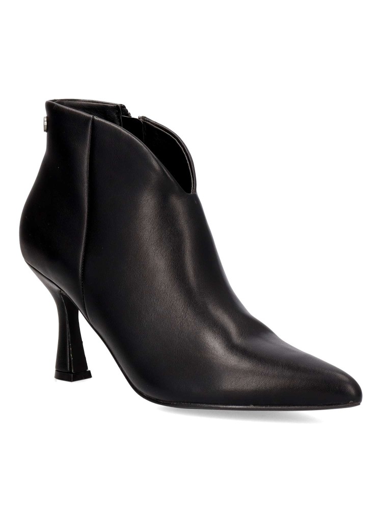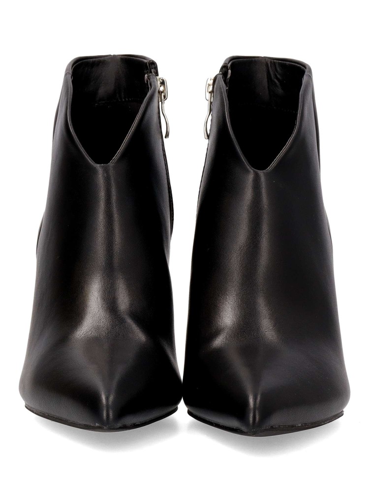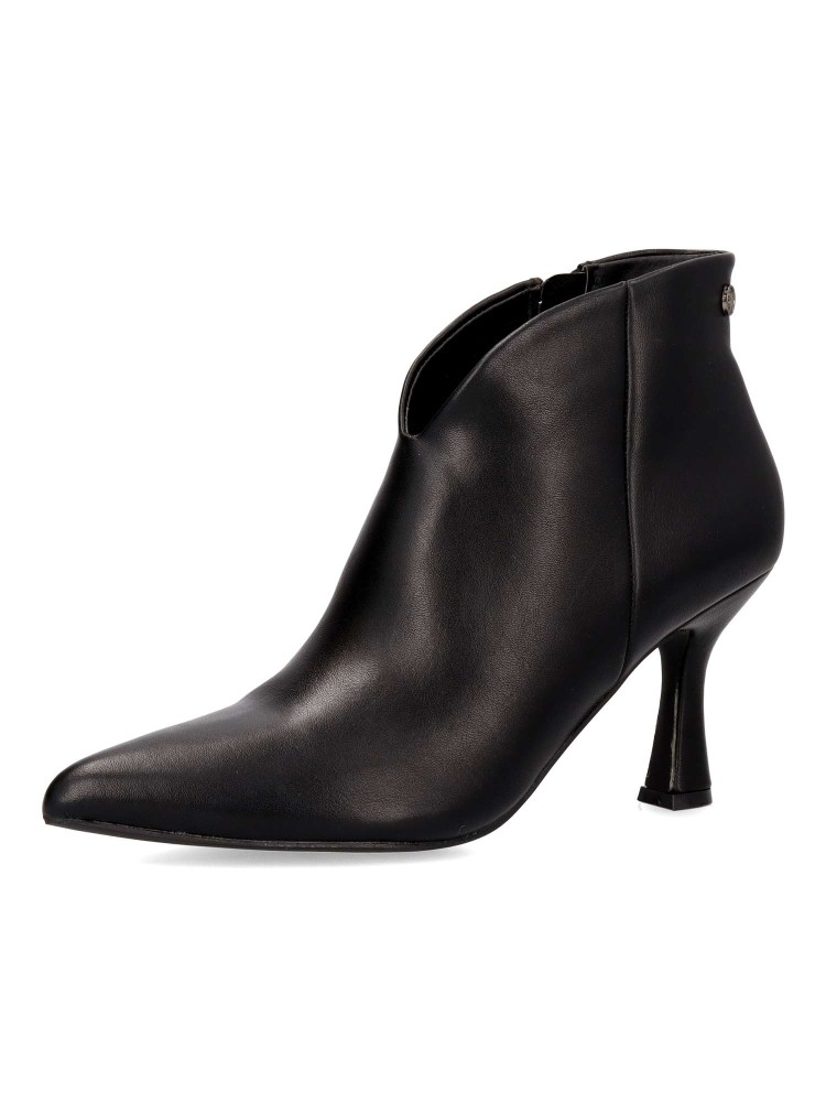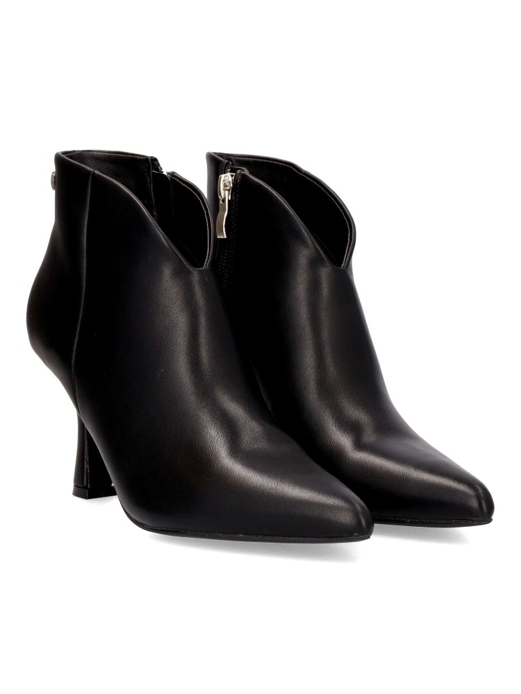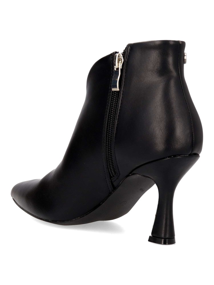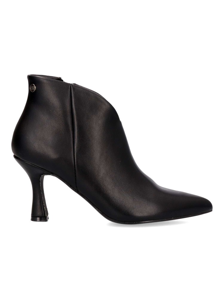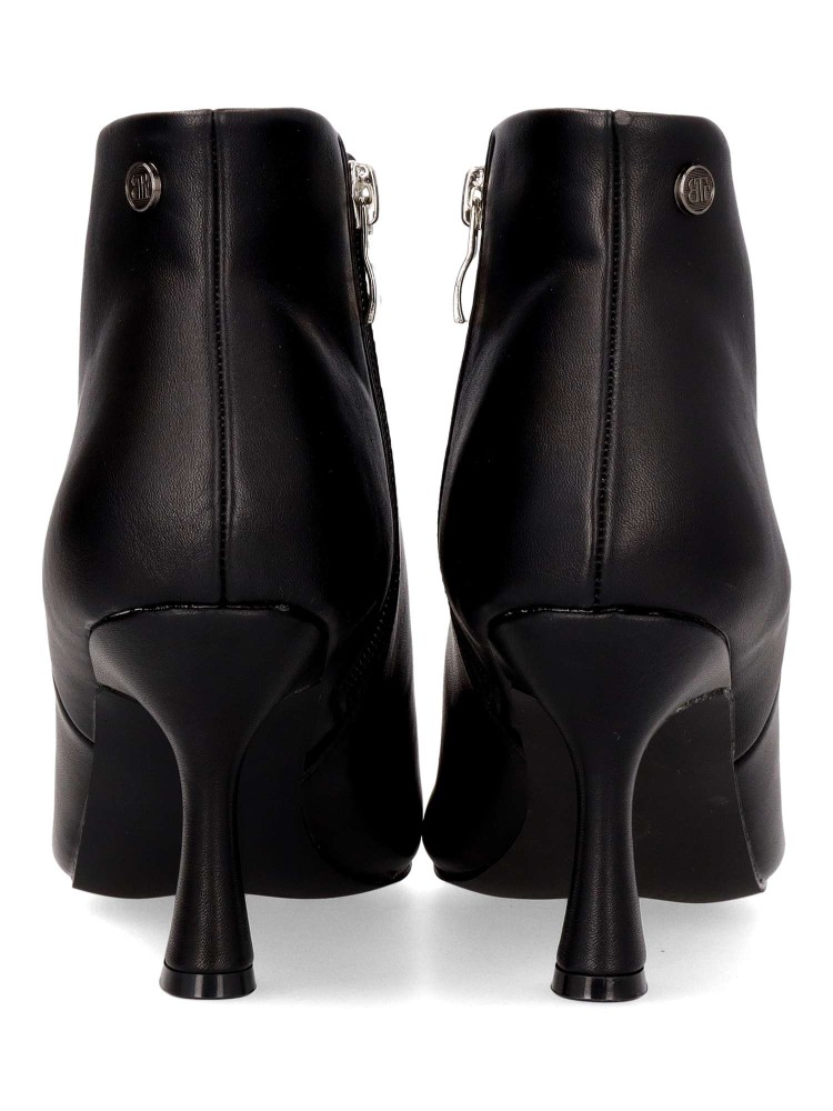 Botín bajo de mujer, con cierre de cremallera lateral. Fabricados en piel sintética, con suela de goma. Planta acolchada. Color negro. Puntera y tacón fino de 7 cm. Caña de 10 cm. Diseño elegante, cómodo y versátil, ideal con tus outfits de temporada.
