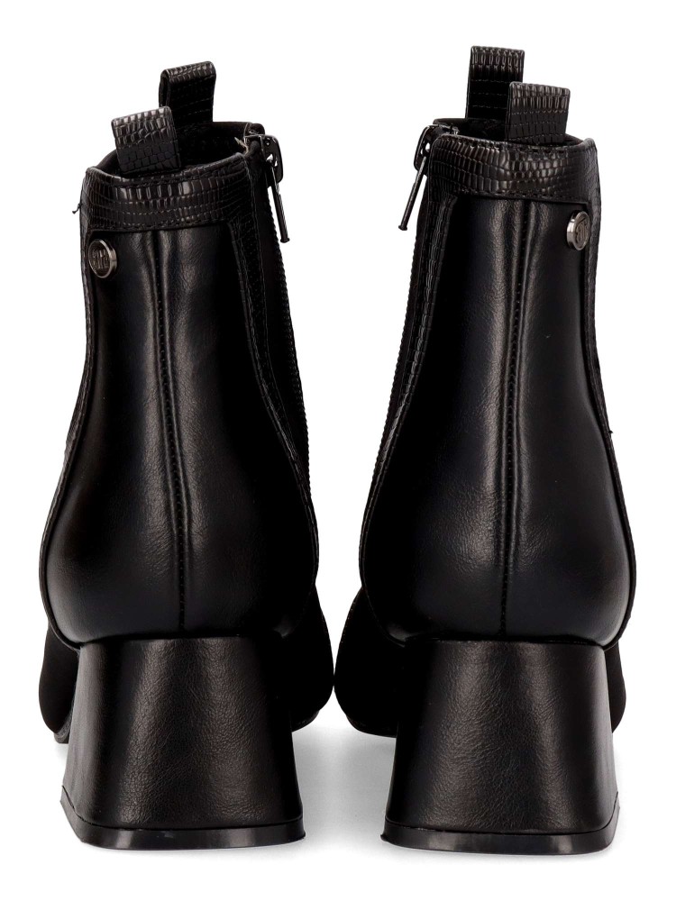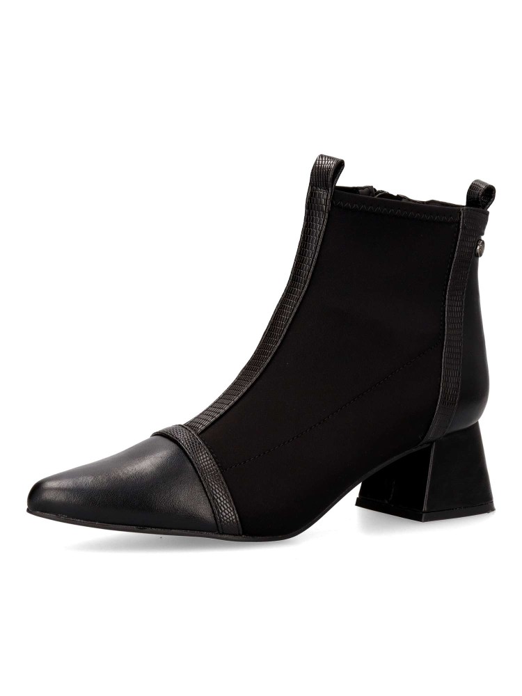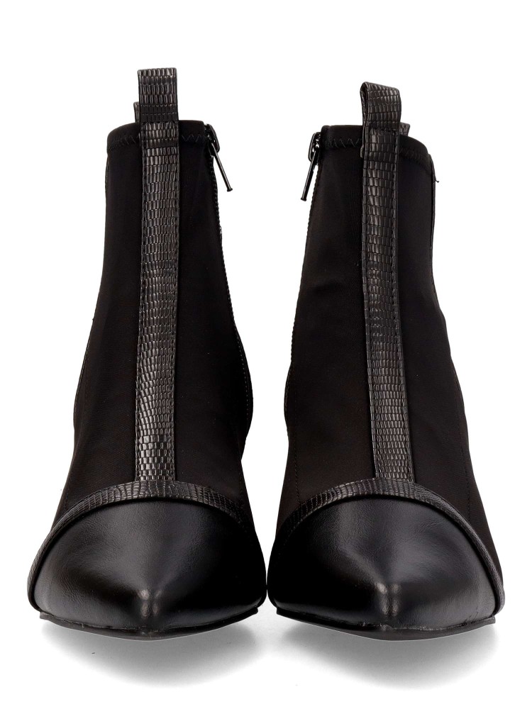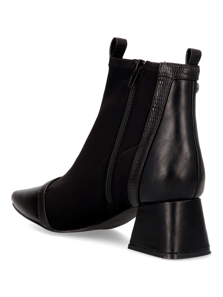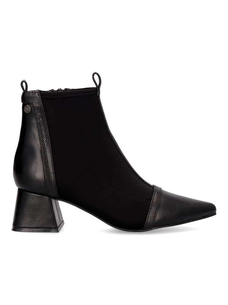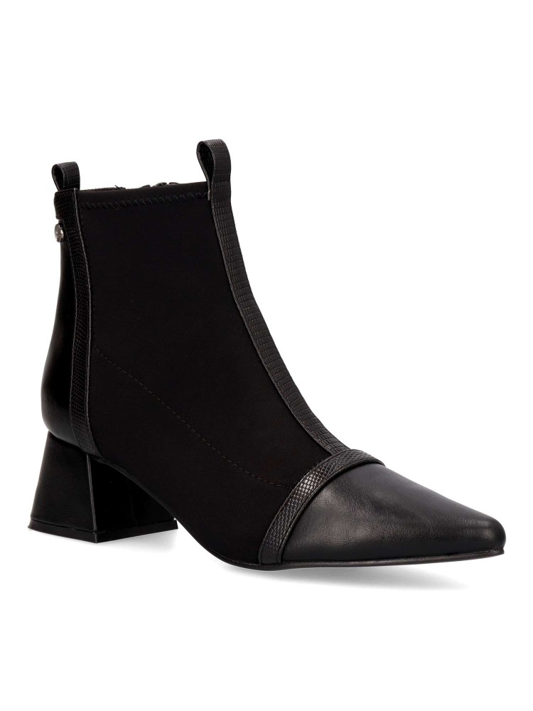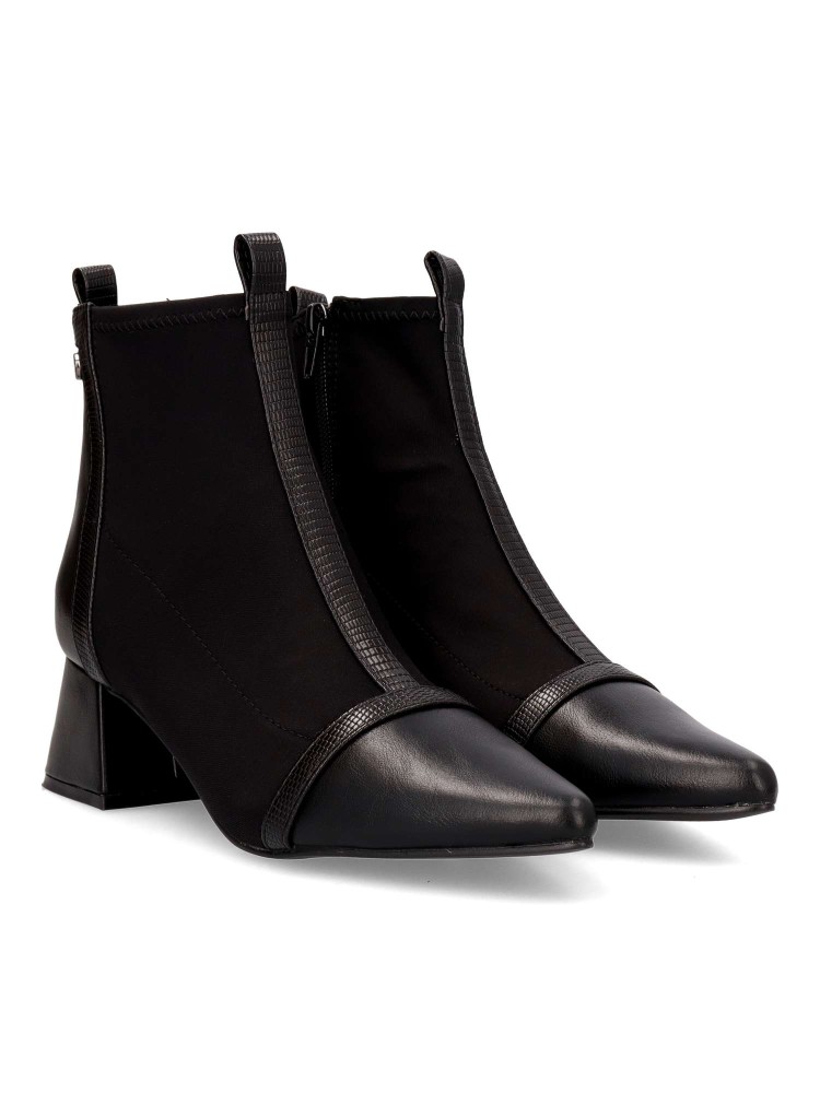 Botines de mujer, con punta fina y tacón ancho de 5 cm. de altura. Fabricados en material sintético y textil elástico, con suela de goma. Color negro. Caña de 12 cm. Diseño versátil, cómodo y elegante, que no puede faltar en tu fondo de armario.
