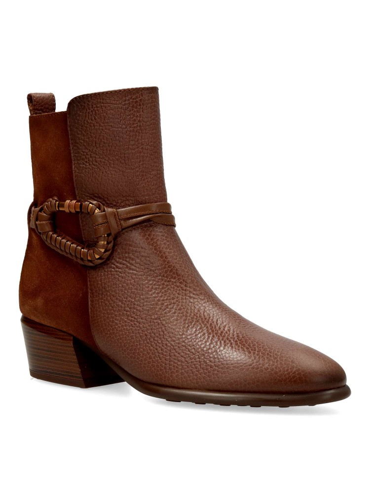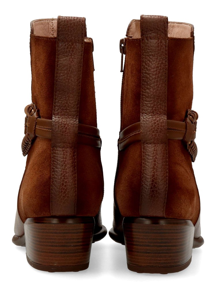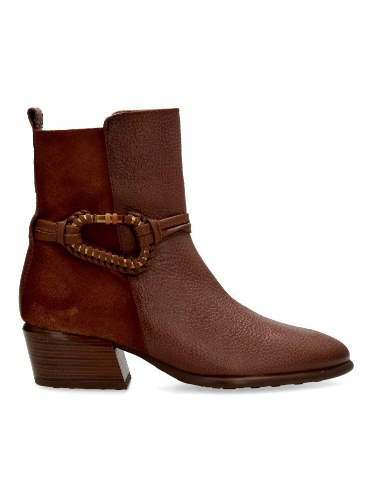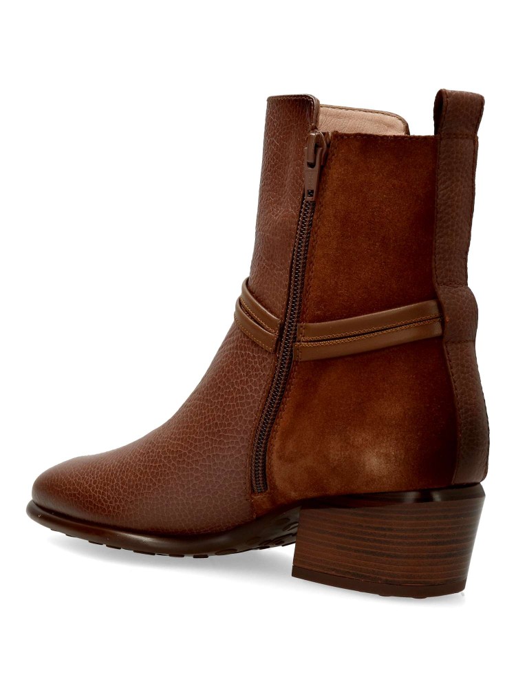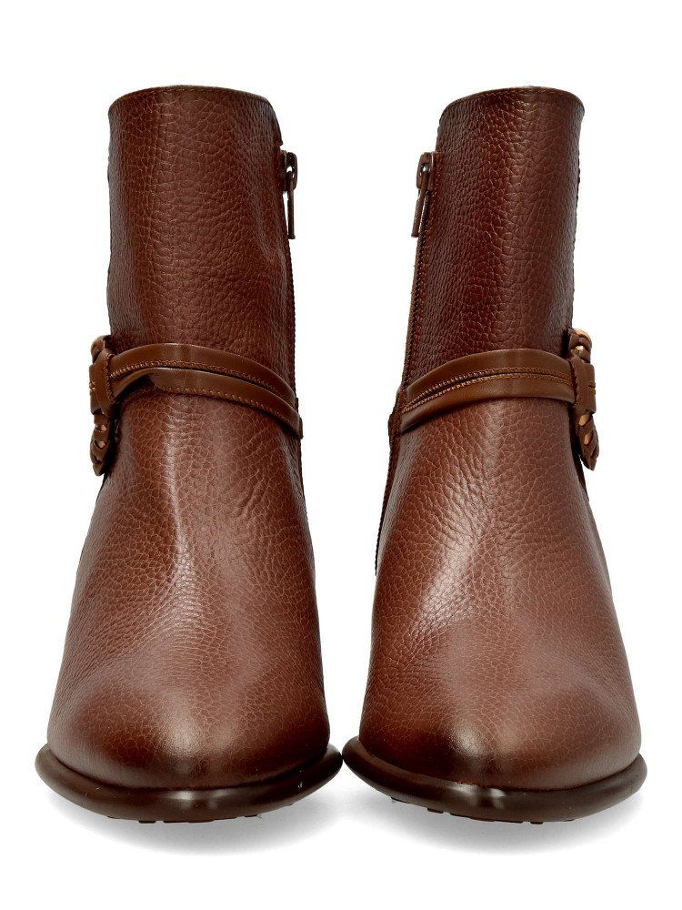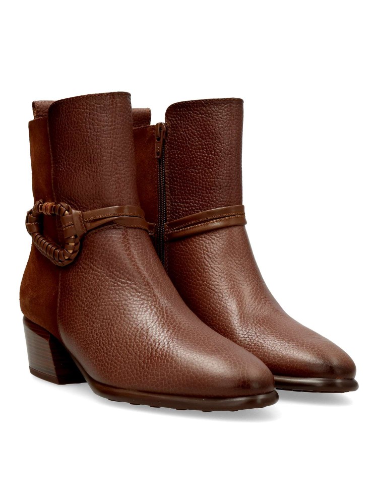 Botines de mujer, fabricados en piel vacuno con suela de goma. Detalle de tiras y mosqueton forrado. Tacón efecto madera de 4 cm. Tecnología Triflow: triple almohadillado que absorbe los impactos y aporta un efecto acolchado al caminar.