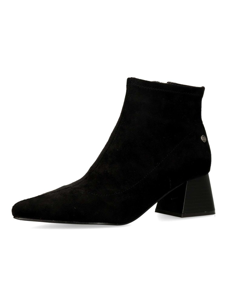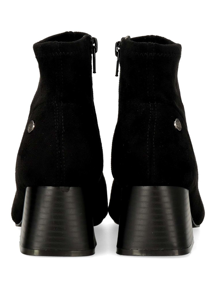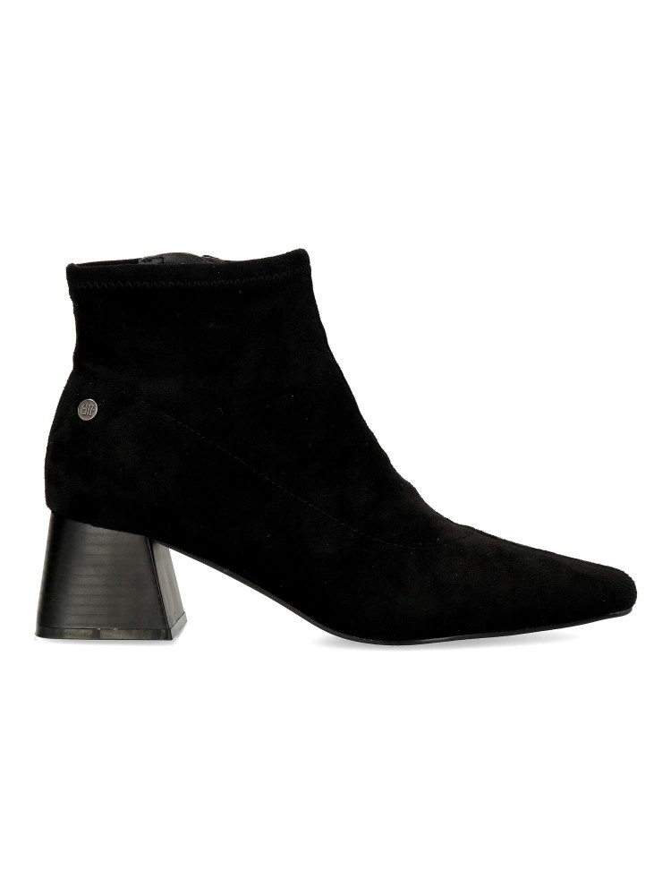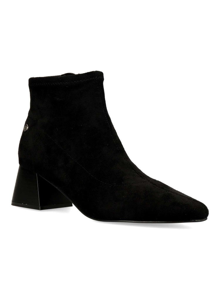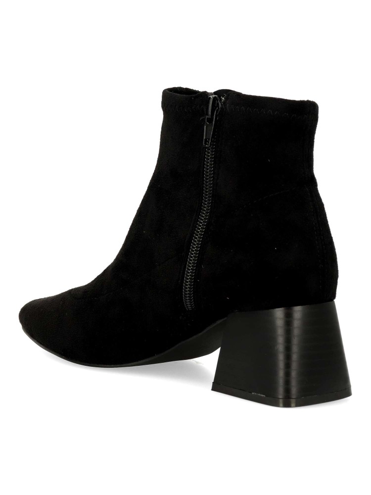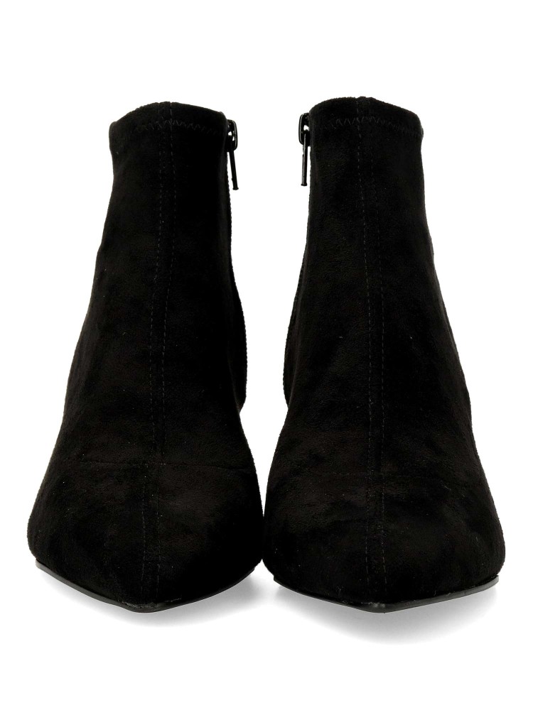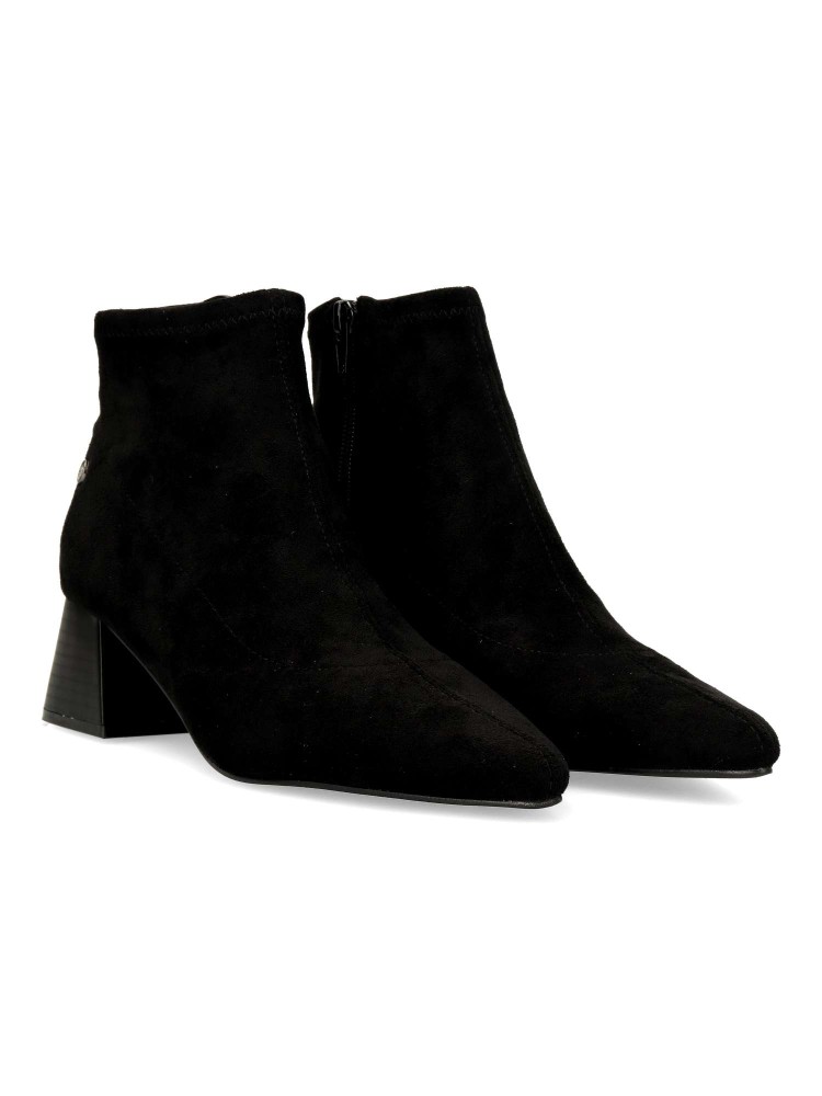Botines de mujer, con punta fina y tacón ancho de 5 cm. de altura. Fabricados en textil antelina elástico, con suela de goma. Color negro. Caña de 11 cm. Diseño versátil, cómodo y elegante, que no puede faltar en tu fondo de armario.