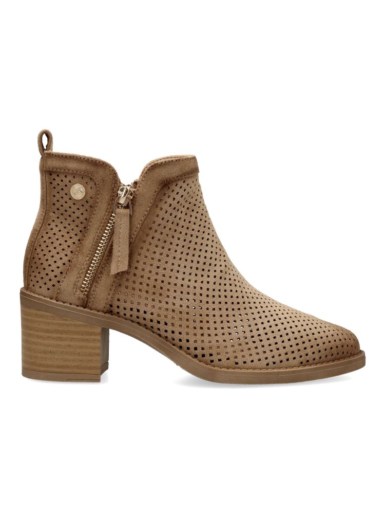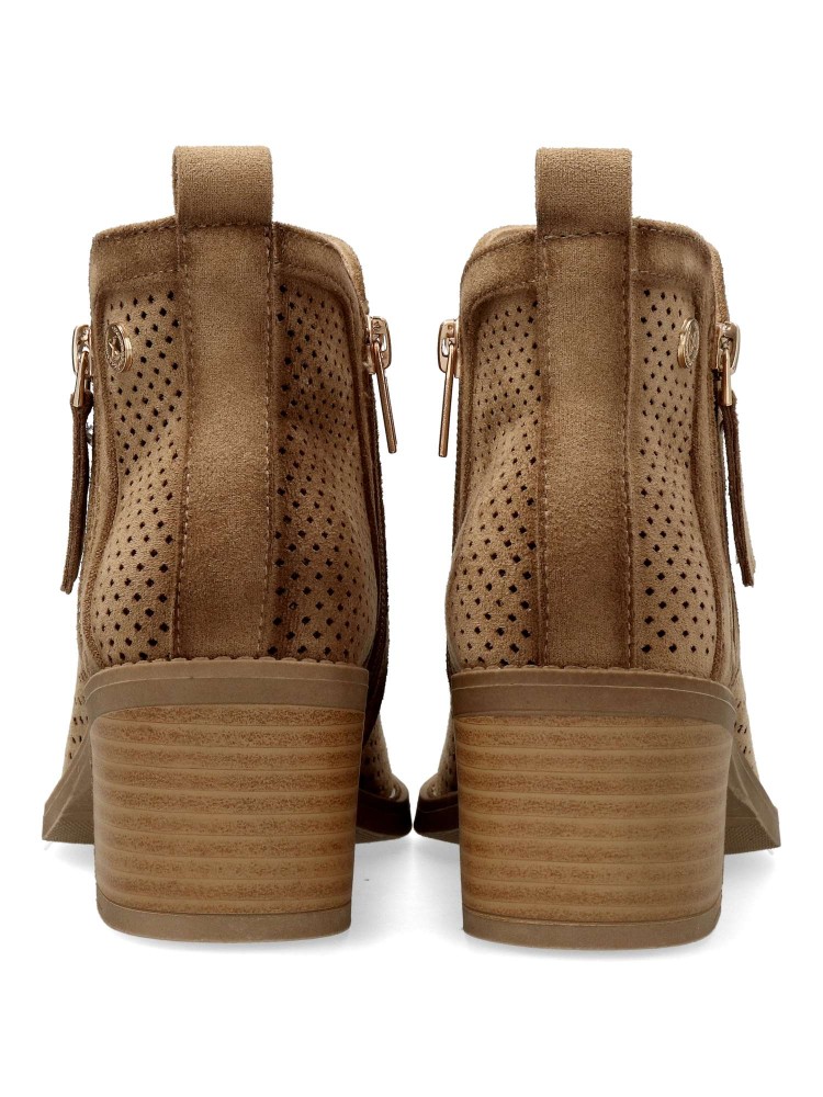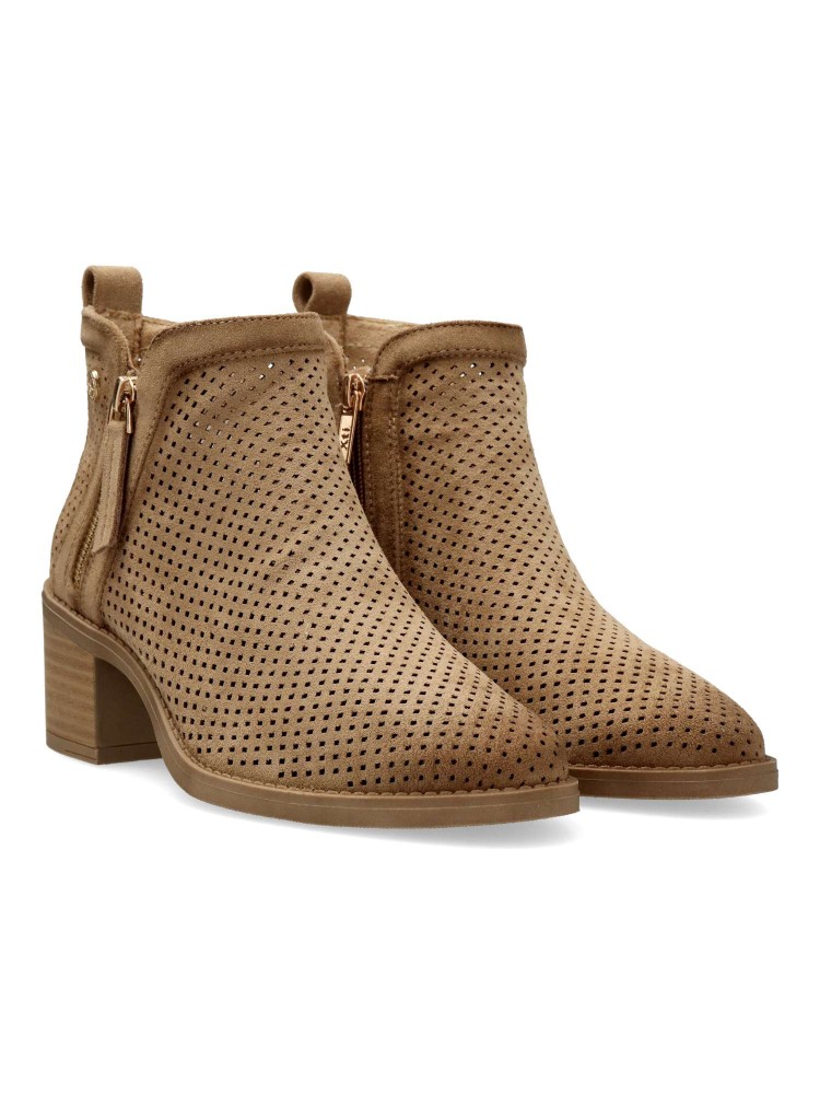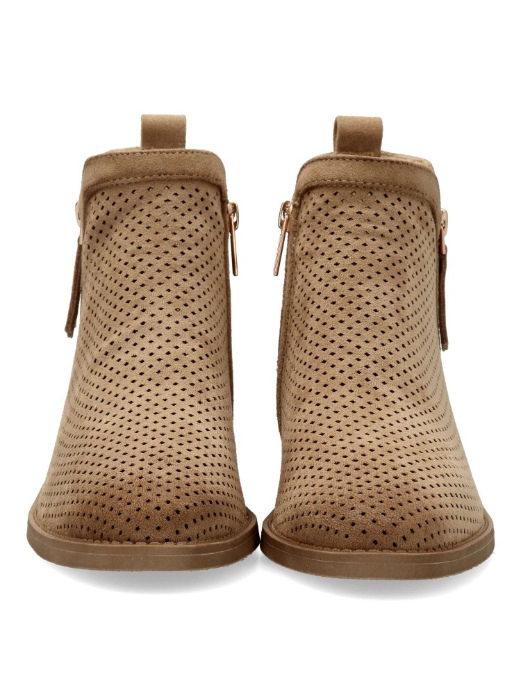 Botines de mujer estilo campero. Fabricados en antelina troquelada, con suave difumino. Cierre de cremallera lateral y otra decorativa. Atura tacón 5,5 cm. y caña de 10 cm. Perfectas para completar tus mejores looks. Certificado vegano.