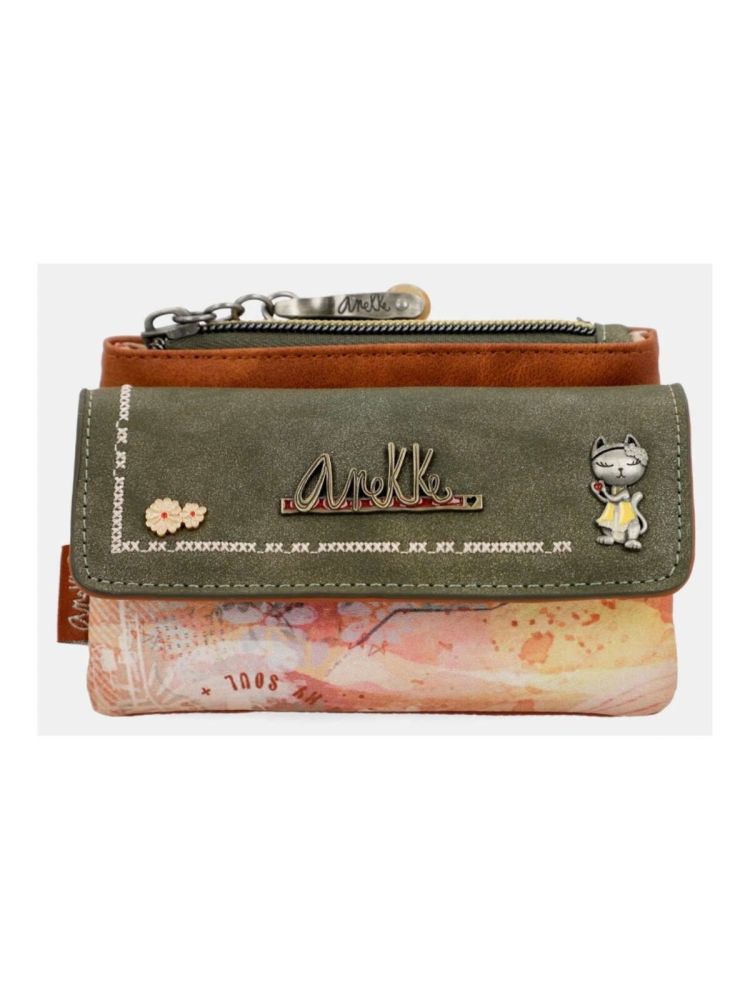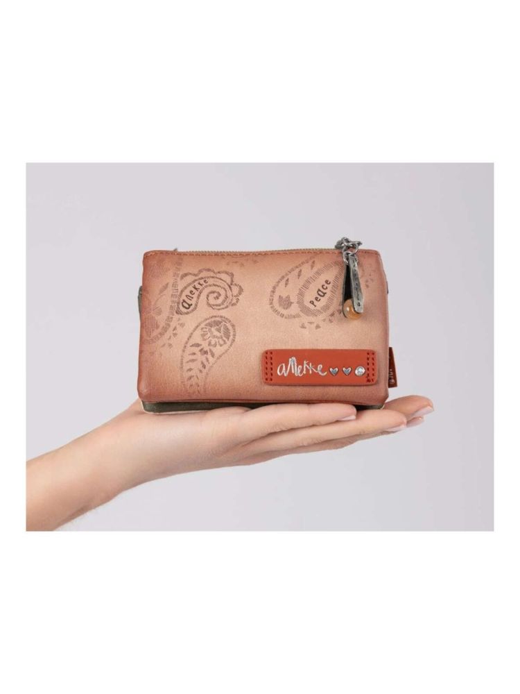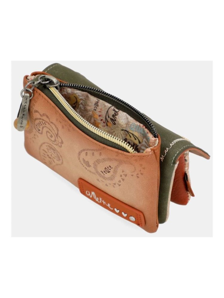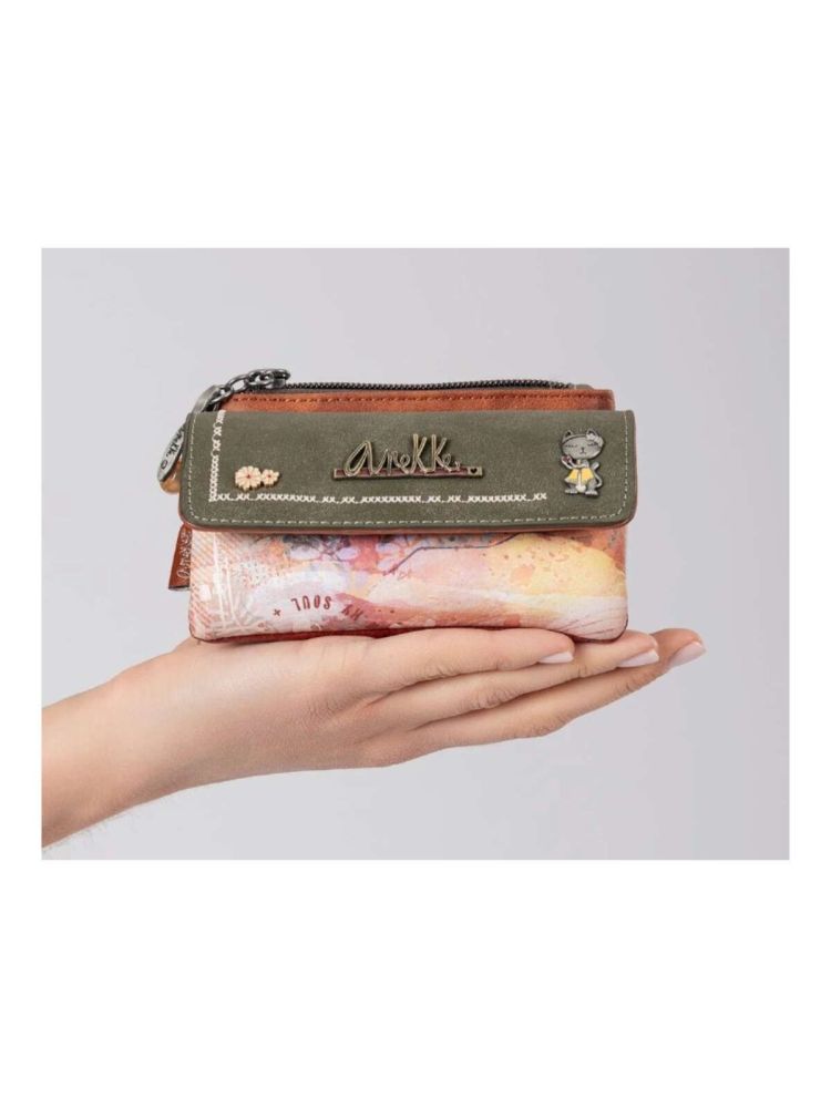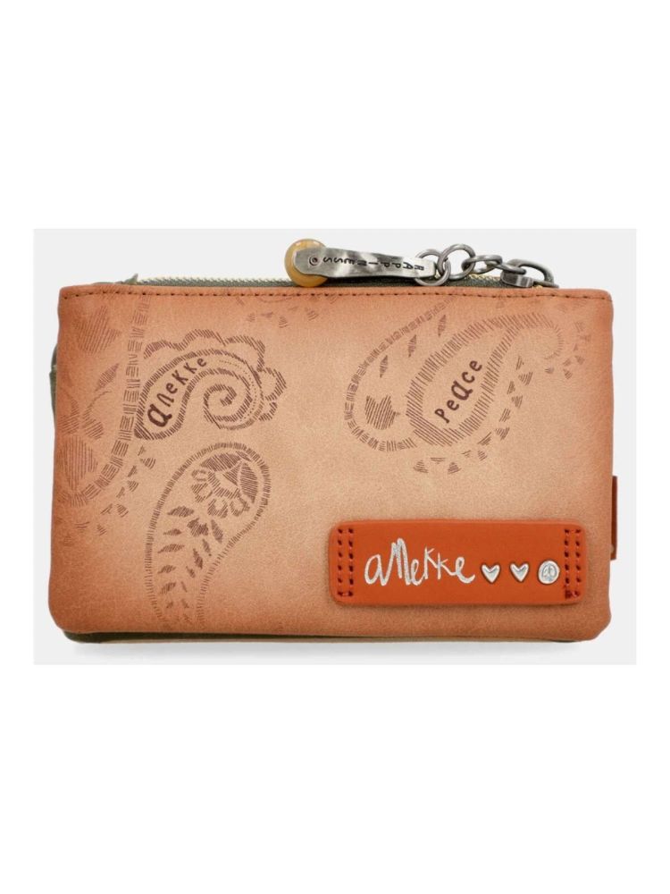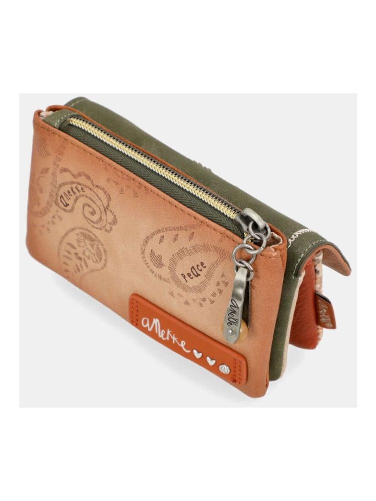 Monedero de la colección Peace & Love. Cuenta con solapa y dos compartimentos y otro con cremallera. Detalles y frases inspiradoras por varios sitios. Medidas (Largo x Alto x Ancho): 14/8/3 cm.