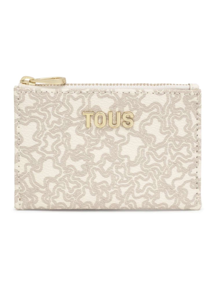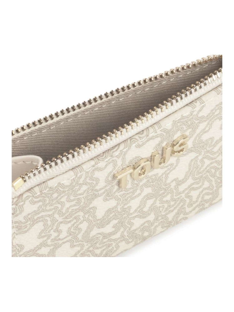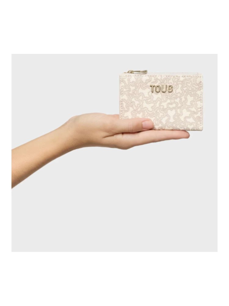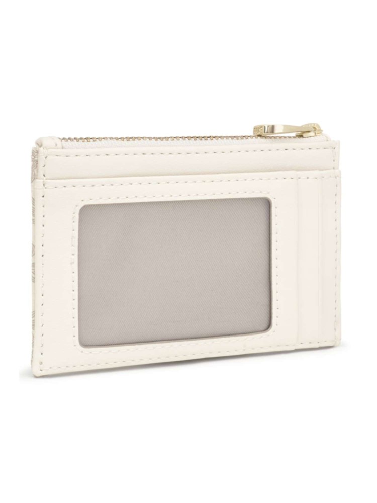 Monedero tarjetero de lona con detalles de poliuretano en color beige. Compartimento especial para monedas con cierre de cremallera. En la parte trasera cuenta con tres ranuras para tarjetas. Medidas (alto x ancho x fondo): 8,3 x 11,2 x 1 cm.