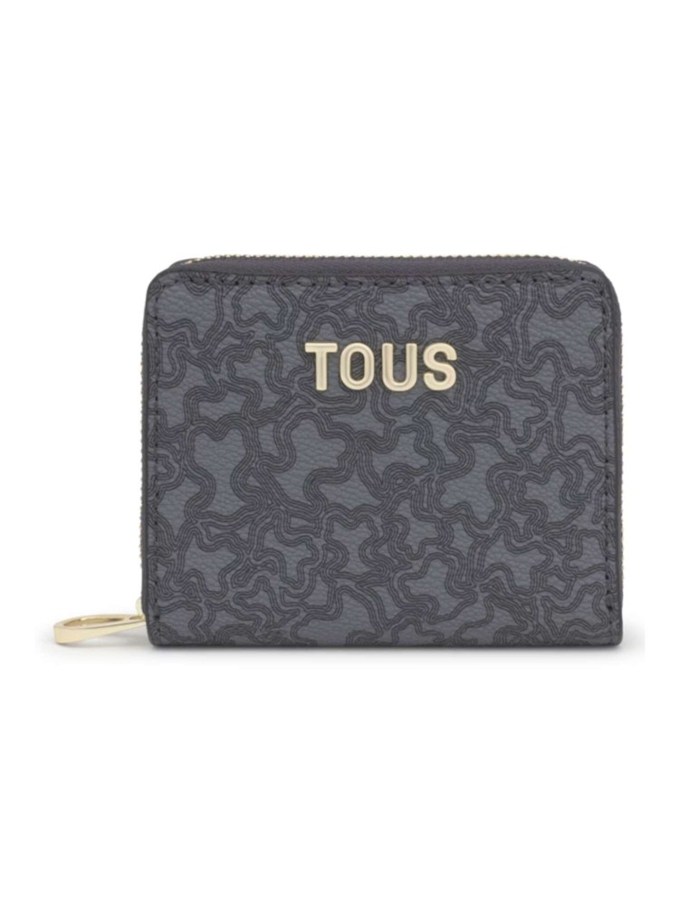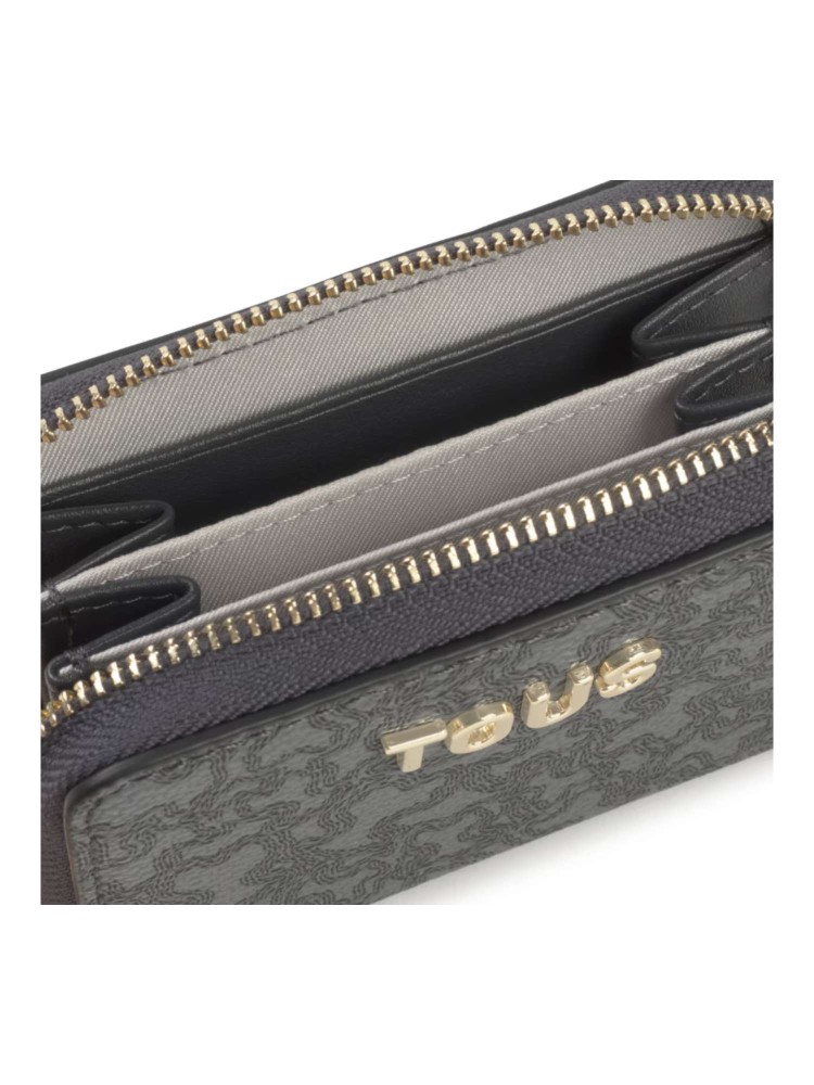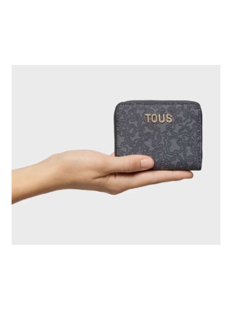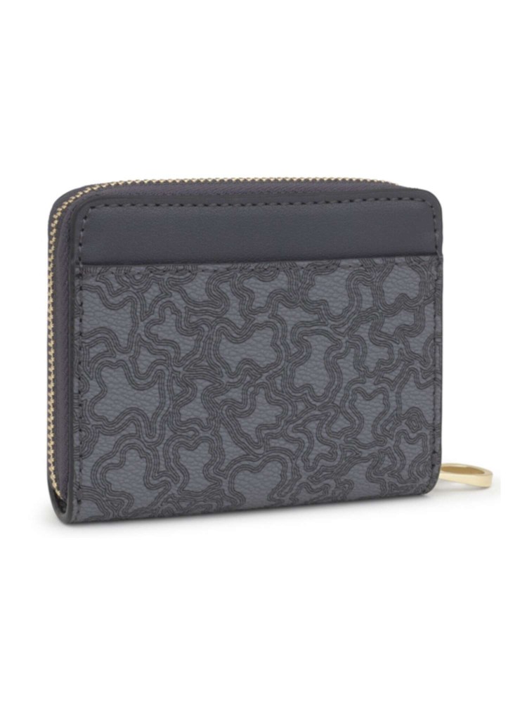 Monedero de lona con detalles de poliuretano en color gris. Interior con tres compartimentos abiertos para monedas y dos ranuras para tarjetas. Ranura exterior para tarjetas en la parte posterior. Medidas (alto x ancho x fondo): 8,5 x 10 x 2 cm.