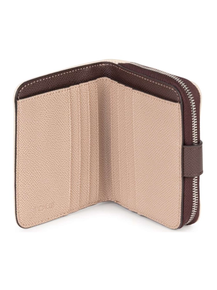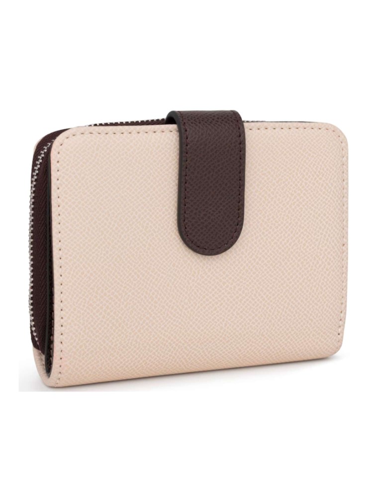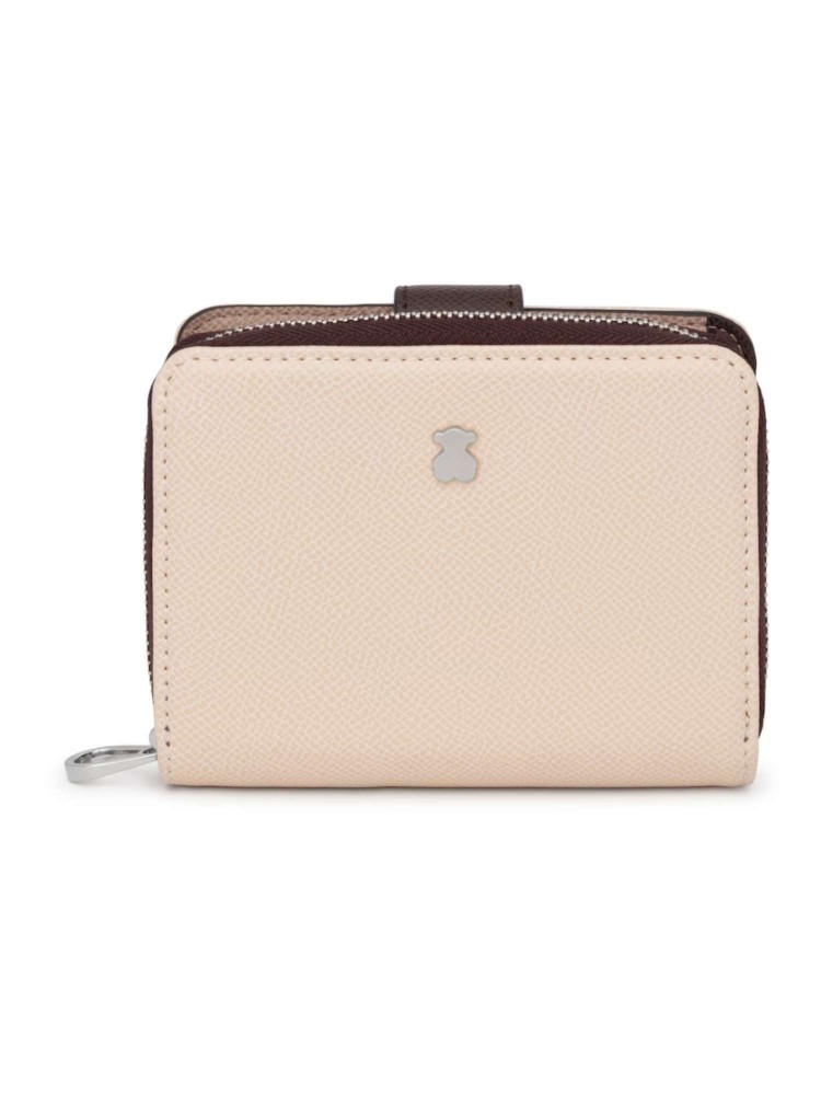 Cartera de poliuretano con efecto saffiano en colore beige. Cierre con botón a presión y cremallera. Dos compartimentos principales: uno con cremallera y otro para tarjetas. Medidas: 12 x 10 x 3 cm