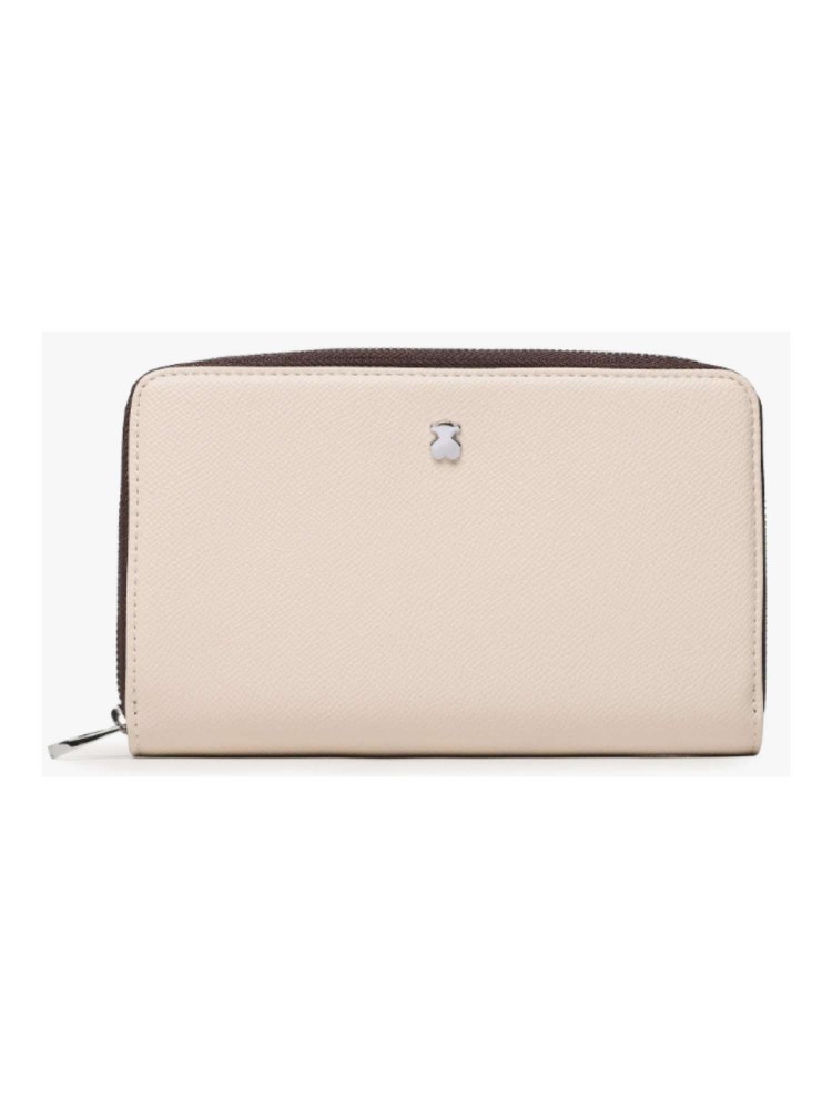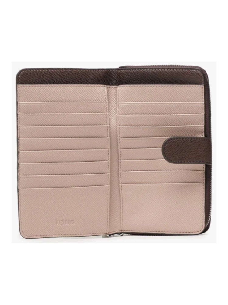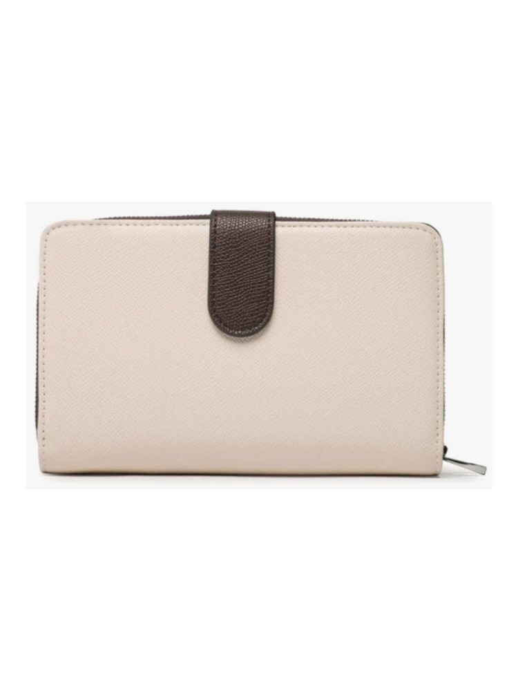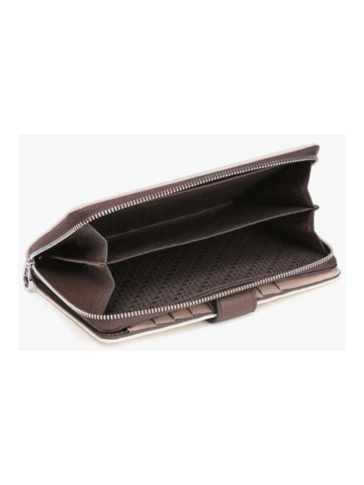Billetera mediana de poliuretano con efecto saffiano en colores marrón y beige. Cierre con botón a presión y cremallera. Dos compartimentos principales: uno con cremallera y otro para tarjetas. Medidas: 20 x 10 x 3 cm