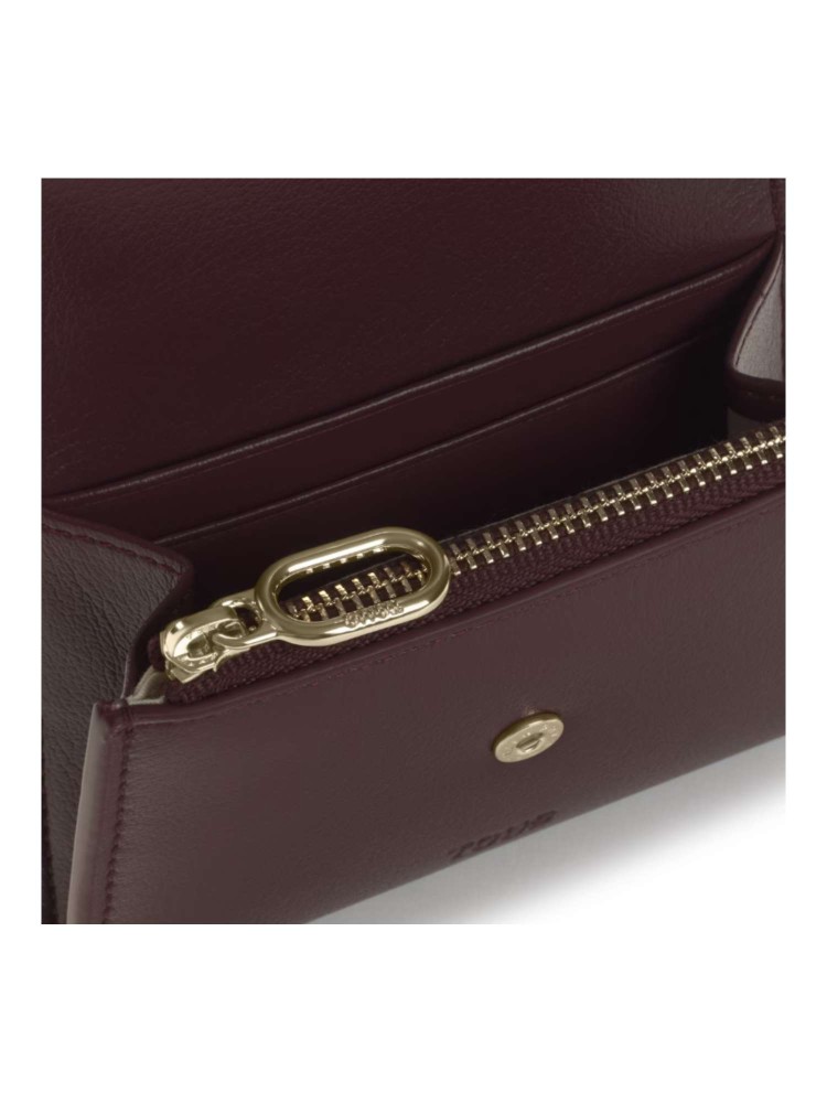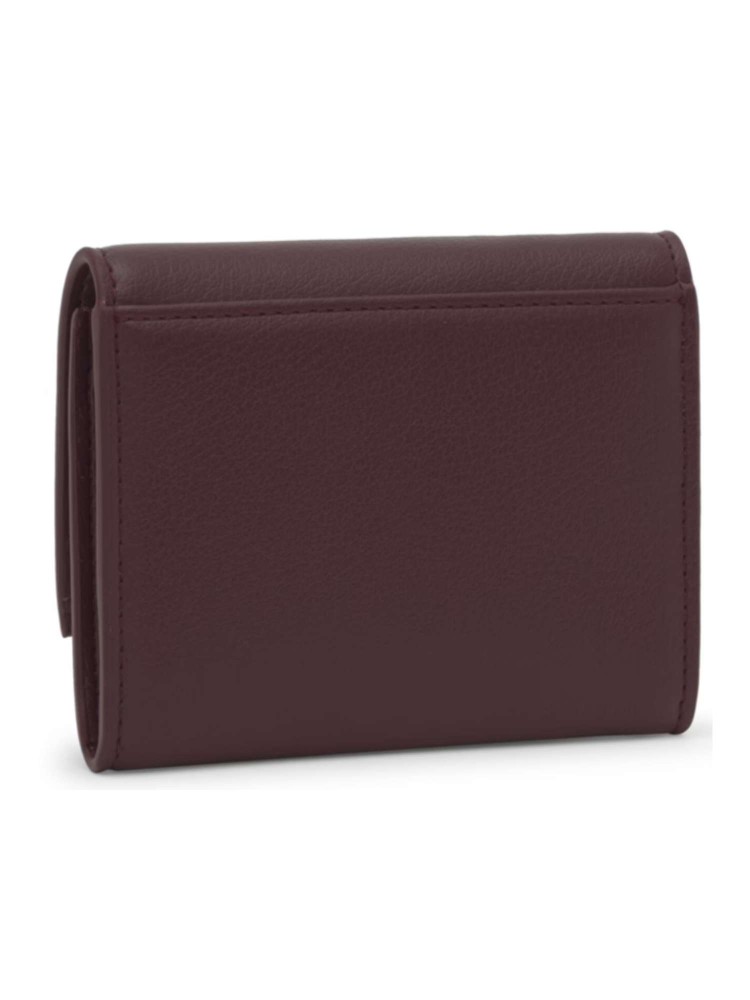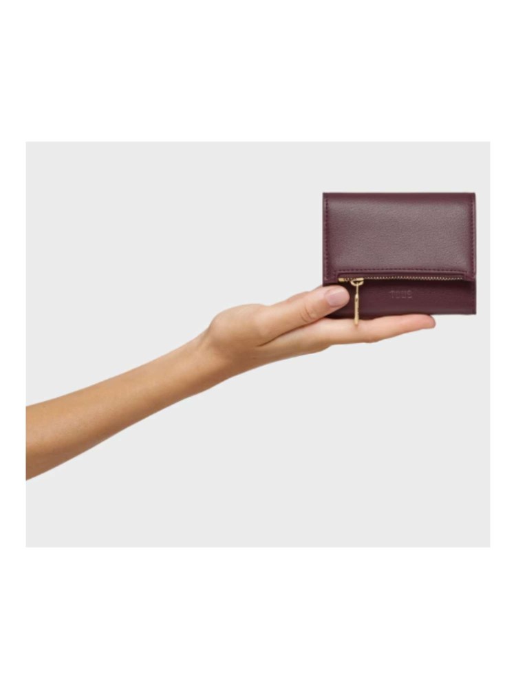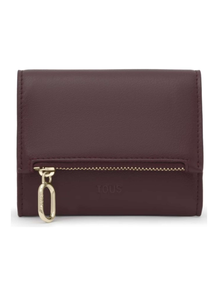 Cartera TOUS City de poliuretano en color burdeos. Cierre con botón a presión. Contiene un compartimento abierto y dos con cremallera. Medidas (alto x ancho x fondo): 11 x 8,5 x 2,5 cm