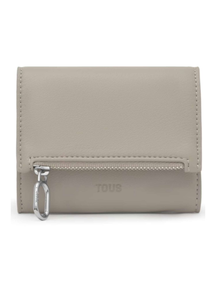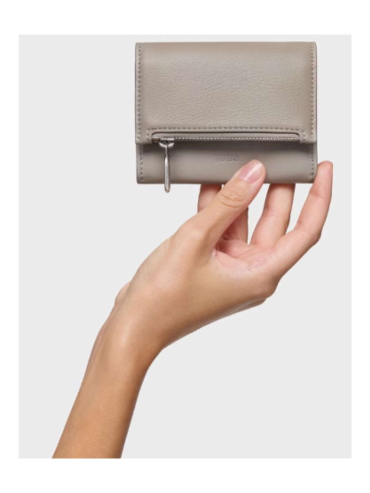 Cartera TOUS City de poliuretano en color topo. Cierre con botón a presión. Contiene un compartimento abierto y dos con cremallera. Medidas (alto x ancho x fondo): 11 x 8,5 x 2,5 cm