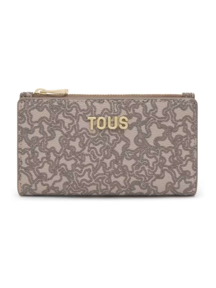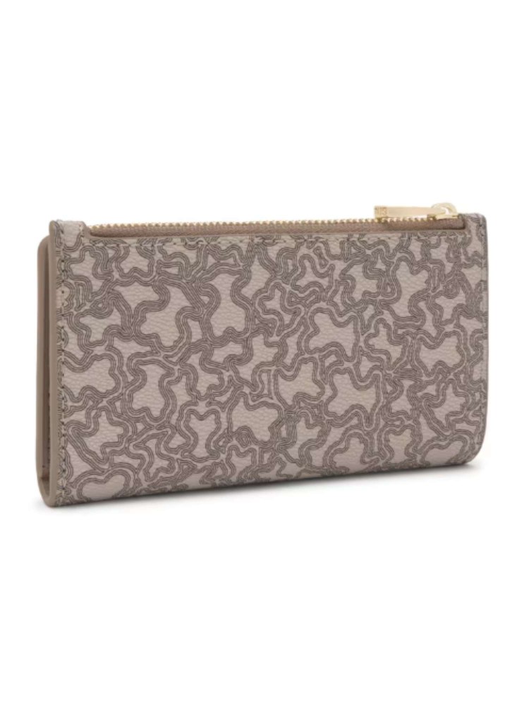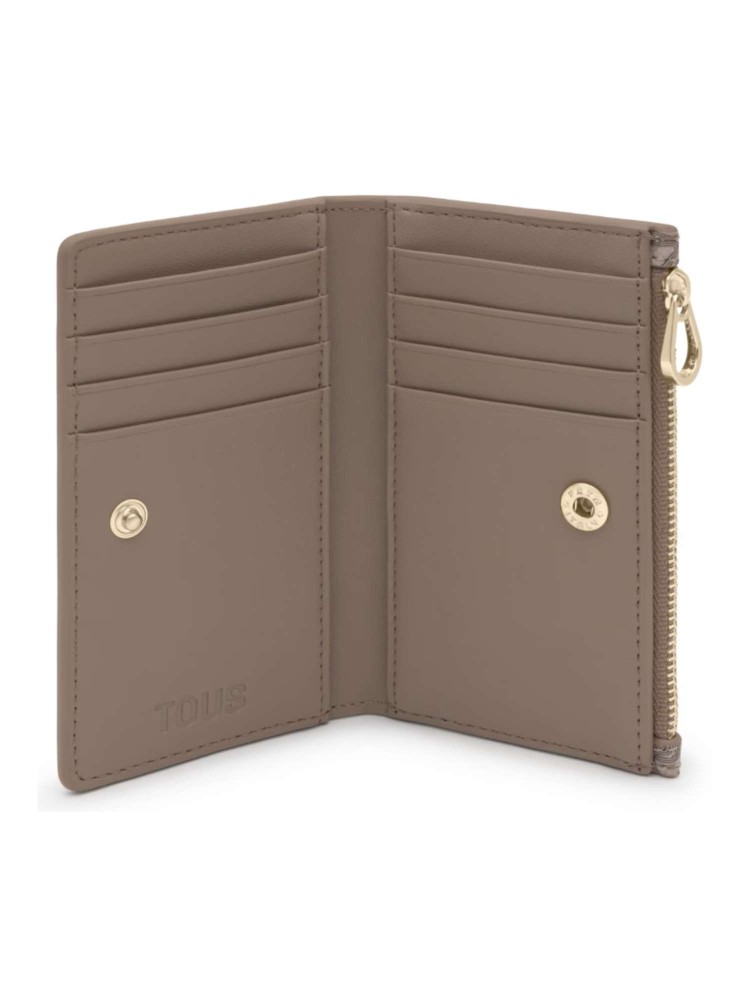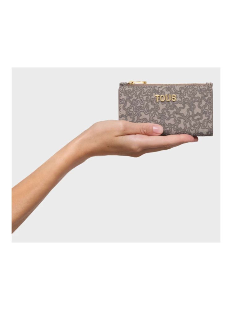 Cartera Kaos Mini Lines de lona en color topo. Cierre con botón a presión. Contiene seis ranuras para tarjetas, un compartimento para billetes y un bolsillo con cremallera para monedas. Medidas (alto x ancho x fondo): 8 x 14,2 x 1,5 cm.