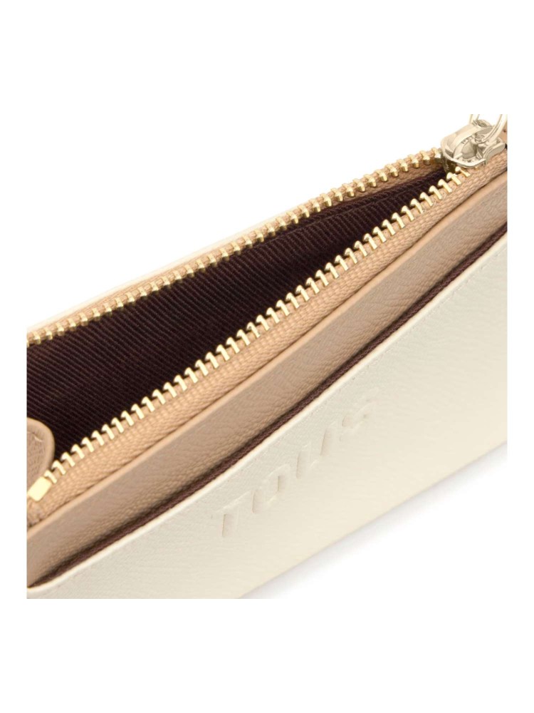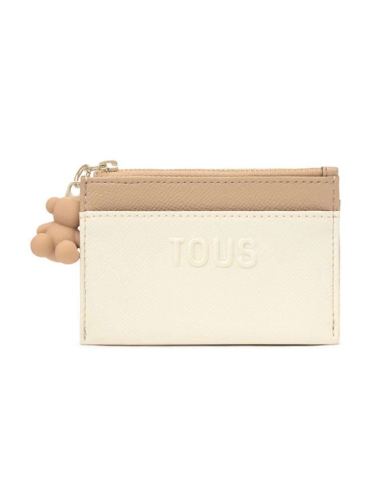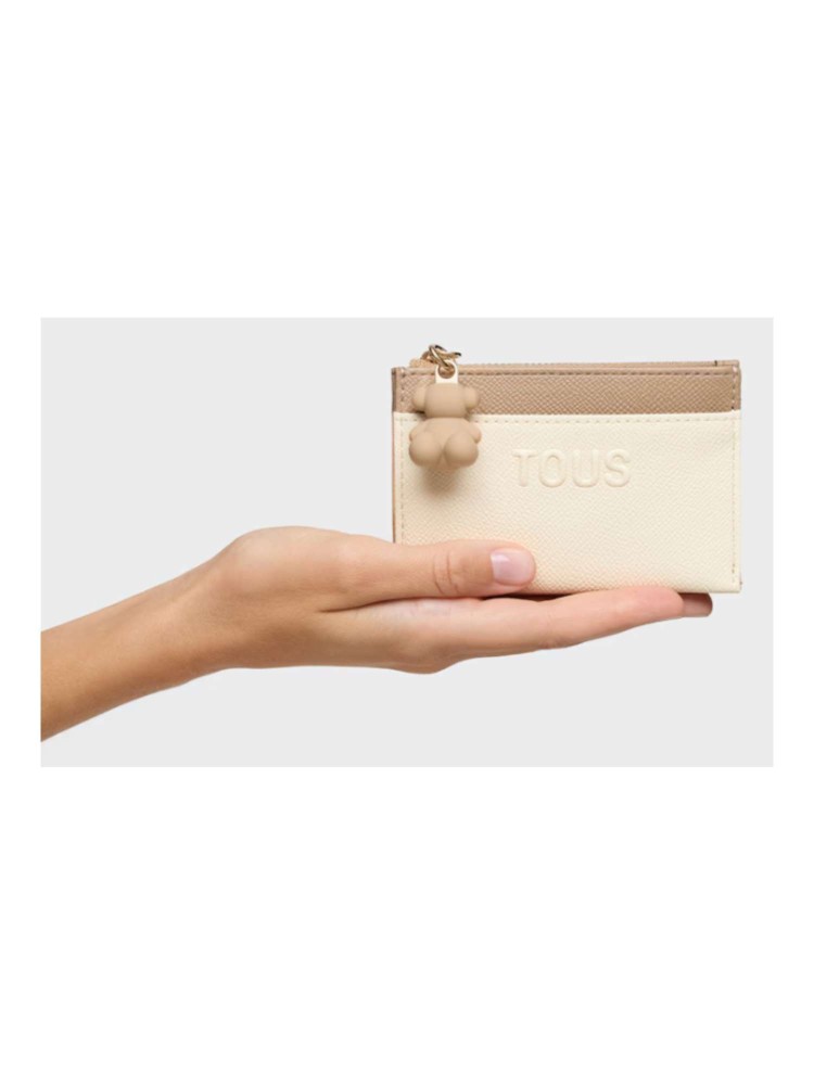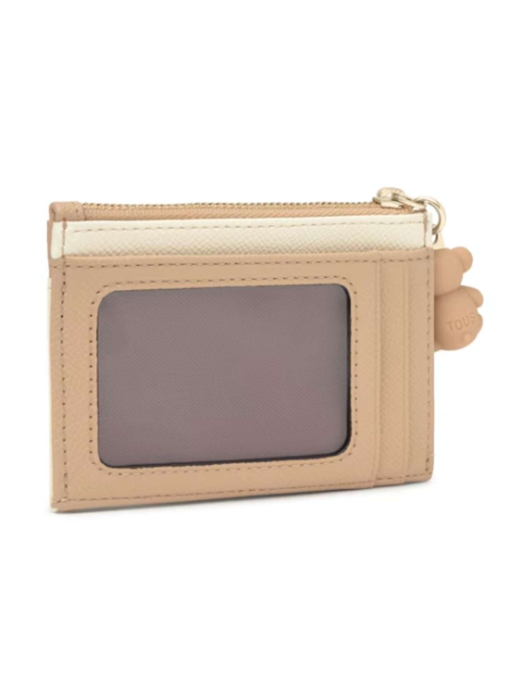 Monedero tarjetero Audree Saffiano de poliuretano en color beige y arena. Compartimento especial para monedas con cierre de cremallera. Ranuras para tarjetas, una de ellas transparente. Medidas (alto x ancho x fondo): 8 x 11,5 x 2 cm.