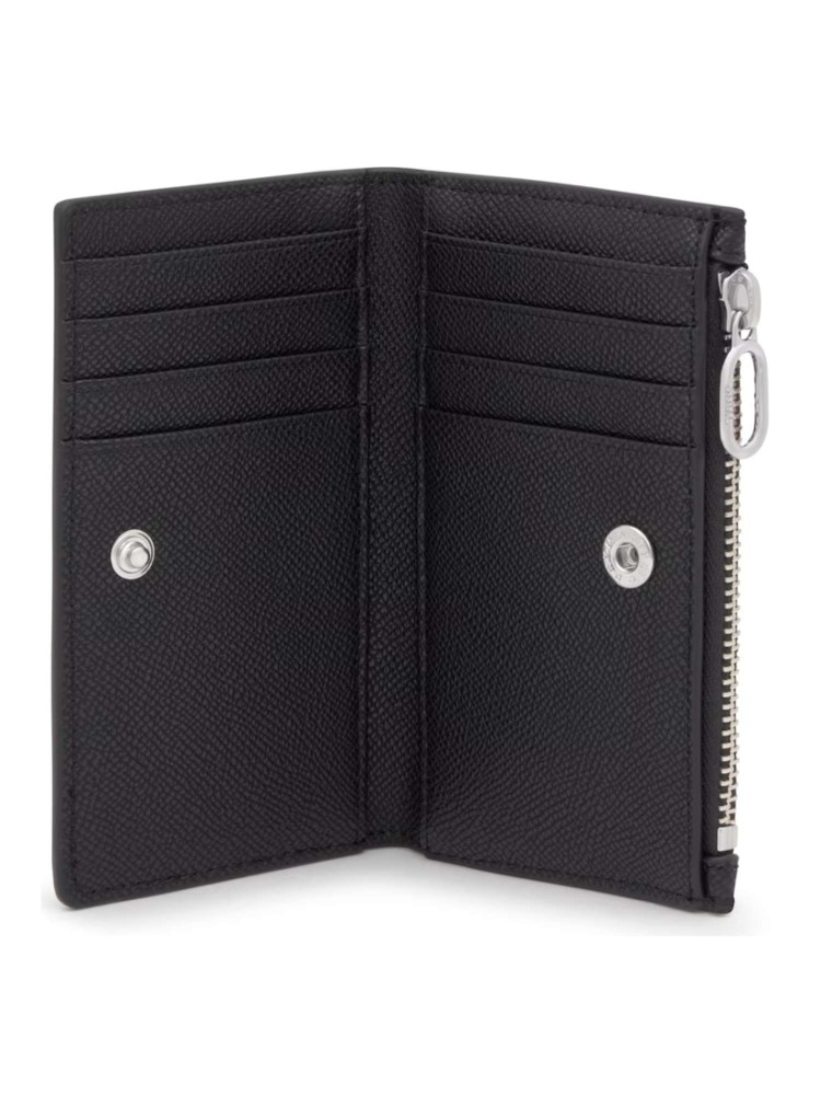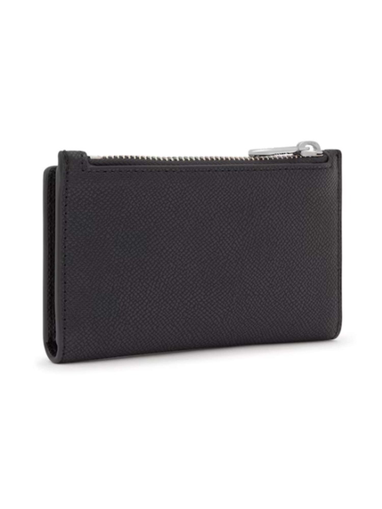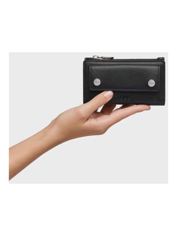 Cartera Audree Pockets de poliuretano en color negro. Cierre con botón a presión. Tiene un compartimento para monedas con cierre de cremallera. Ranuras para tarjetas y dos espacios para billetes. Medidas (alto x ancho x fondo): 8,5 x 14 x 3,5 cm.