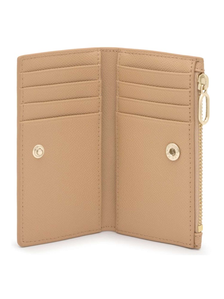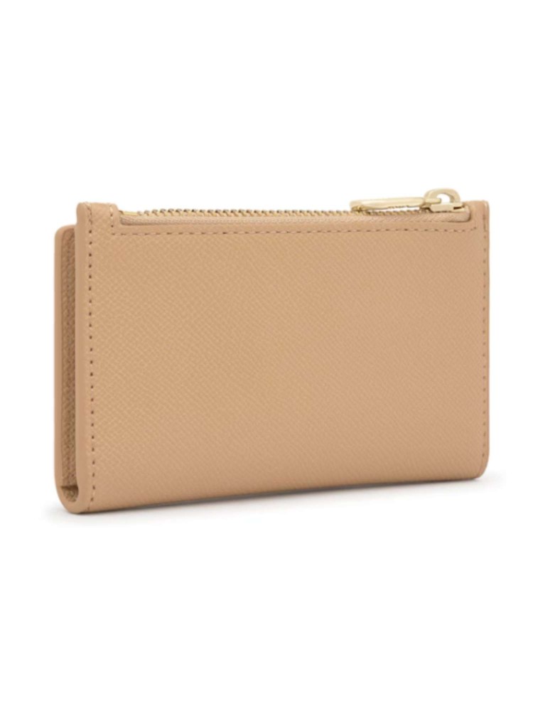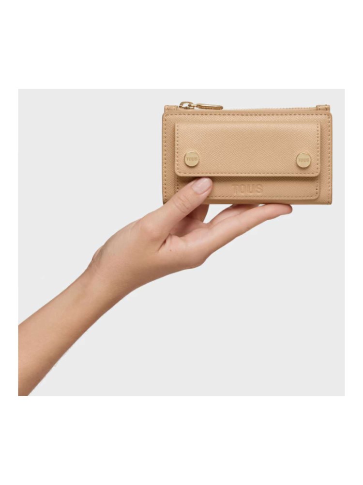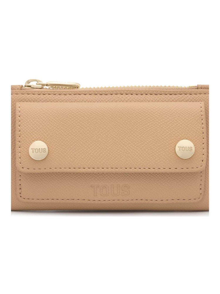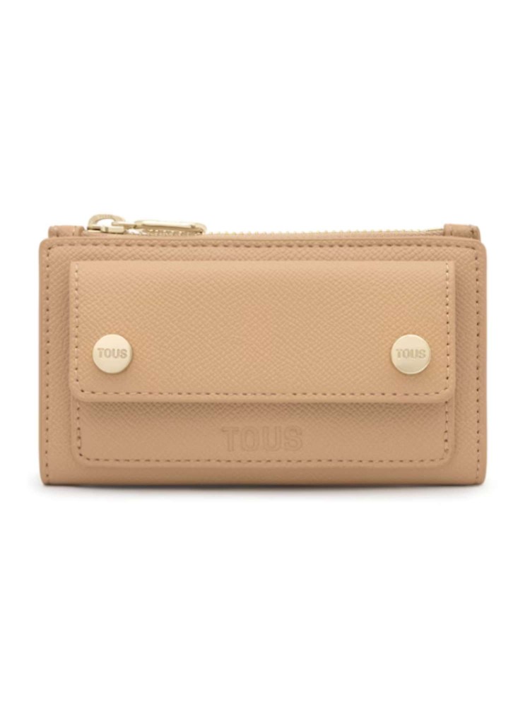 Cartera Audree Pockets de poliuretano en color arena. Cierre con botón a presión. Tiene un compartimento para monedas con cierre de cremallera. Ranuras para tarjetas y dos espacios para billetes. Medidas (alto x ancho x fondo): 8,5 x 14 x 3,5 cm.