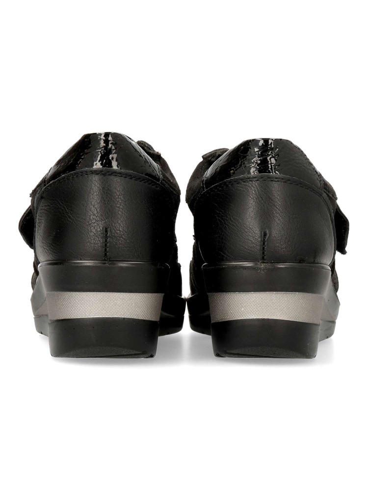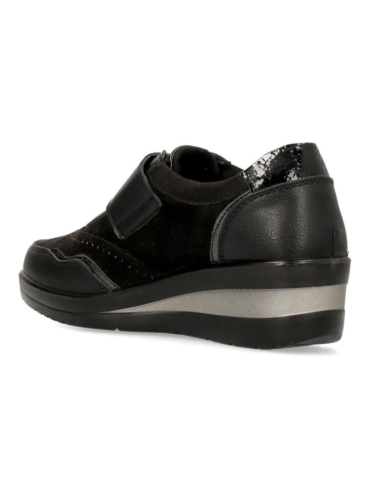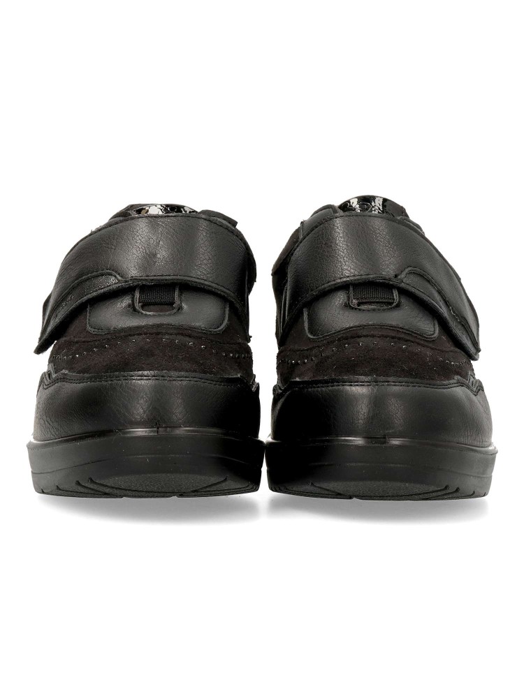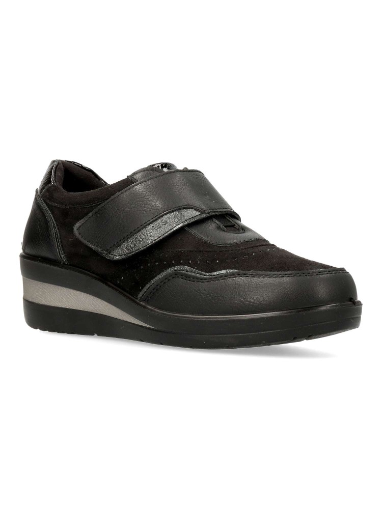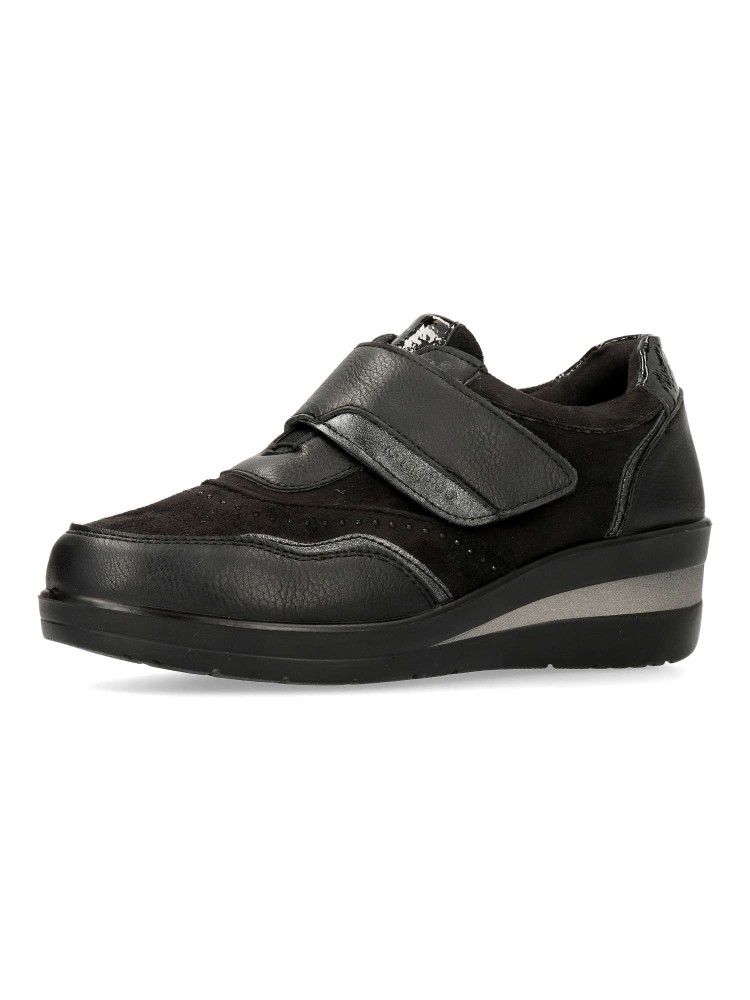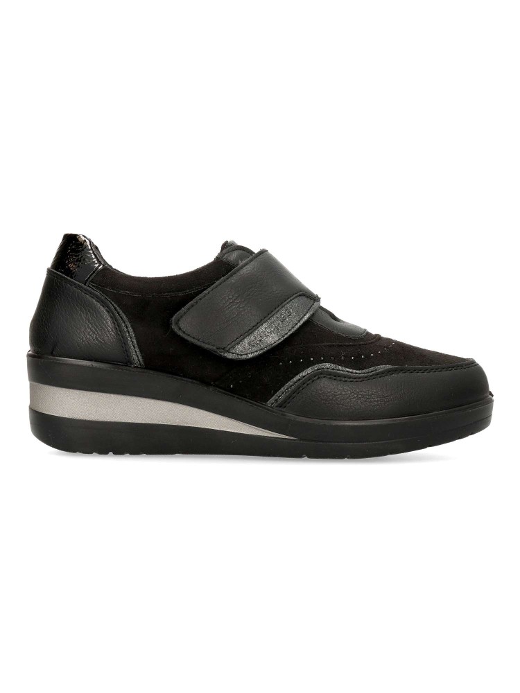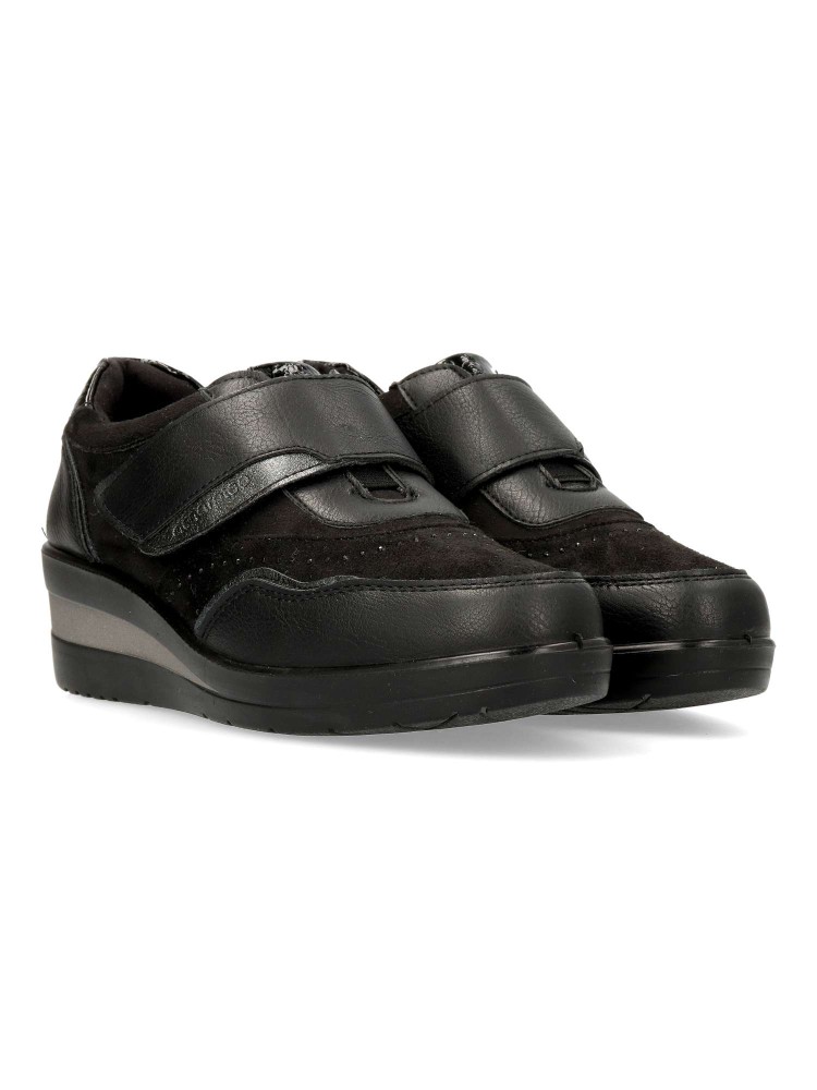 Zapato cómodo de mujer, con cierre de tira adherente. Fabricado en piel sintética suave, con suela de goma ligera y flexible. Plantilla acolchada y extraíble. Altura cuña 4,5cm. Color negro. Amarpies, diseño versátil y confort a lo grande.