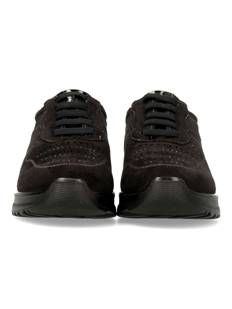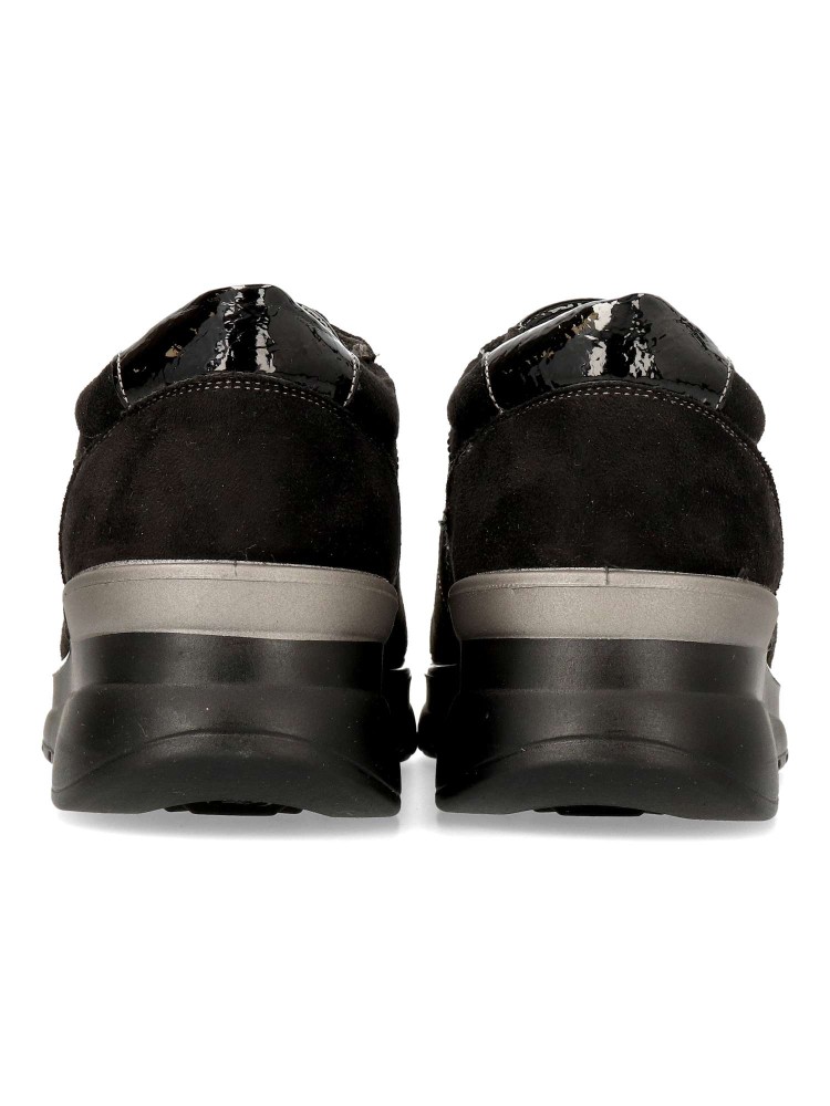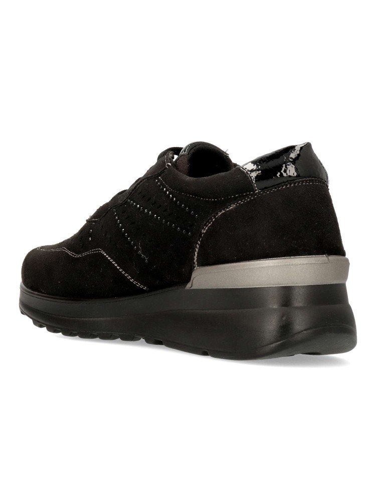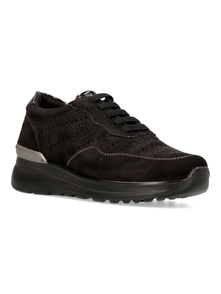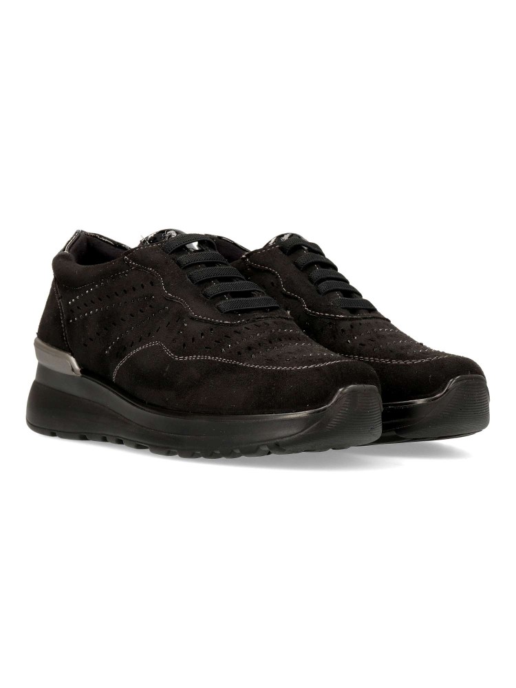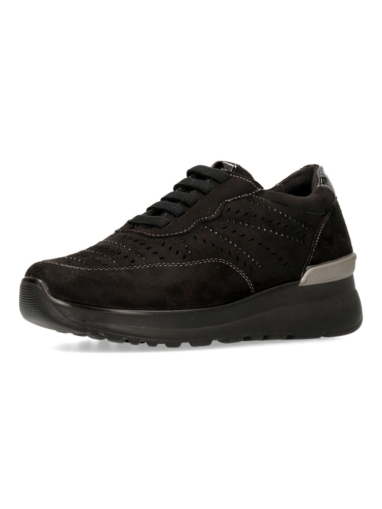 Zapato de mujer con cordones elásticos. Fabricado en material sintético con suela de goma. Modelo que ofrece comodidad, ligereza y flexibilidad. Plantilla acolchada y extraíble Memory Sponge. Pequeña cuña de 4 cm. Color negro. Confort a lo grande.