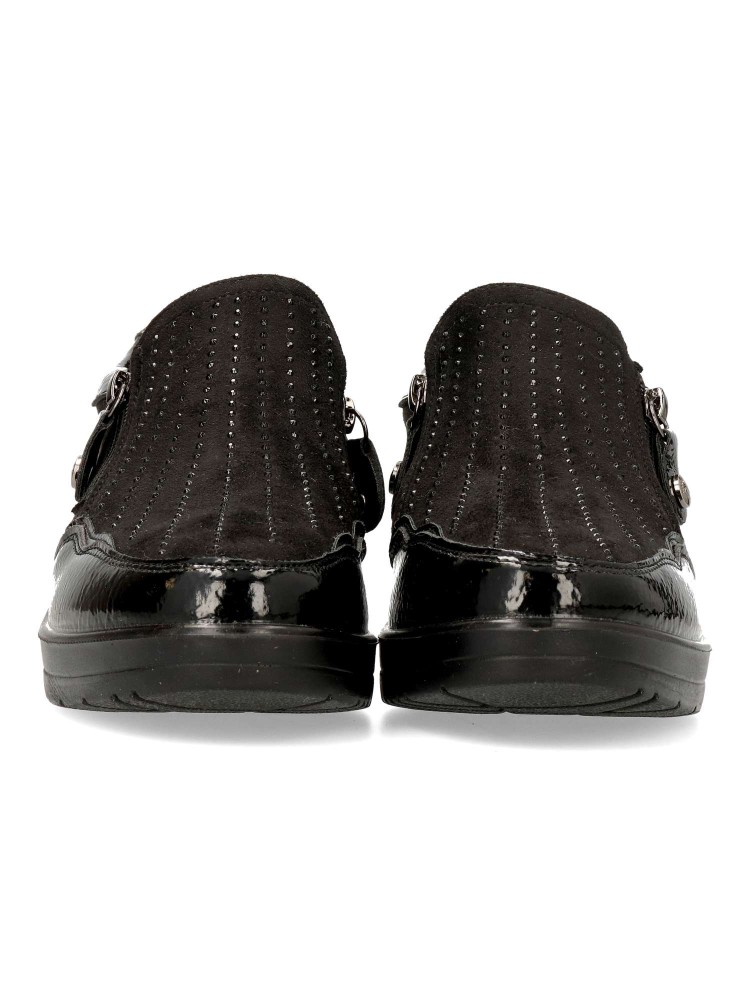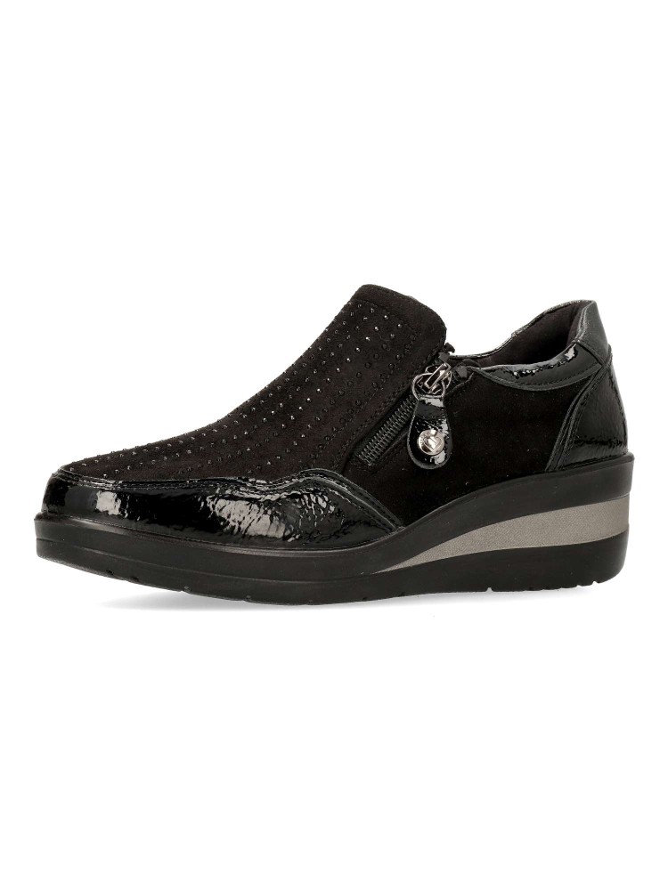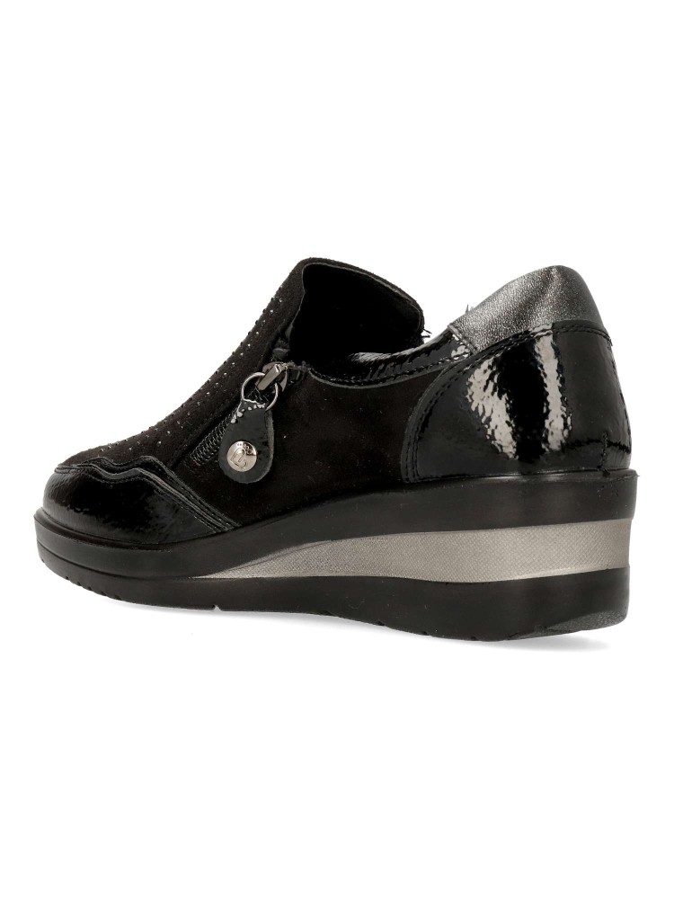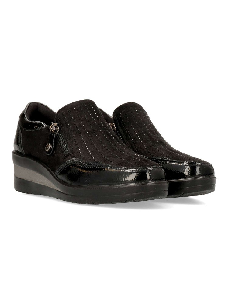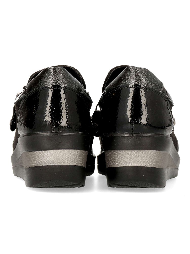 Zapato cómodo de mujer, con cierre de cremalleras laterales. Fabricado en piel sintética antelina y charol, con suela de goma ligera y flexible. Plantilla acolchada y extraíble. Altura cuña 4,5cm. Color negro. Amarpies, diseño y confort para tu día a día.