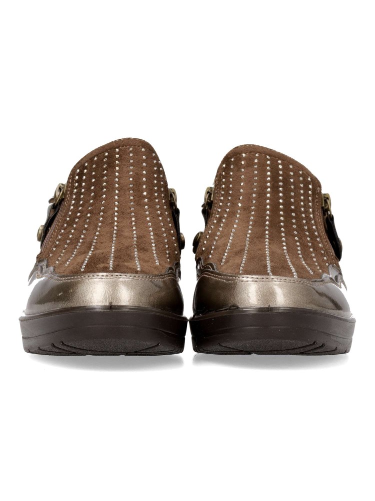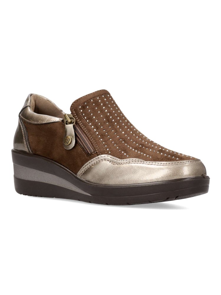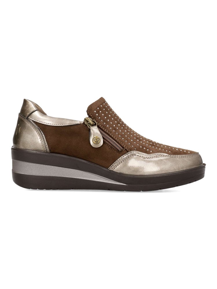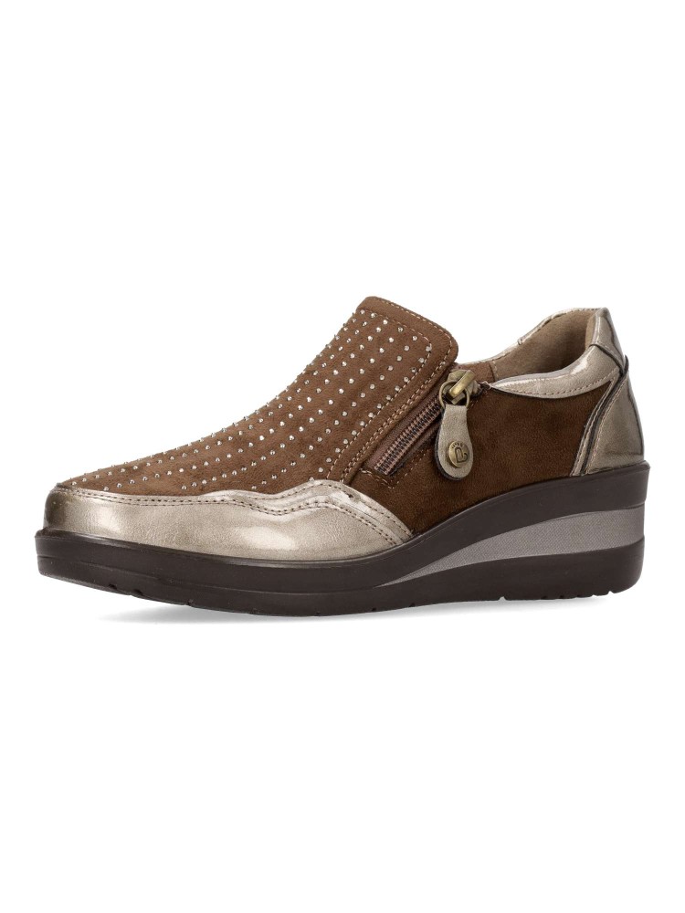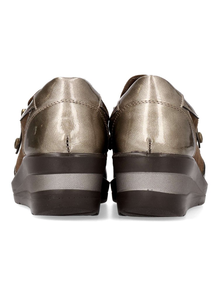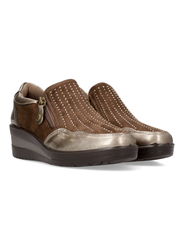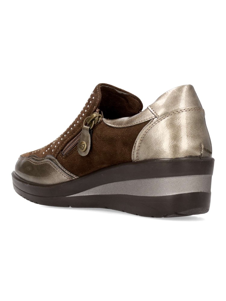 Zapato cómodo de mujer, con cierre de cremalleras laterales. Fabricado en piel sintética antelina y charol, con suela de goma ligera y flexible. Plantilla acolchada y extraíble. Altura cuña 4,5cm. Color taupe. Amarpies, diseño y confort para tu día a día.
