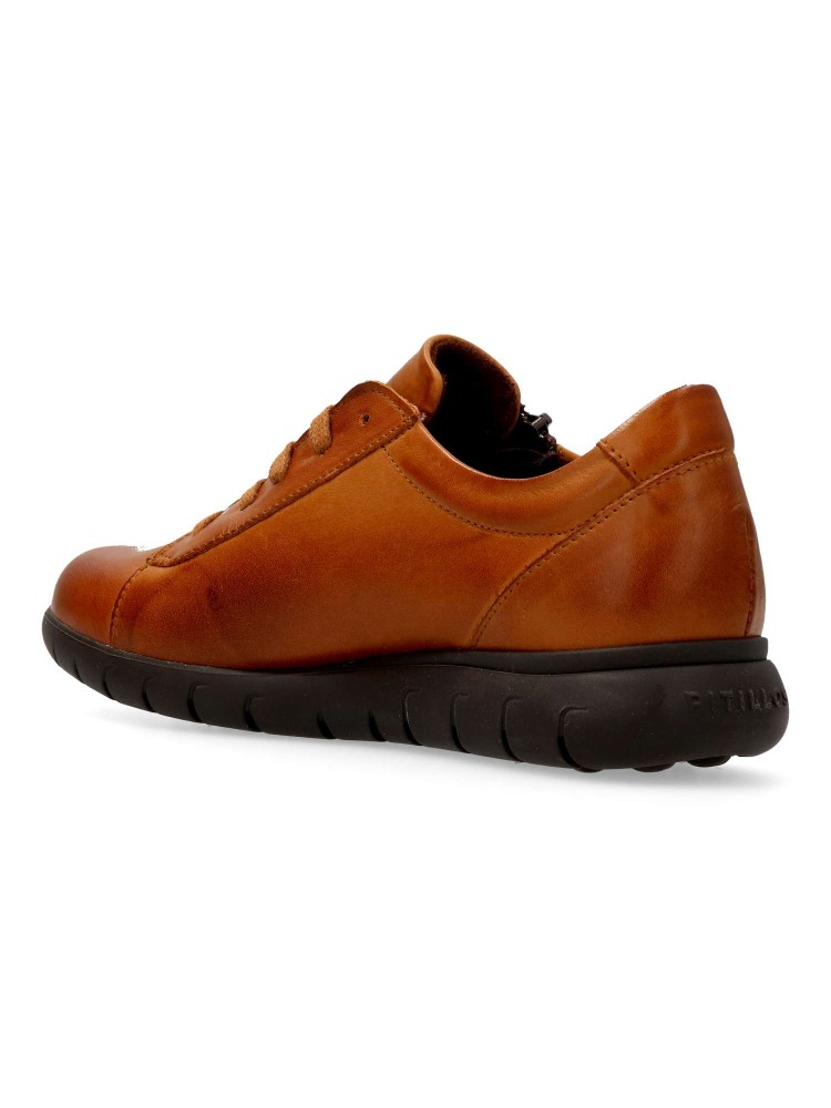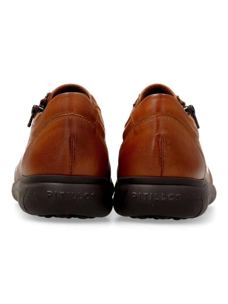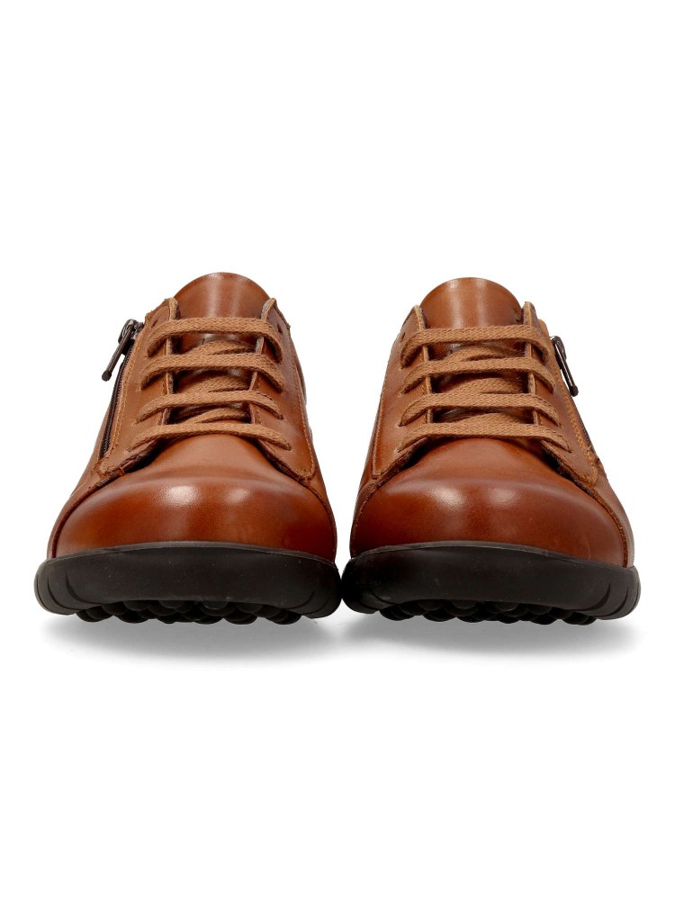Zapato cómodo de mujer, estilo casual. Cierre de cremallera y cordones. Fabricado en piel, con suela de goma flexible. Plantilla acolchada y extraíble. Color cuero. Combinan calidad, confort y bienestar. Hecho en España.
