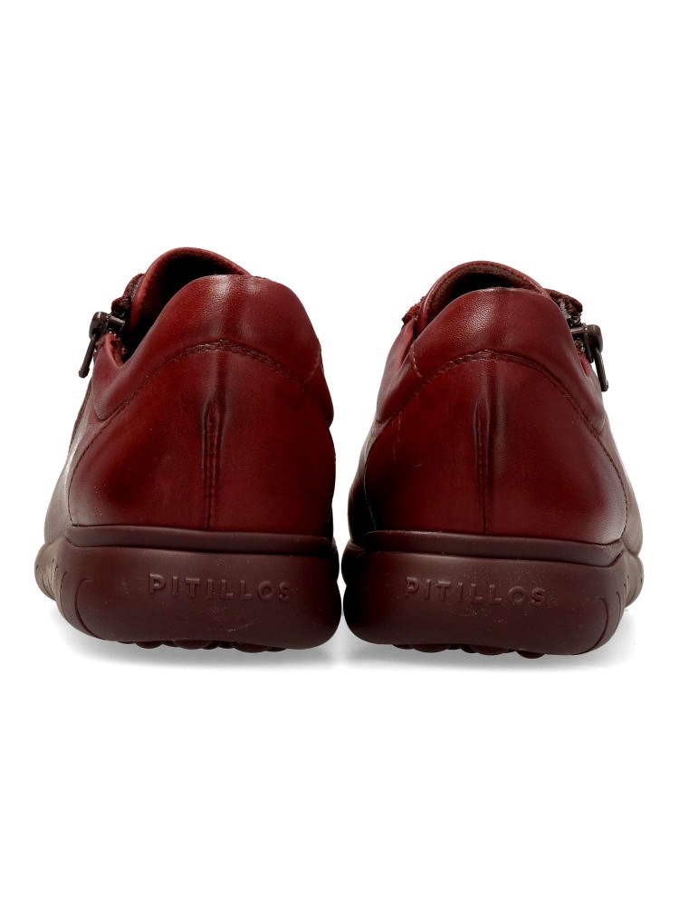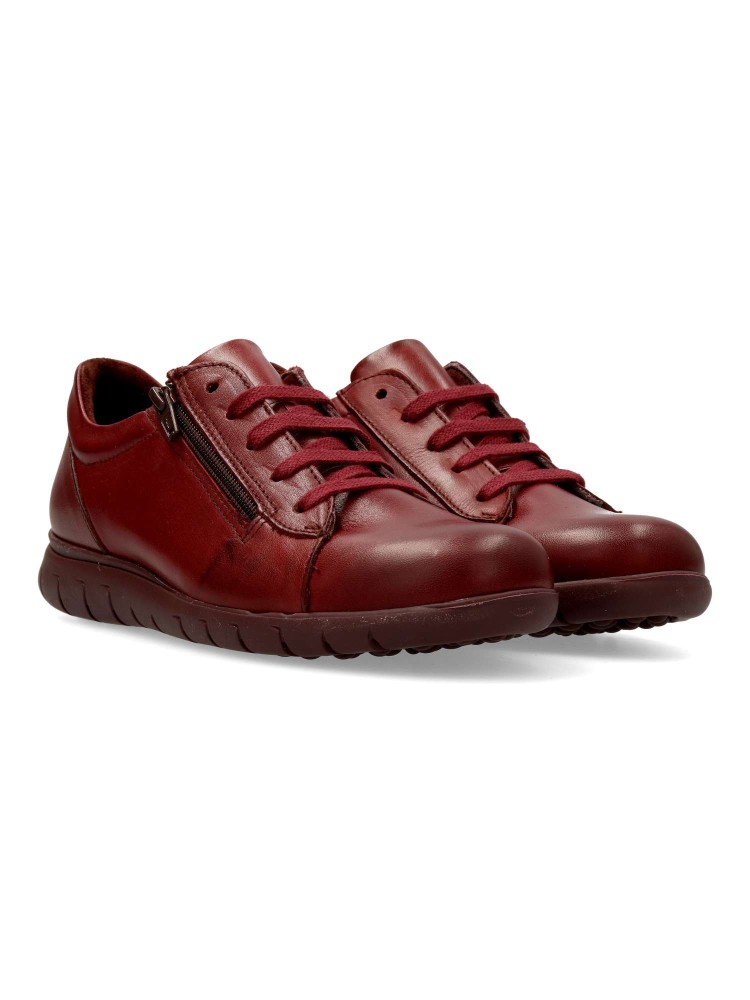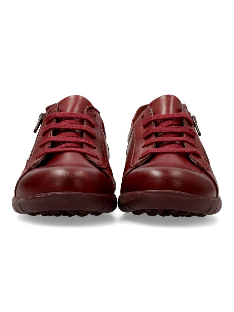Zapato cómodo de mujer, estilo casual. Cierre de cremallera y cordones. Fabricado en piel, con suela de goma flexible. Plantilla acolchada y extraíble. Color burdeos. Combinan calidad, confort y bienestar. Hecho en España.