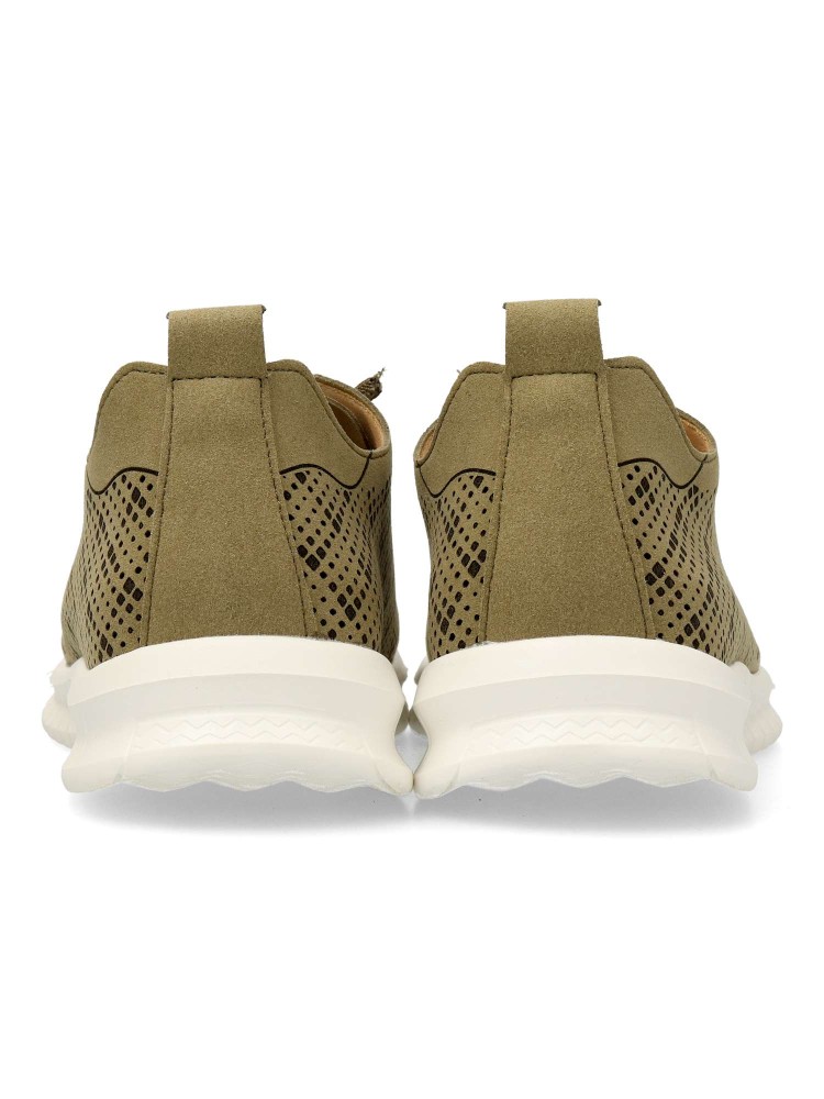 Zapato deportivo estilo casual de mujer. Cierre de cordones elásticos. Sneakers cónfort, fabricado en piel sintética troquelada. Suela de goma ligera y flexible. Color kaki. Deportiva transpirable, cómoda, ligera y flexible, que no te querras quitar.