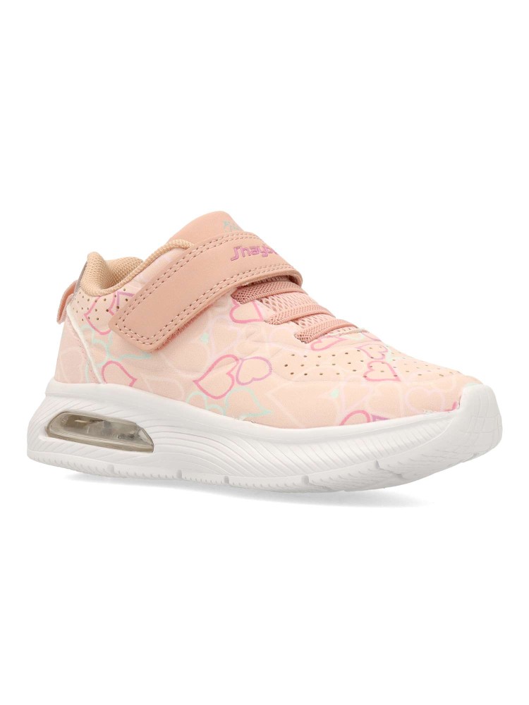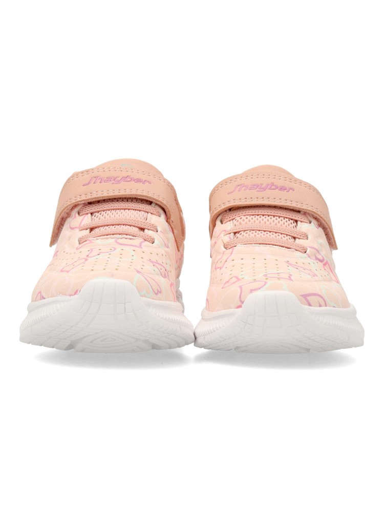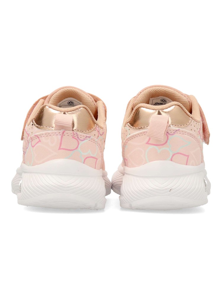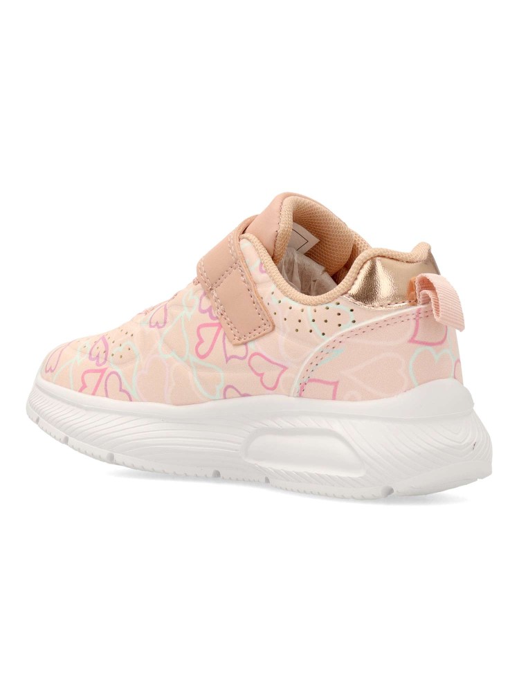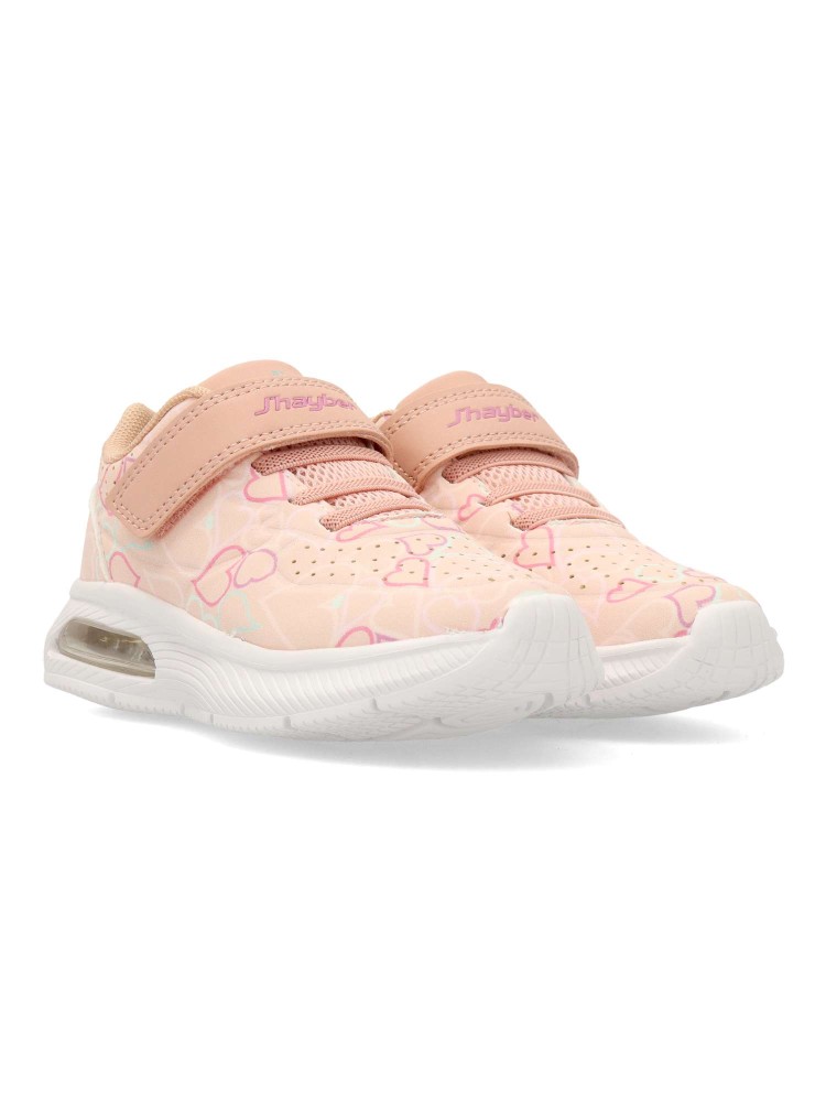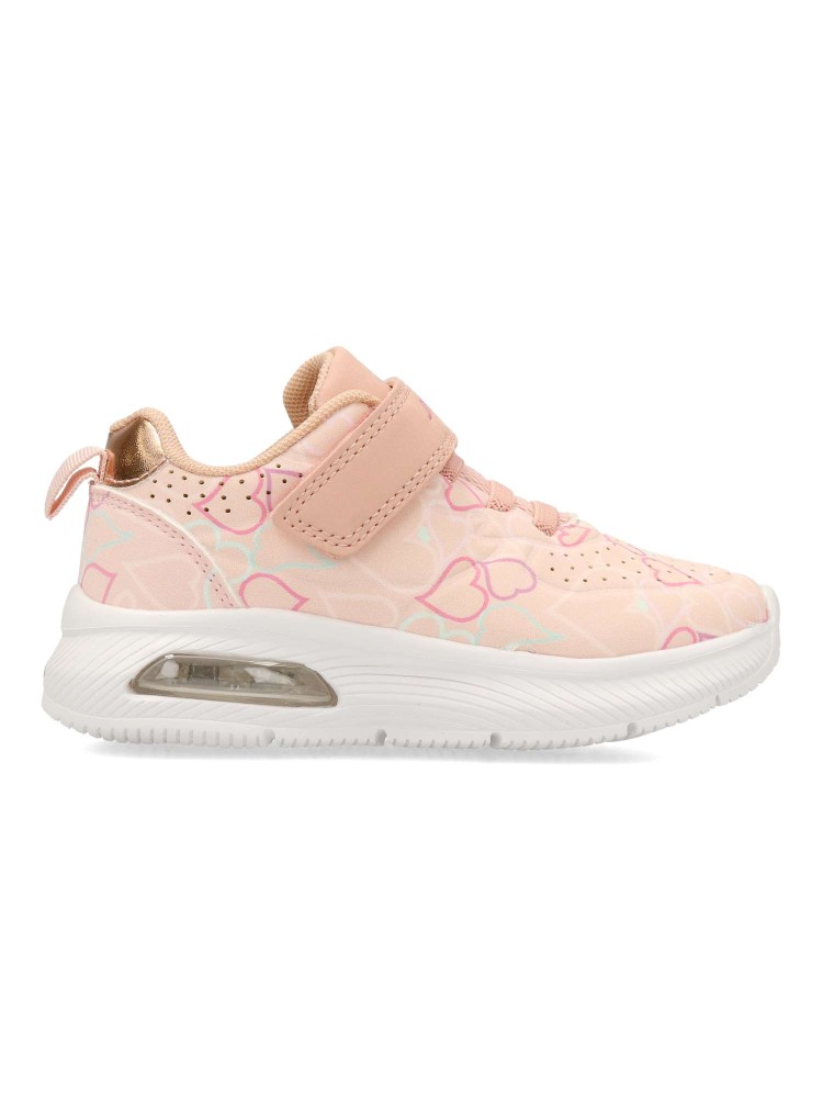 Zapatilla de niña estilo casual, que destacan por su diseño alegre con estampado de corazones en tonos pastel. Camara de aire en la suela. Ideales para el día a día, ofrecen comodidad y ajuste seguro gracias a su cierre adherente y cordones elásticos.