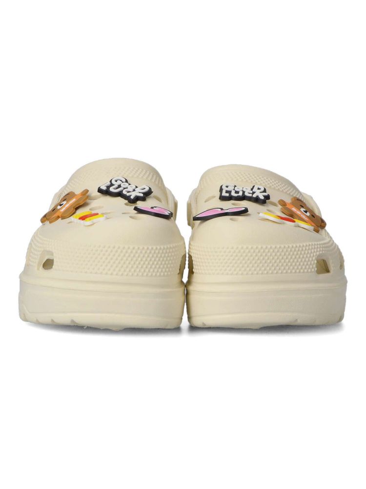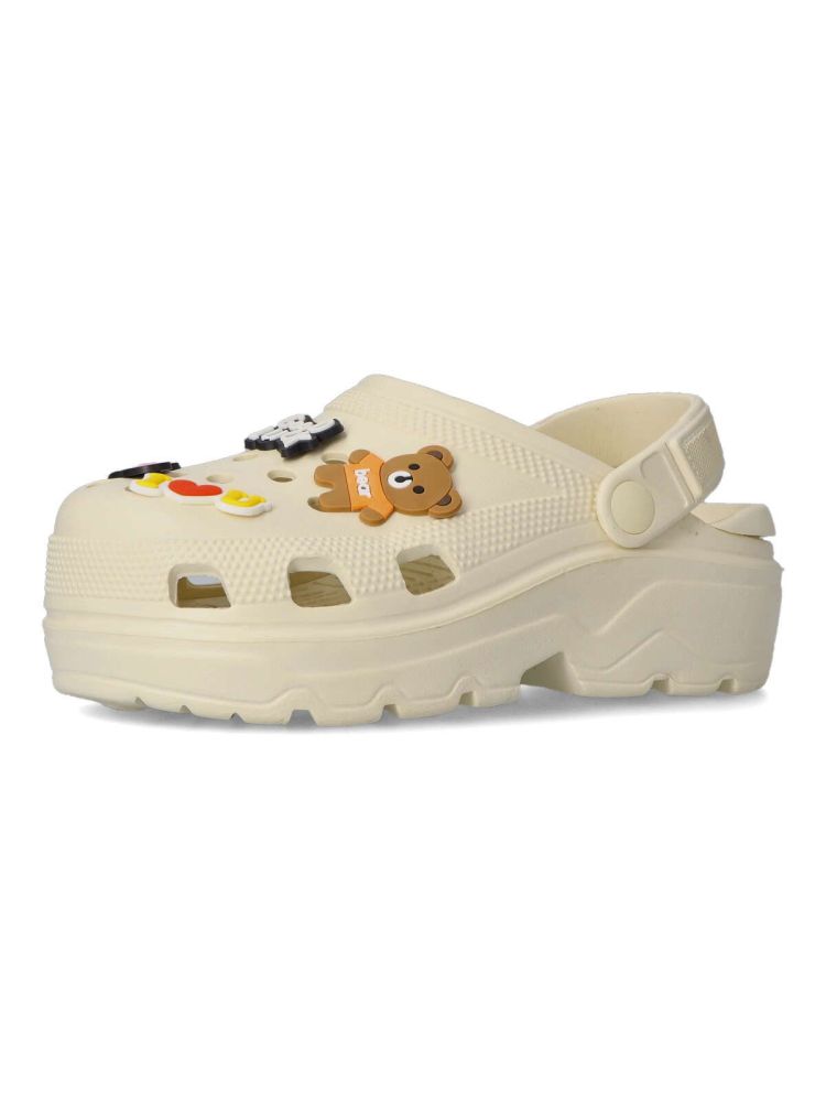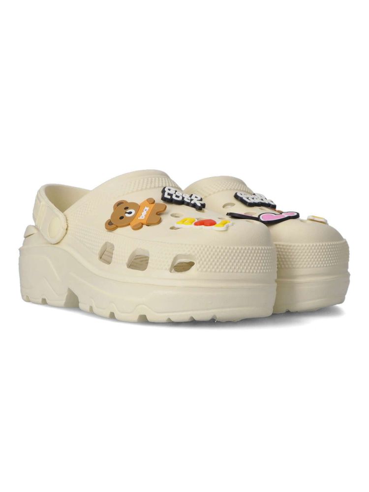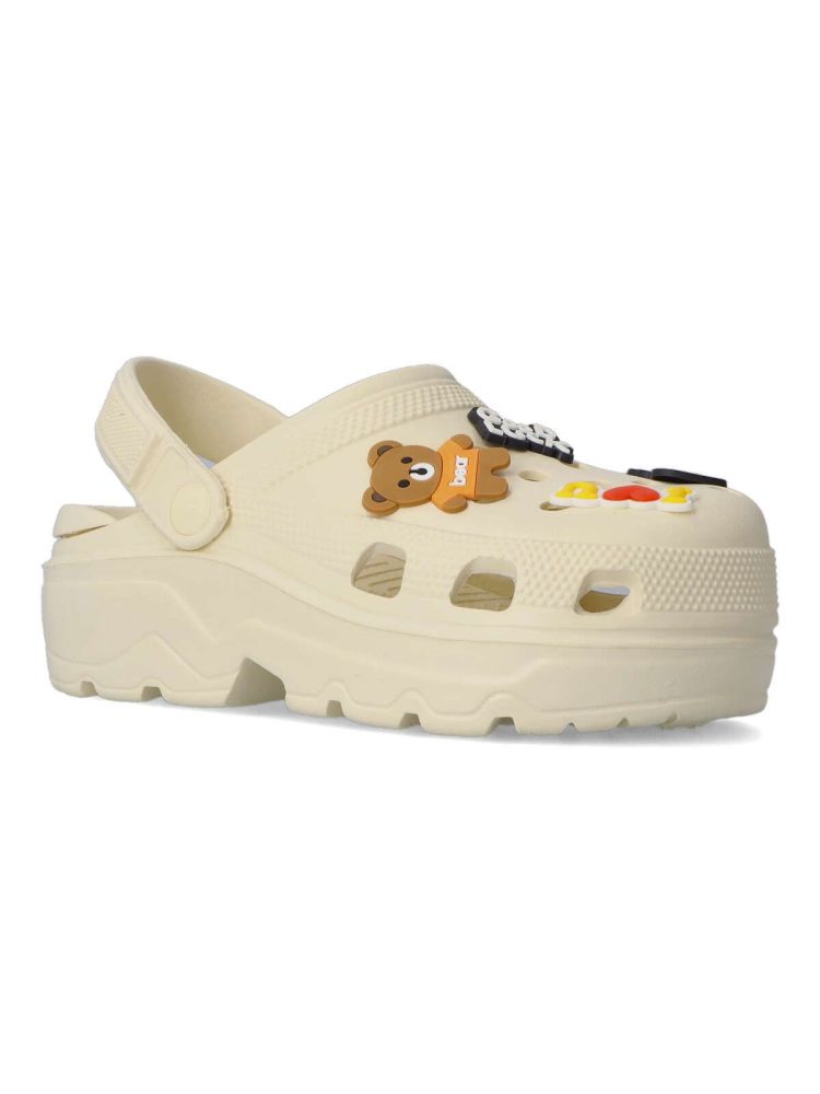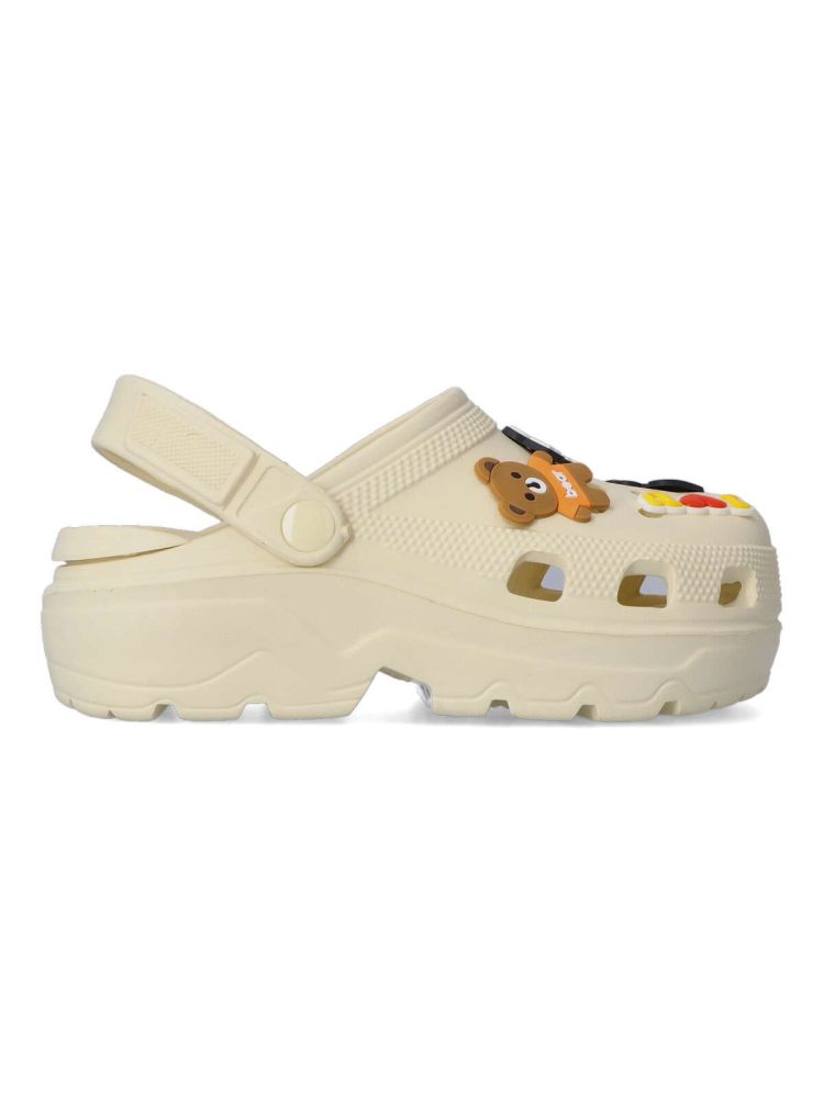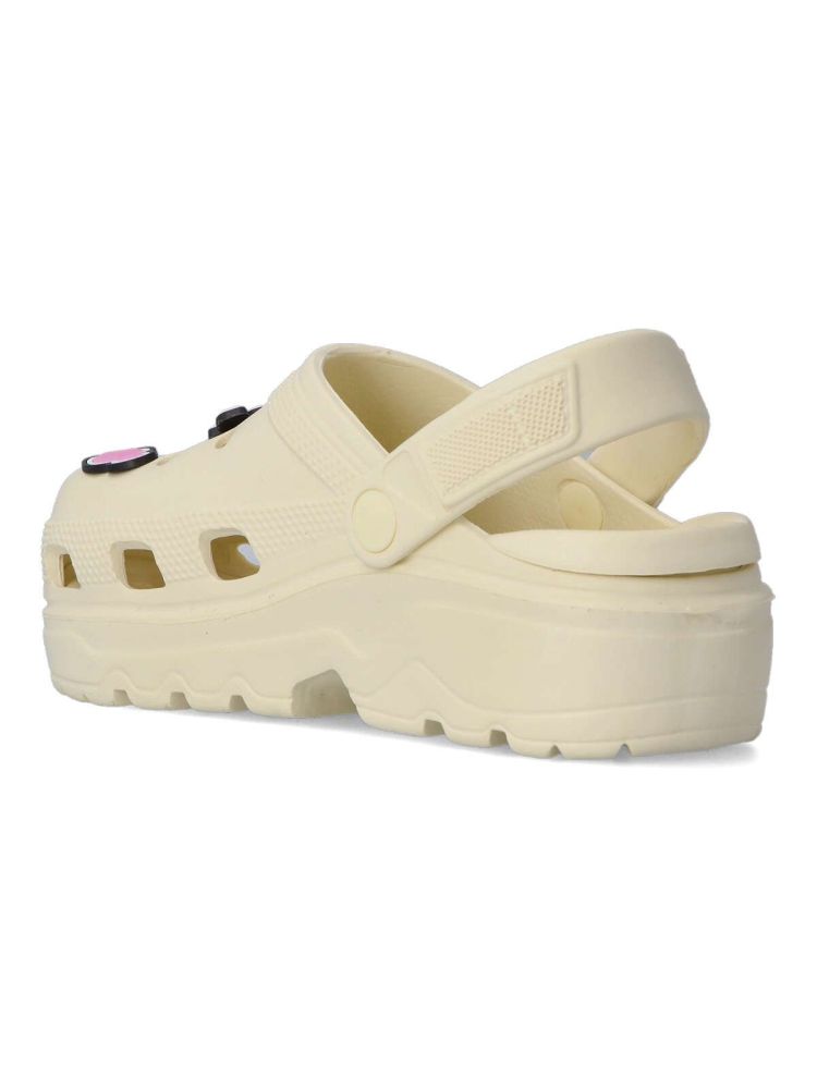 Chancla zueco de goma para mujer. Stickers decorativos. Fabricado en goma EVA. Tira trasera para una mejor sujeción del pie. Disponible en color beige. Modelo cómodo, ligero, fresco y transpirable, ideal para la playa y para tus paseos de verano.