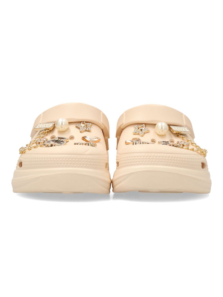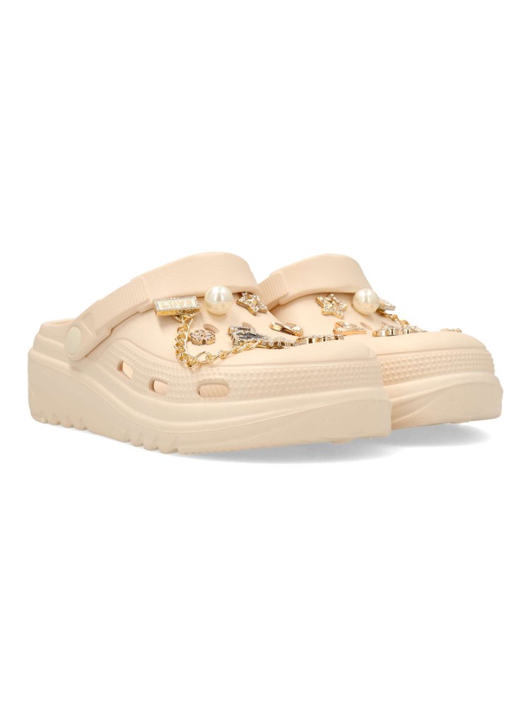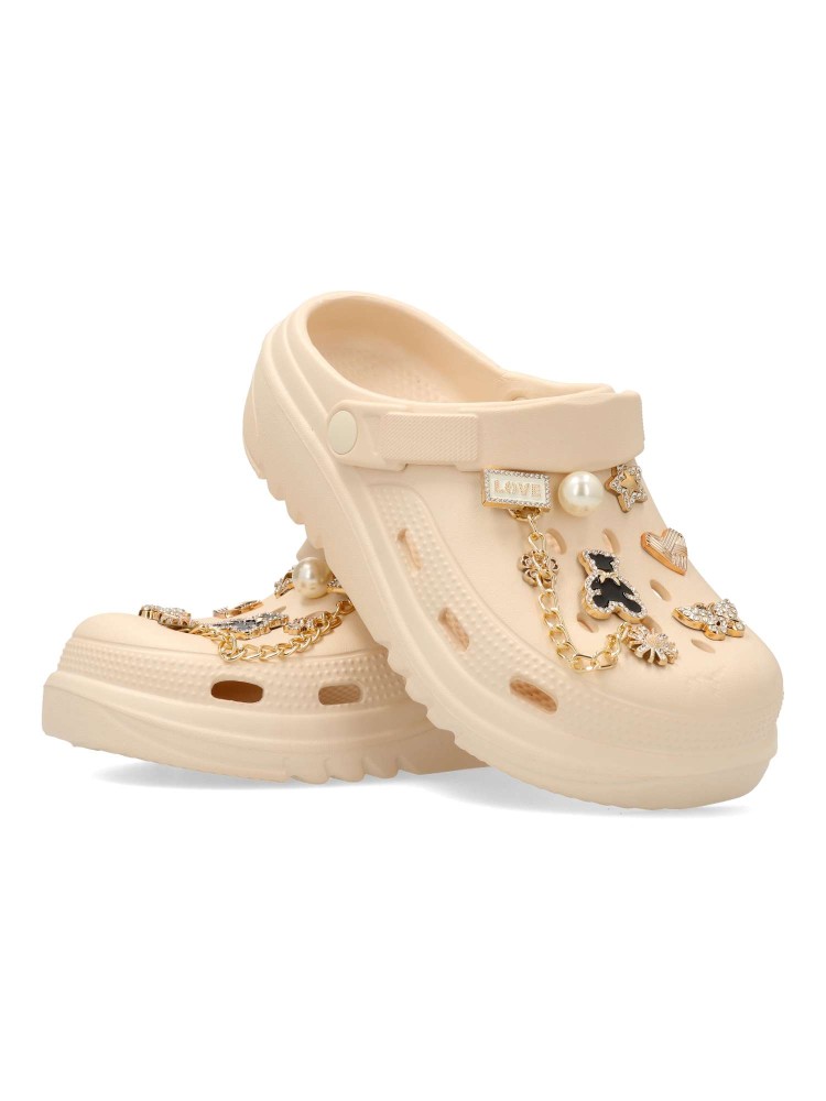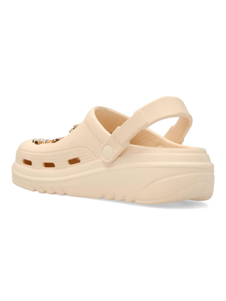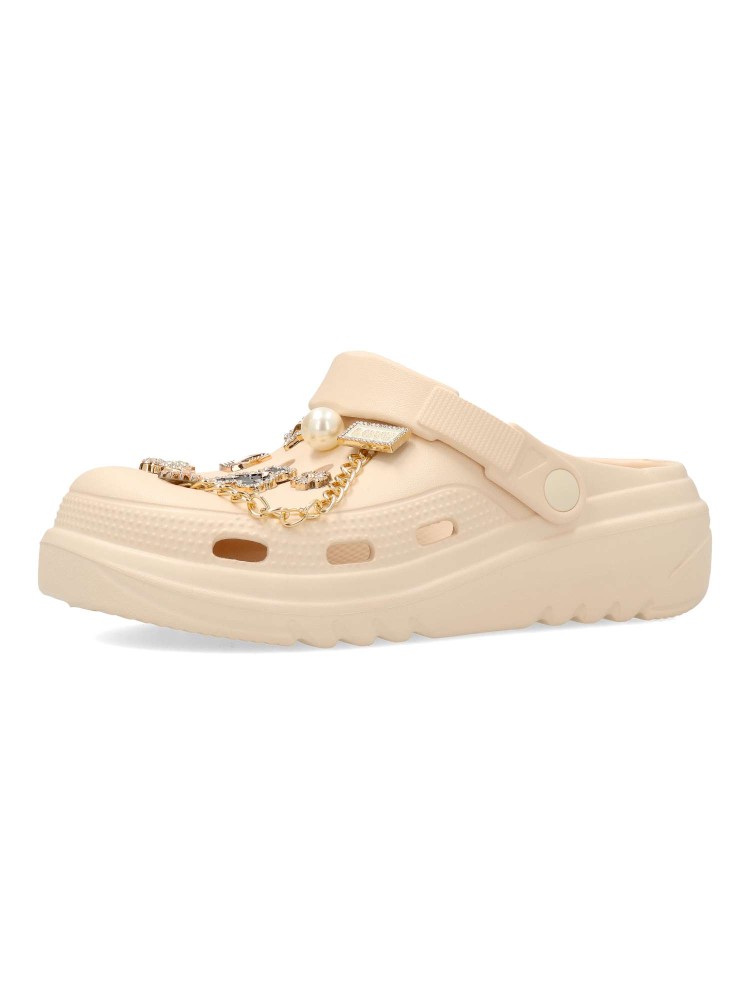 Chancla zueco de goma para mujer. Stickers metalizados decorativos. Fabricado en goma EVA. Tira trasera para una mejor sujeción del pie. Color beige. Modelo cómodo, ligero, fresco y transpirable, ideal para la playa y para tus paseos de verano.
